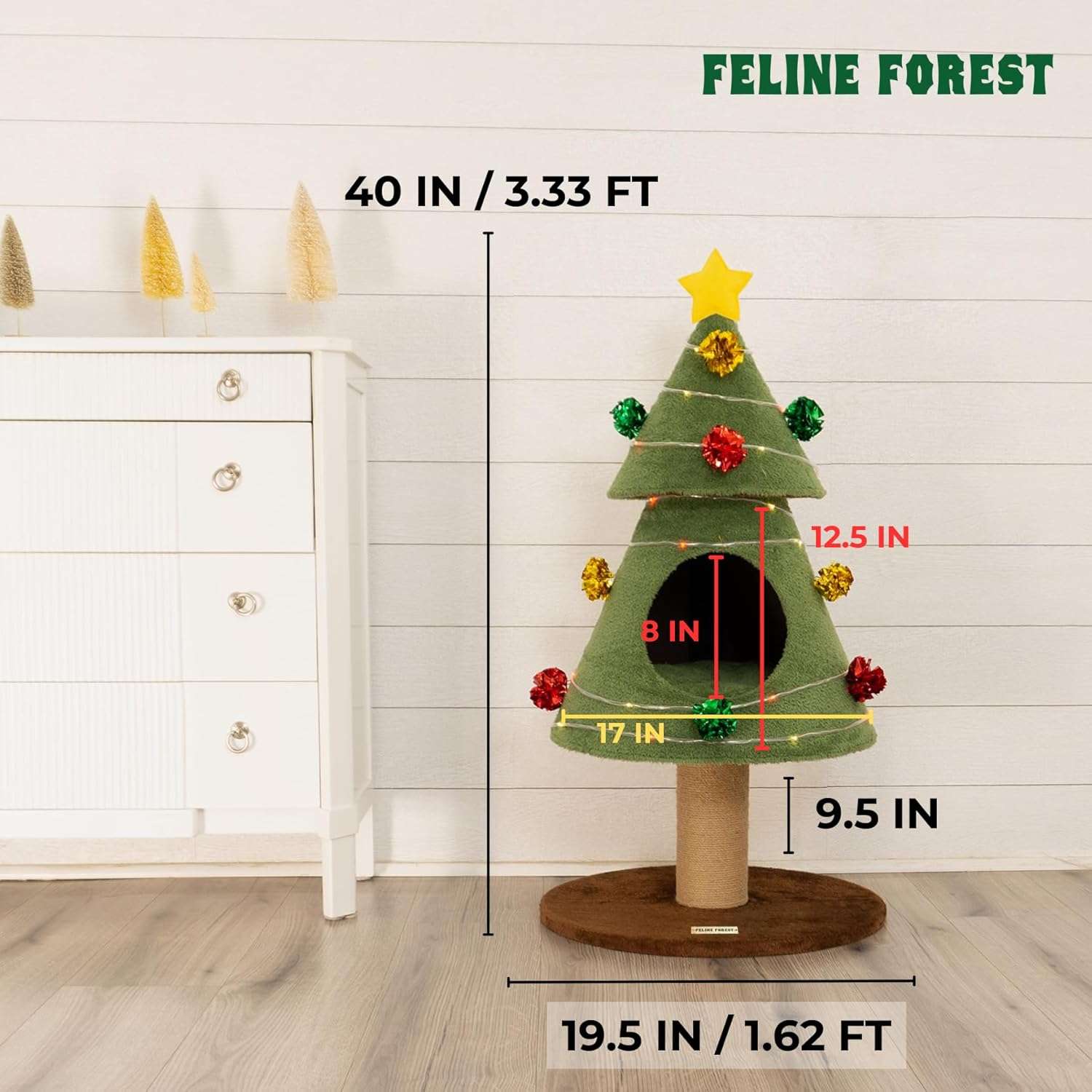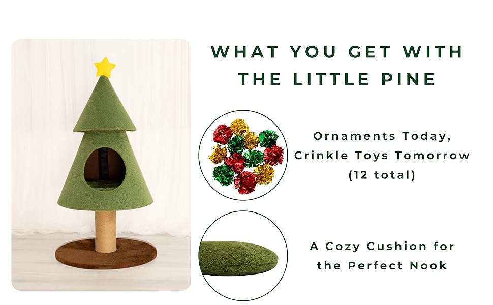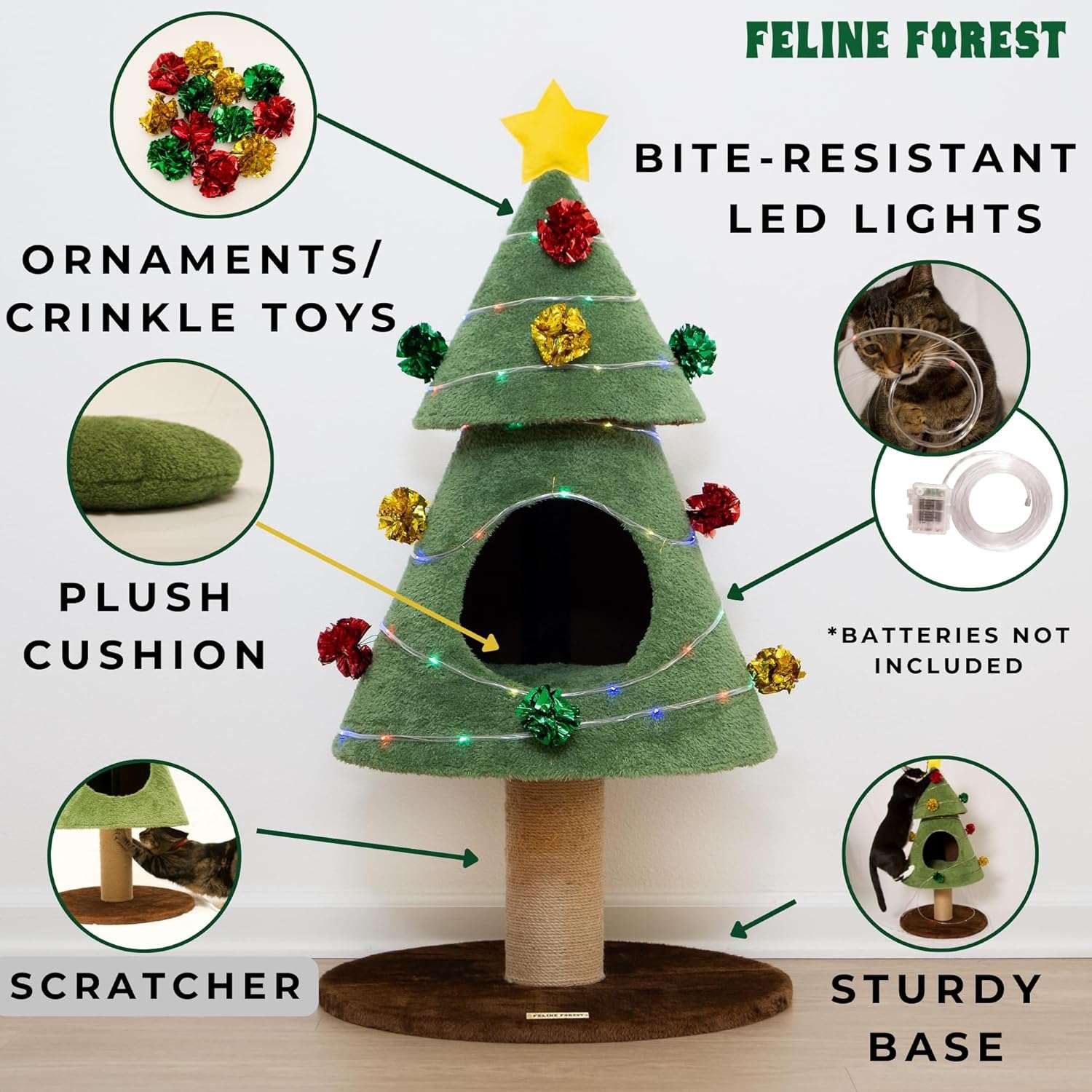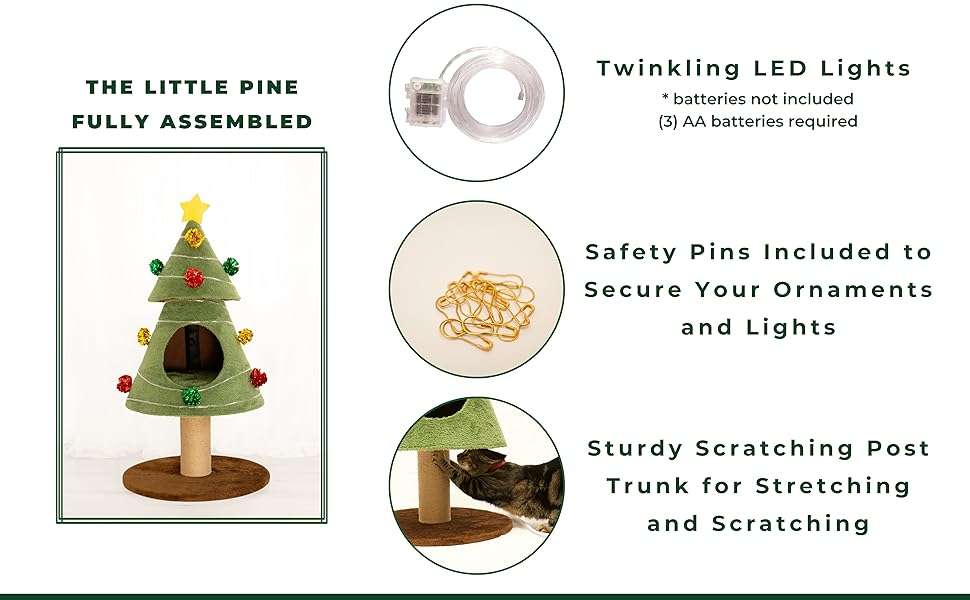 Luces LED y Adornos Seguros: Ilumina tu hogar con luces LED seguras para gatos y adornos que están fijados firmemente para resistir las patas curiosas. Las decoraciones funcionan como juguetes seguros para mayor diversión. (Requiere 3 pilas AA, no incluidas).
