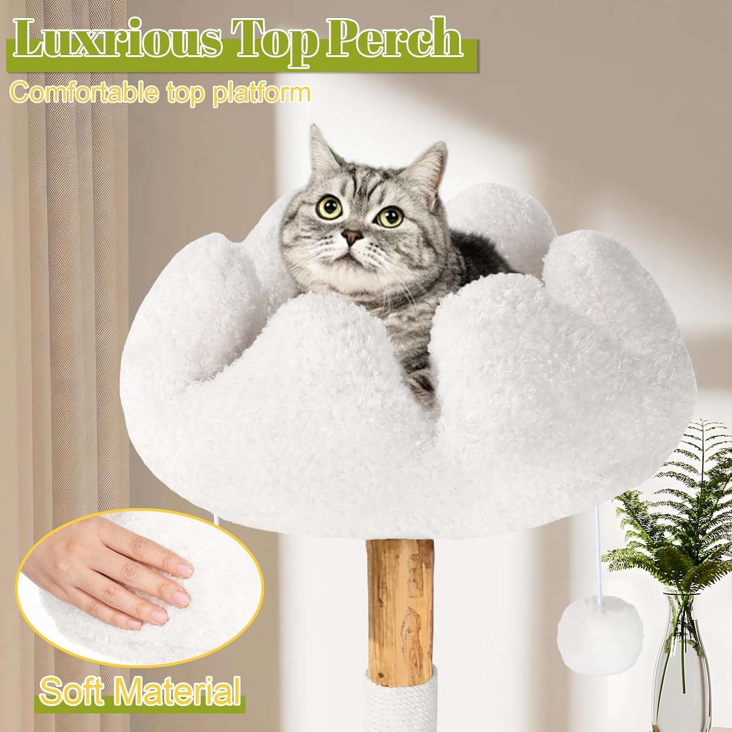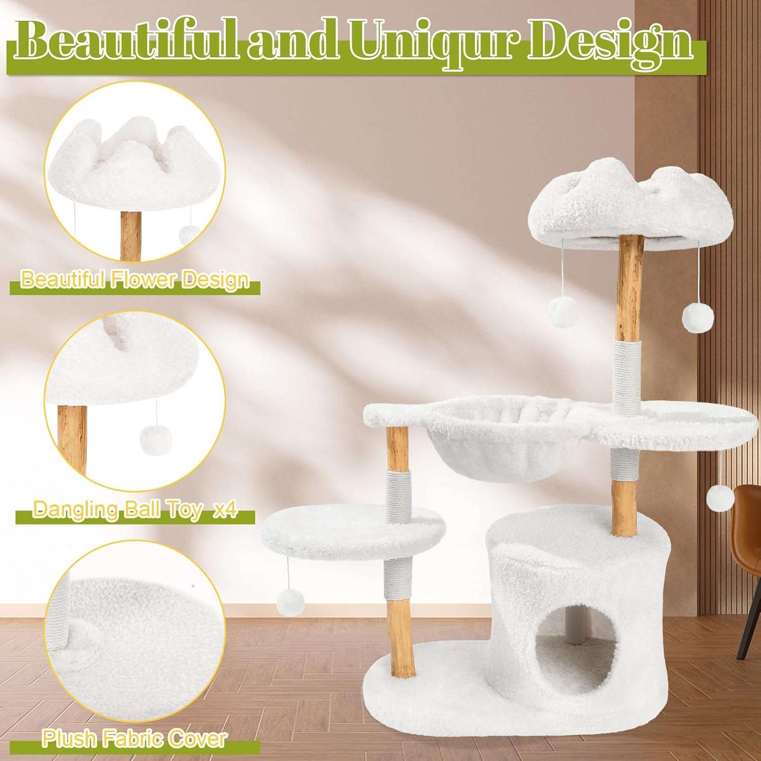 Diseño Exquisito y Materiales Premium: Forma de Flor Única: Construido en una hermosa forma de flor con detalles delicados de madera, permitiendo a su gatito acostarse sobre una “flor” cómoda. Madera Maciza: Fabricado con madera maciza resistente. Las flores en la parte superior tambien son de madera, no de carton, garantizando durabilidad. Sisal Superior: El sisal es mas resistente que el normal, proporcionando un ambiente de descanso mas seguro.