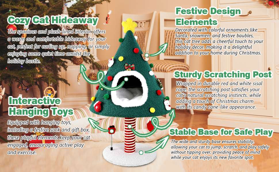 Entretenimiento Festivo: Incluye elementos divertidos como calcetines colgantes y una caja de regalo con resorte, que mantienen a tu gato comprometido y estimulan su instinto de caza.