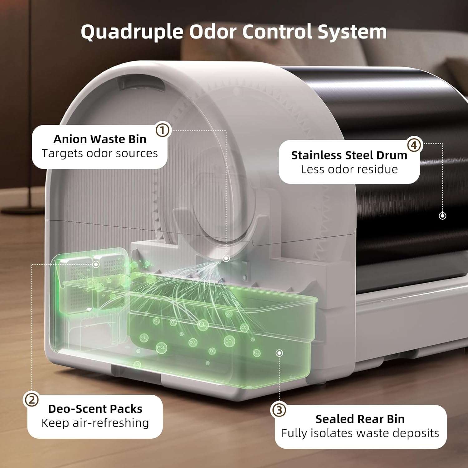 El control de olores avanzado combina el acero inoxidable a prueba de olores un contenedor especial un compartimento trasero sellado y paquetes desodorantes logrando un aislamiento total Su diseño semicerrado evita la dispersion de la arena ahorrandole tiempo y esfuerzo y todas sus piezas son lavables para garantizar un ambiente sin residuos siendo adecuado para gatos desde un kilo hasta los ocho kilos de peso