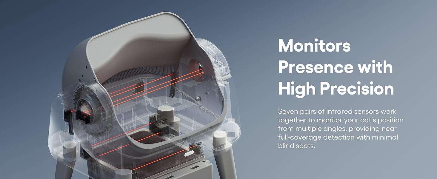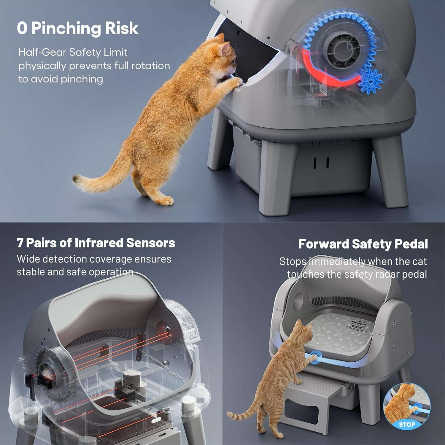 Para garantizar la maxima seguridad y el bienestar de su mascota esta unidad cuenta con un sistema redundante de triple capa Sus siete pares de sensores infrarrojos de precision proporcionan un monitoreo completo mientras que un pedal de seguridad sensible al tacto detiene inmediatamente la operacion si detecta contacto Ademas un limitador mecanico restringe la rotacion excesiva brindando total tranquilidad para los dueños durante los ciclos de limpieza regulares