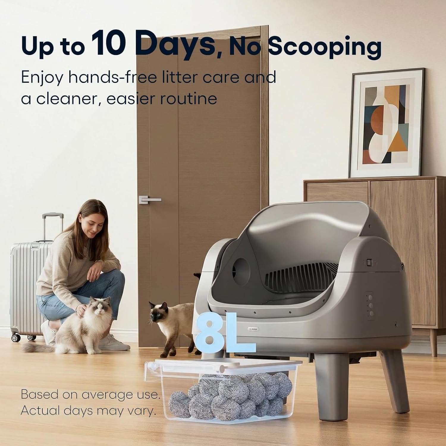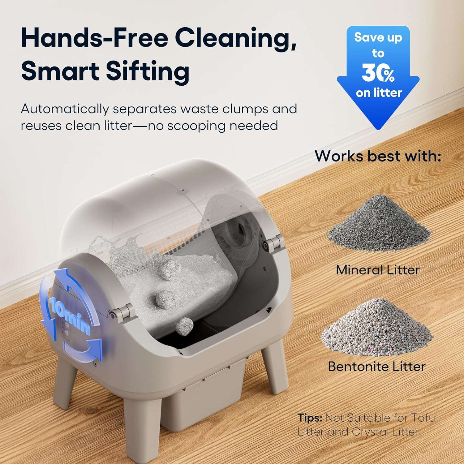 Su logica de limpieza estrategica incluye un retraso de aglutinacion que permite que la arena se solidifique completamente antes de comenzar la rotacion asegurando una separacion total de los residuos y minimizando la arena pegada en el fondo o las manchas en las paredes Este sistema esta diseñado para ser altamente compatible con la mayoria de las arenas aglutinantes tradicionales de bentonita y minerales permitiendo elegir su marca preferida ajustandose a su presupuesto