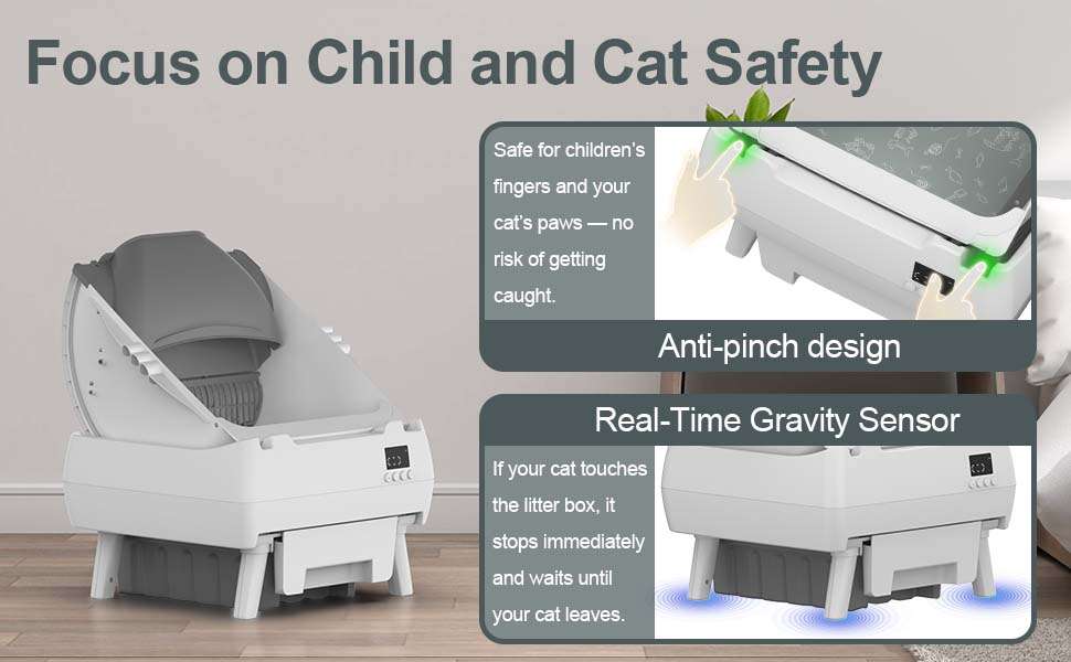 Para priorizar el bienestar de su animal este equipo cuenta con avanzadas caracteristicas de seguridad Al estar equipado con tecnologia anti pellizcos el mecanismo de la caja de arena se detiene inmediatamente si detecta algun contacto o tacto durante su funcionamiento manteniendo a su gato totalmente seguro y libre de cualquier riesgo de accidente en todo momento
