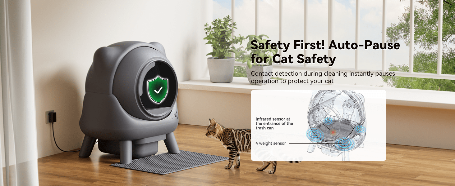 Gracias a su conexion wifi compatible con redes de 2 y 4 gigahercios usted puede rastrear los habitos de baño y la salud de su mascota en tiempo real a traves de su aplicacion movil permitiendole realizar la limpieza con un solo clic y recibiendo alertas cuando el cubo esta lleno Ademas este baño inteligente ofrece una proteccion de seguridad multicapa con sensores infrarrojos y de peso que detienen la rotacion inmediatamente si su gato se acerca o ingresa evitando cualquier accidente