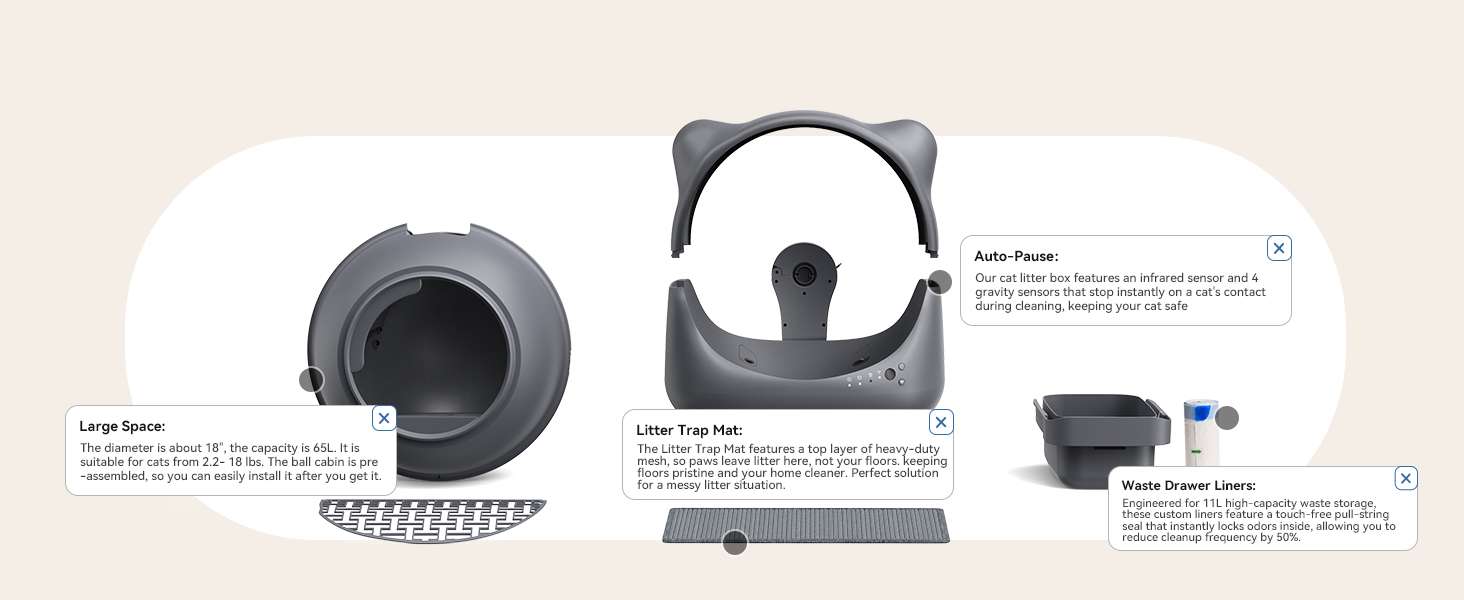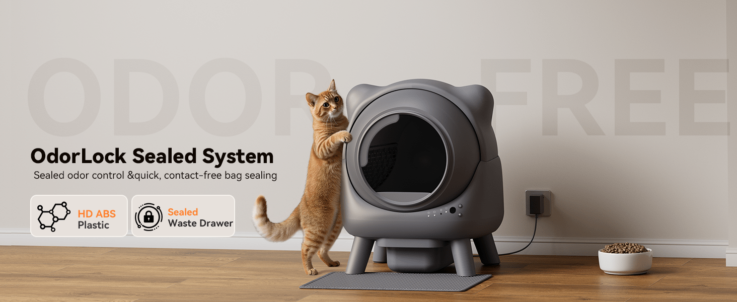 Para garantizar un ambiente puro este modelo adopta un sistema avanzado sin olor de triple capa Primero su material abs de alta calidad previene fugas de orina y atrapa los olores en su origen Segundo incluye una alfombra impermeable de tres capas con diseño antiadherente que resiste la acumulacion de desechos Finalmente el almacenamiento hermetico con junta de silicona asegura que los malos olores permanezcan completamente sellados