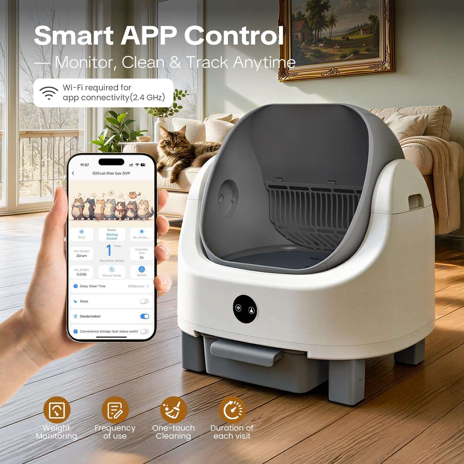 Gracias a su conexion wifi usted puede realizar un monitoreo en tiempo real a traves de su aplicacion movil Esta avanzada tecnologia le permite rastrear los habitos de su mascota ejecutar la limpieza con un solo clic y registrar la frecuencia de uso para un mejor control de salud general directamente desde su telefono celular
