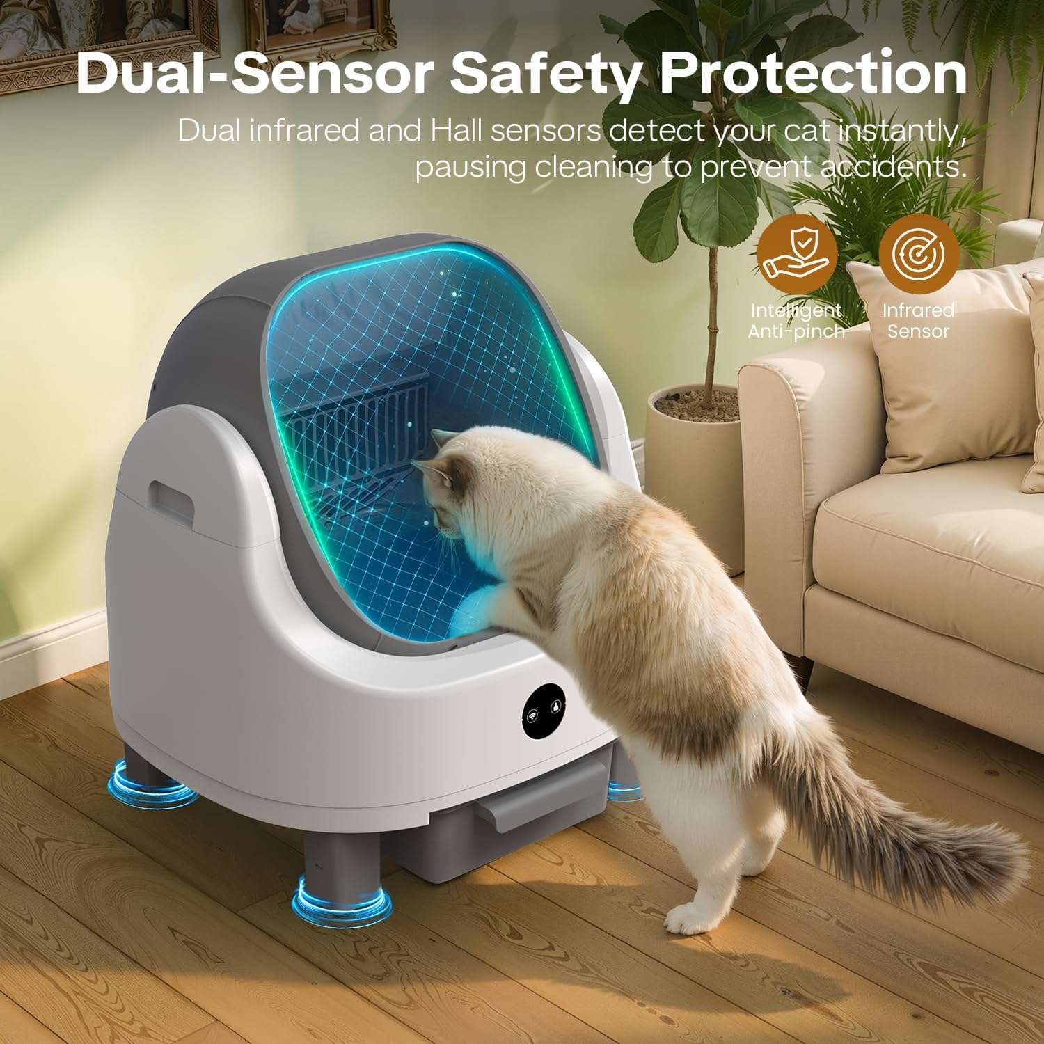 Este baño inteligente ofrece una proteccion de seguridad multicapa totalmente diseñada con sensores infrarrojos y deteccion de peso integrada El sistema detiene de forma automatica el ciclo de limpieza si su gato entra o se acerca al deposito de residuos evitando cualquier riesgo de quedar atrapado