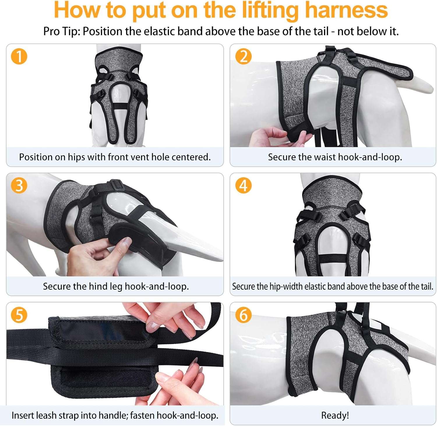 No se Resbala: La clave de este diseño es la banda elástica trasera que se coloca suavemente sobre la cola. Esto actúa como un ancla, evitando que el arnés se deslice hacia las patas cuando levantas a tu perro.