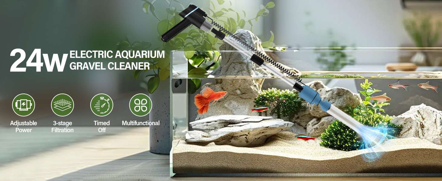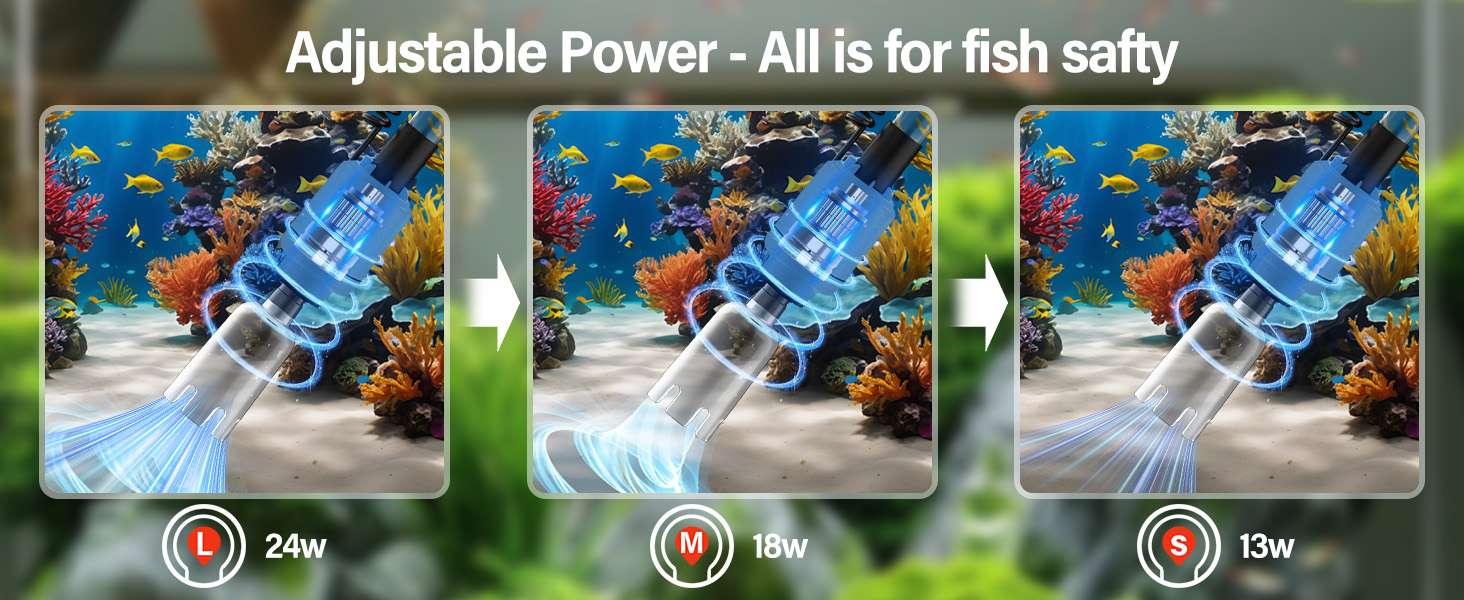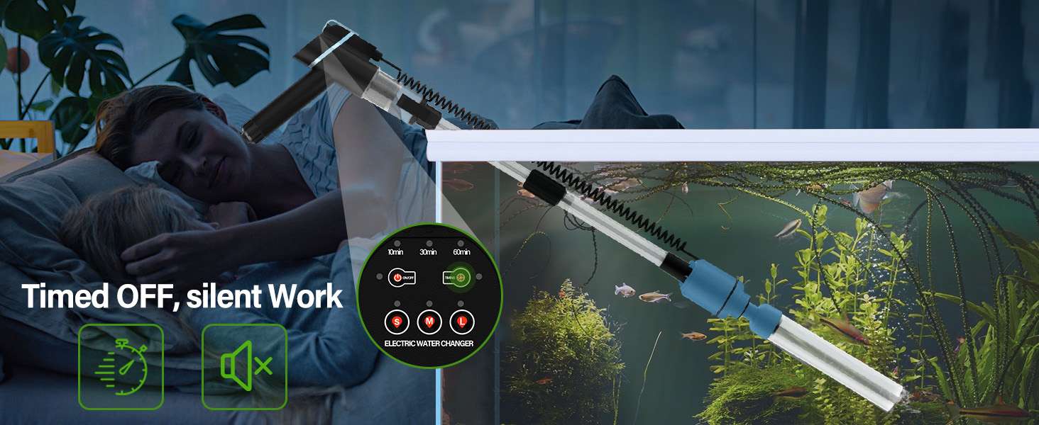 Potencia ajustable de 24 W y apagado temporizado: esta aspiradora eléctrica de grava para acuario viene con un motor de bomba ajustable que funciona silenciosamente. Puede ajustar la potencia a L (24W), M (18W) o S (13W) dependiendo del tamaño de su pez y acuario, cuanto mayor sea la potencia, más fuerte será la succión. Te ayuda a cambiar el agua de forma rápida, eficiente y segura. También puedes configurar el botón del temporizador para que se apague automáticamente después de 10, 30 o 60 minutos.