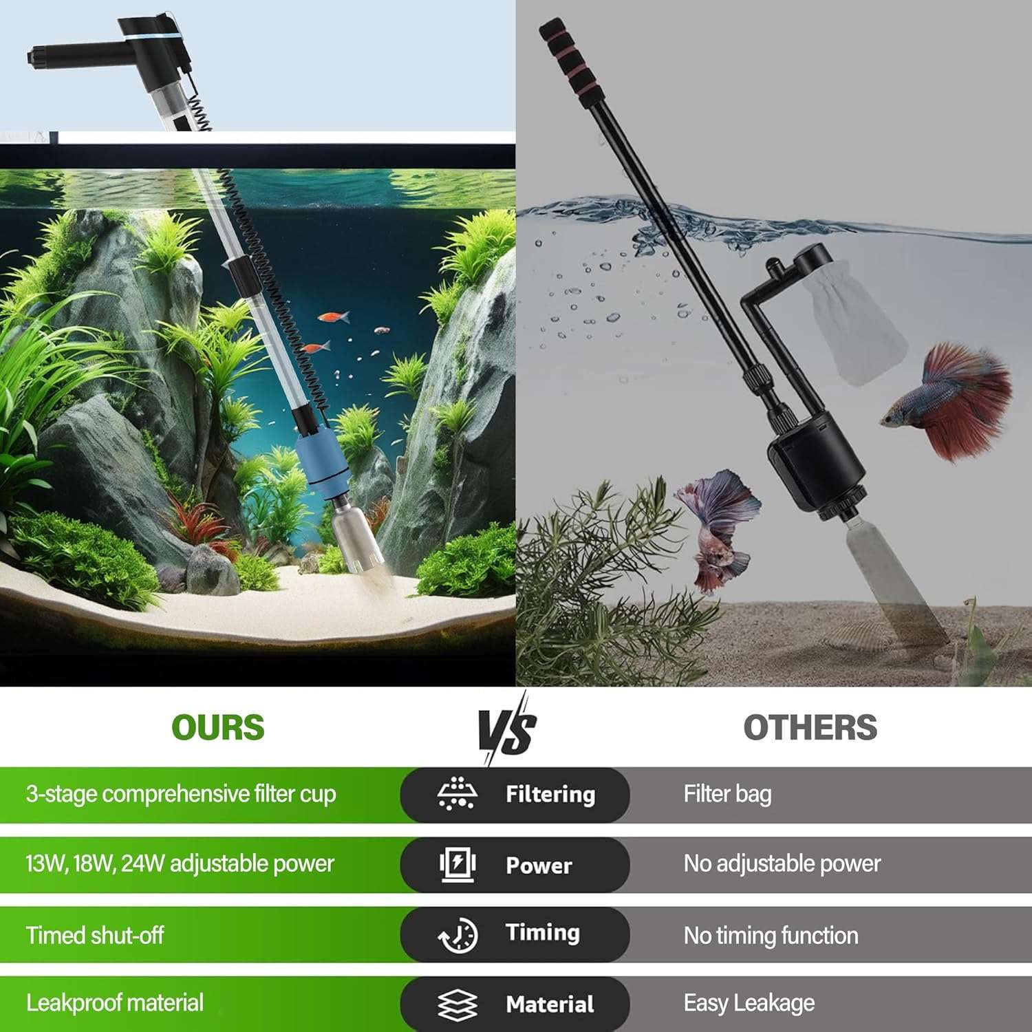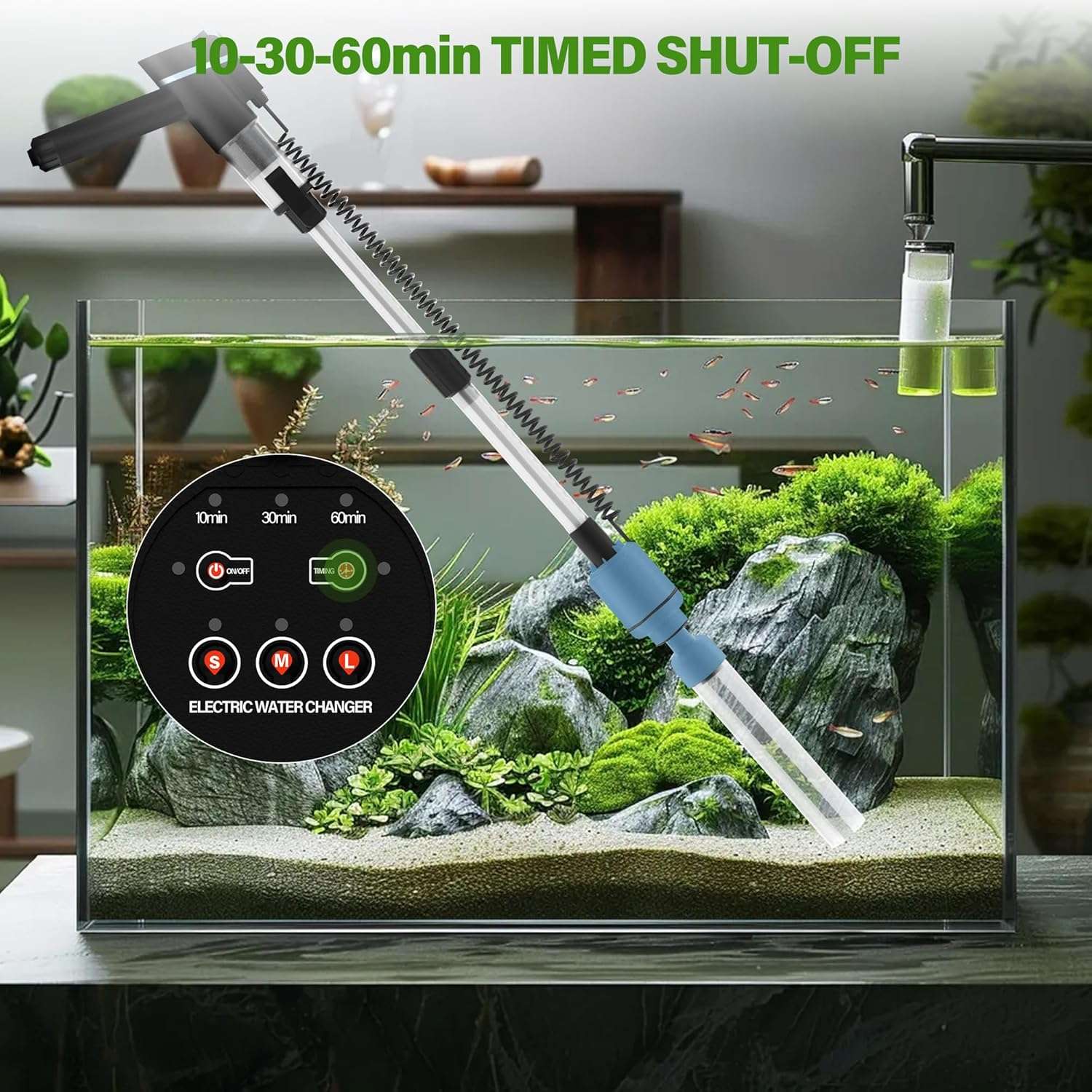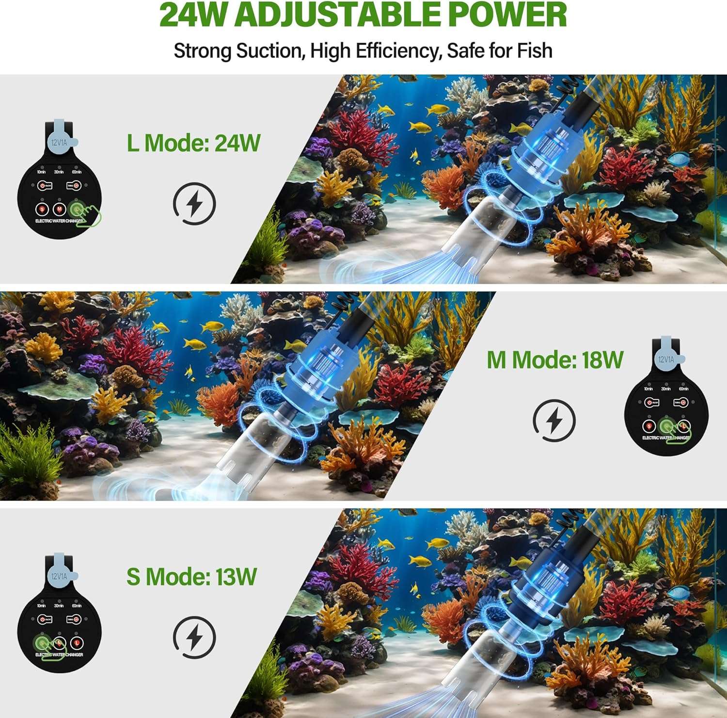 Potencia ajustable de 24 W y apagado temporizado: esta aspiradora eléctrica de grava para acuario viene con un motor de bomba ajustable que funciona silenciosamente. Puede ajustar la potencia a L (24W), M (18W) o S (13W) dependiendo del tamaño de su pez y acuario, cuanto mayor sea la potencia, más fuerte será la succión. Te ayuda a cambiar el agua de forma rápida, eficiente y segura. También puedes configurar el botón del temporizador para que se apague automáticamente después de 10, 30 o 60 minutos.