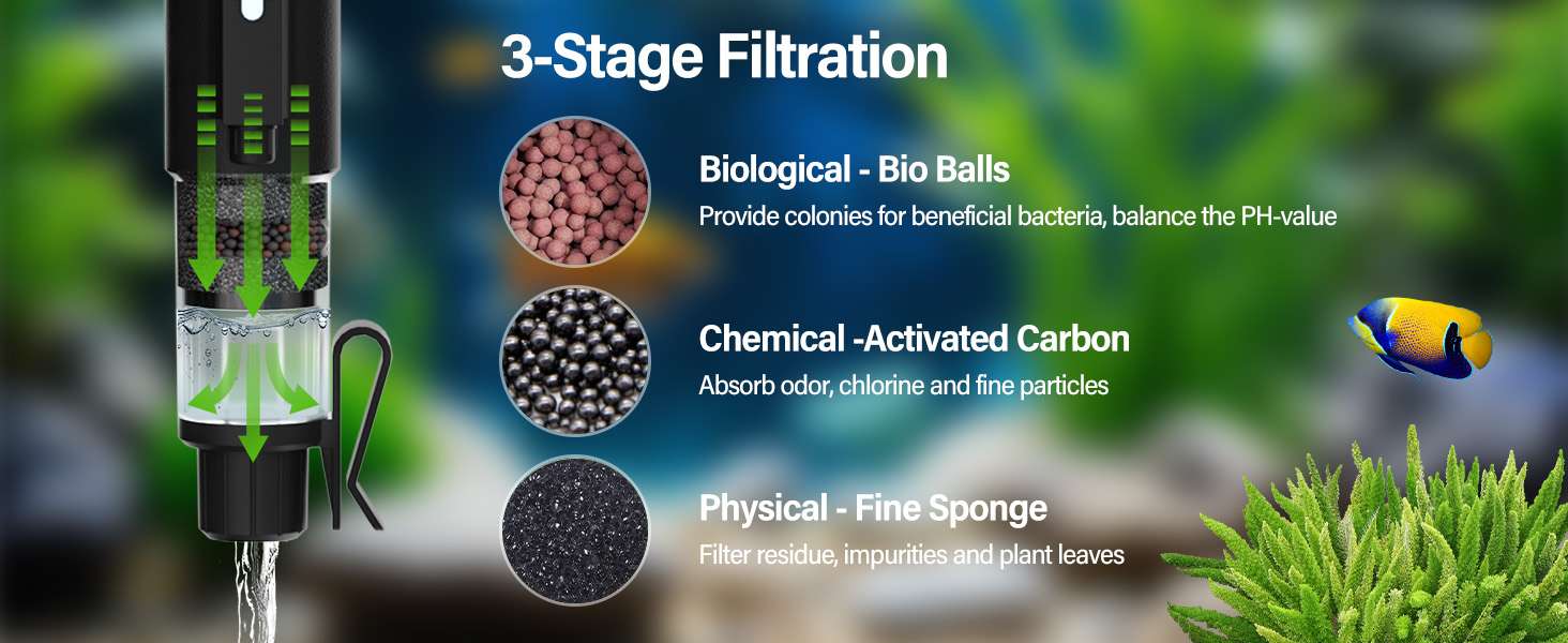 Filtración integrada de 3 etapas Taza de filtro recientemente mejorada con esponja, bola de biofiltro y bola de carbón activado, que puede filtrar eficazmente las impurezas y fluir agua limpia de regreso al acuario para filtración y circulación de agua. Es más limpio que las tazas de filtro de esponja ordinarias y las bolsas de filtro, y puede filtrar eficazmente el 99% de las impurezas en el agua. Y el medio filtrante se puede limpiar y reutilizar una y otra vez, manteniendo tu pescado sano y enérgico