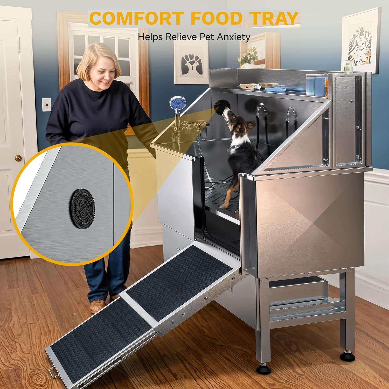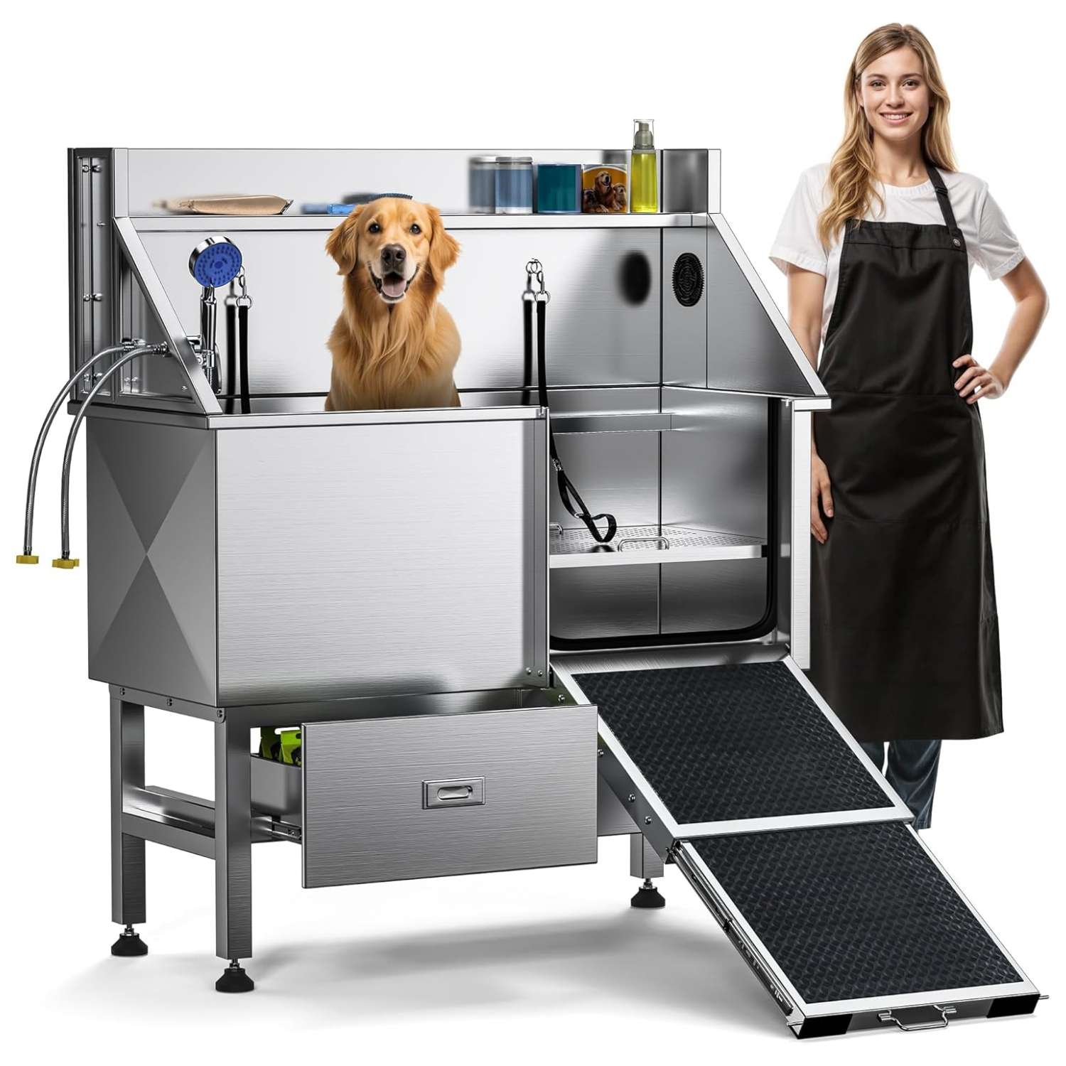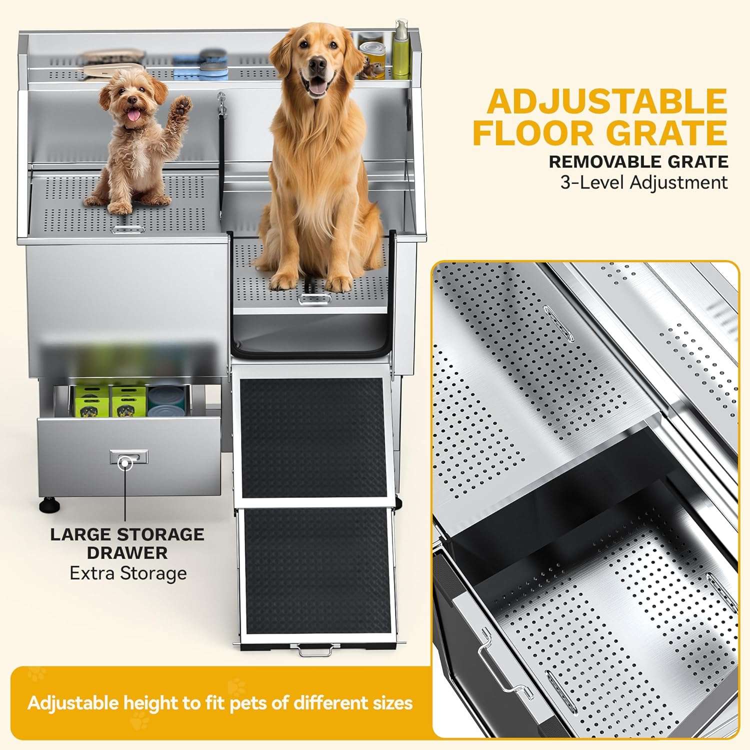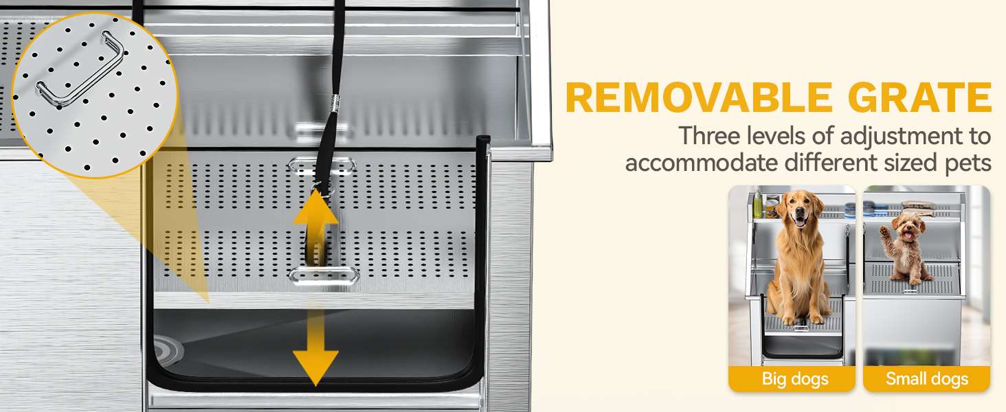 Piso Ajustable (3 Niveles): La rejilla interna de dos piezas soporta hasta 90 kg (200 lbs) y se puede elevar para lavar razas pequeñas y medianas a una altura cómoda, cuidando tu postura y espalda.