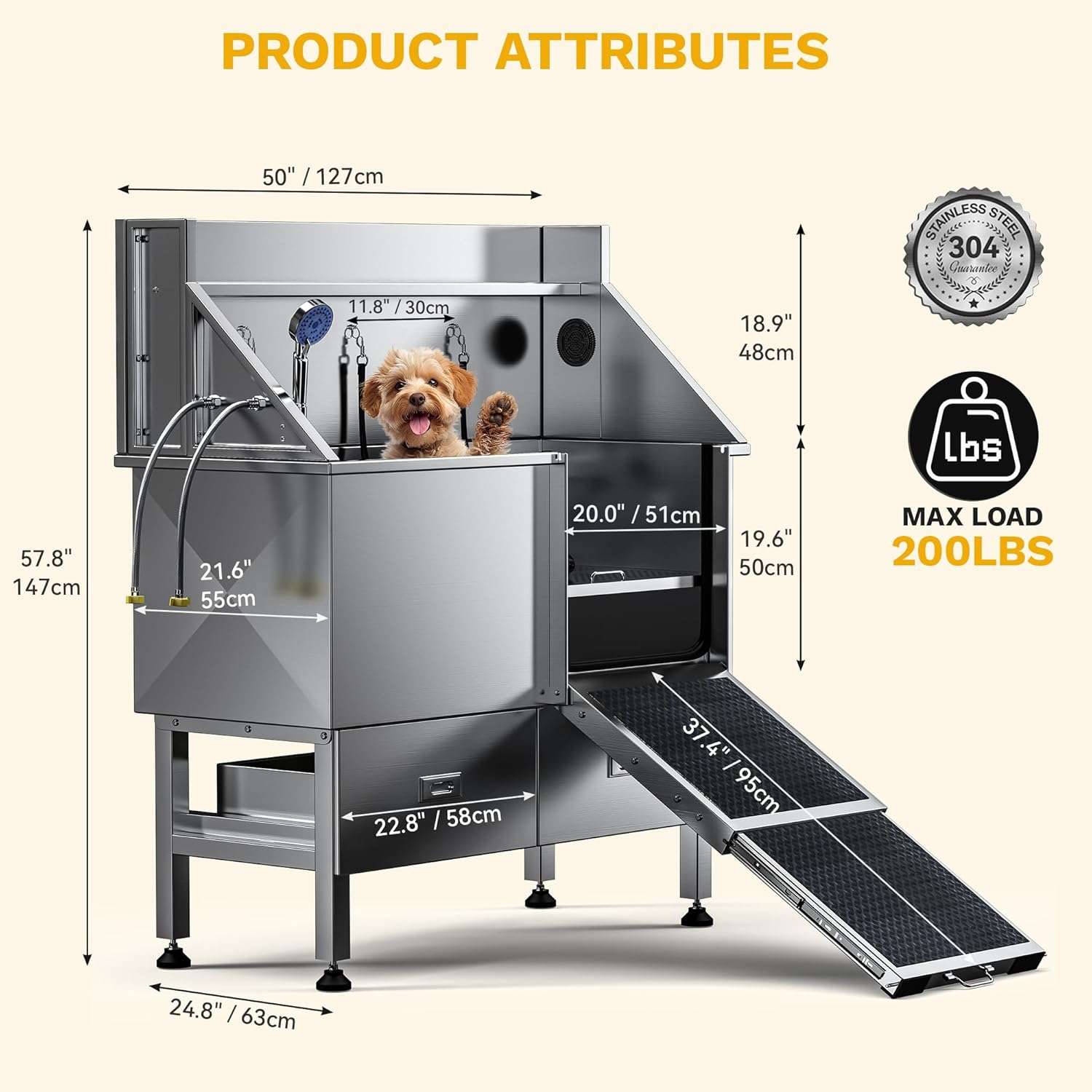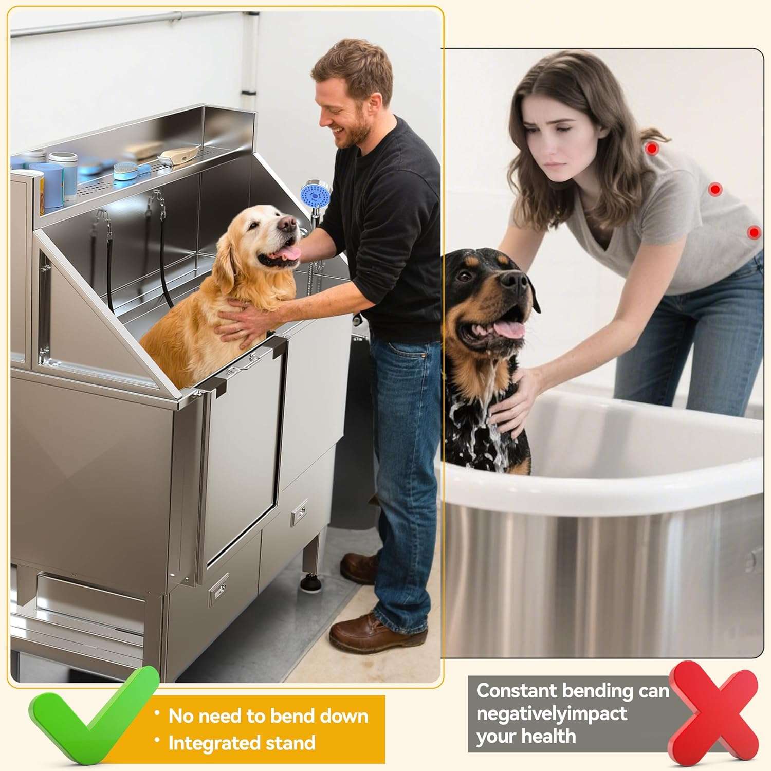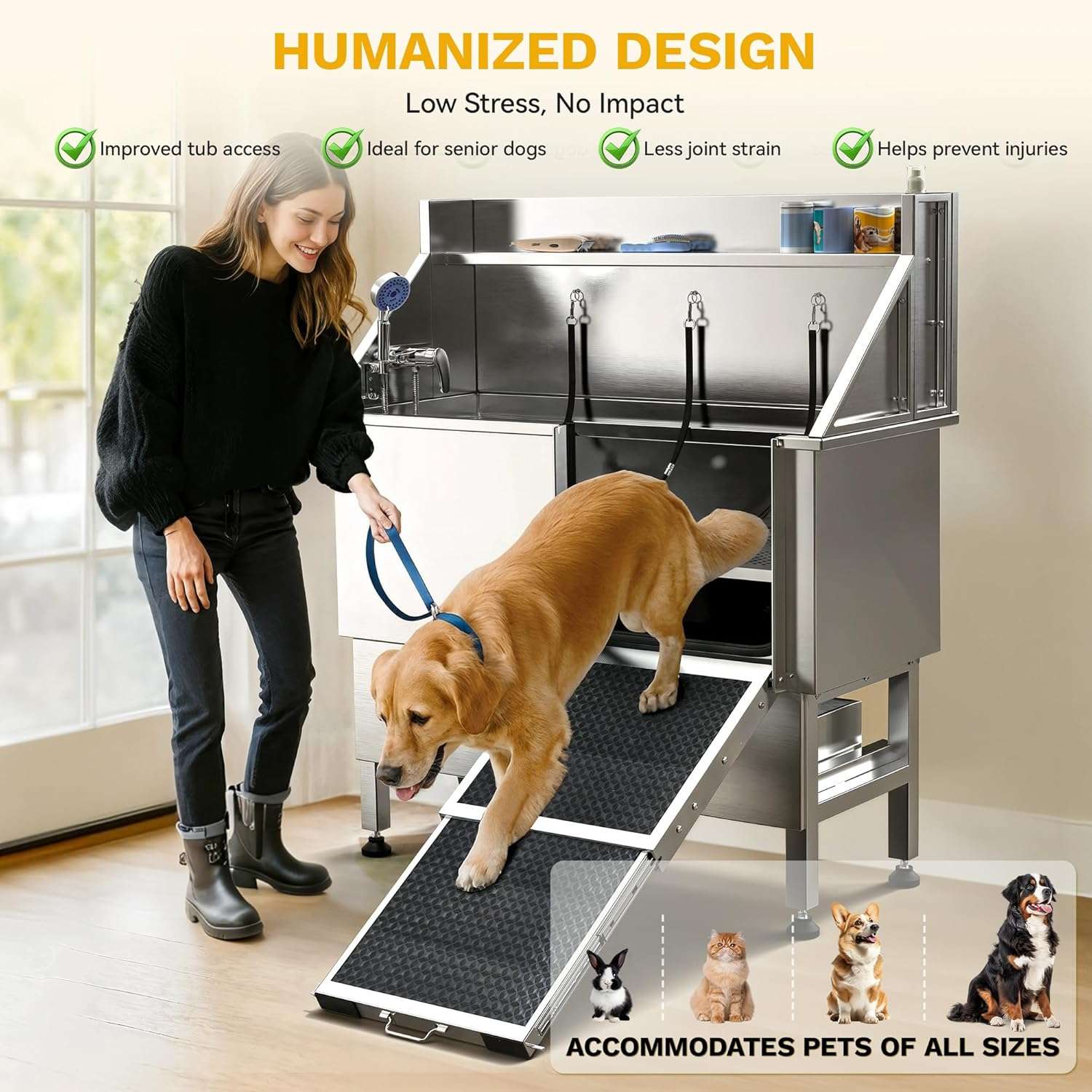 Piso Ajustable (3 Niveles): La rejilla interna de dos piezas soporta hasta 90 kg (200 lbs) y se puede elevar para lavar razas pequeñas y medianas a una altura cómoda, cuidando tu postura y espalda.