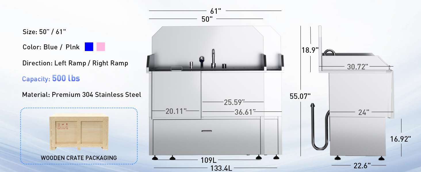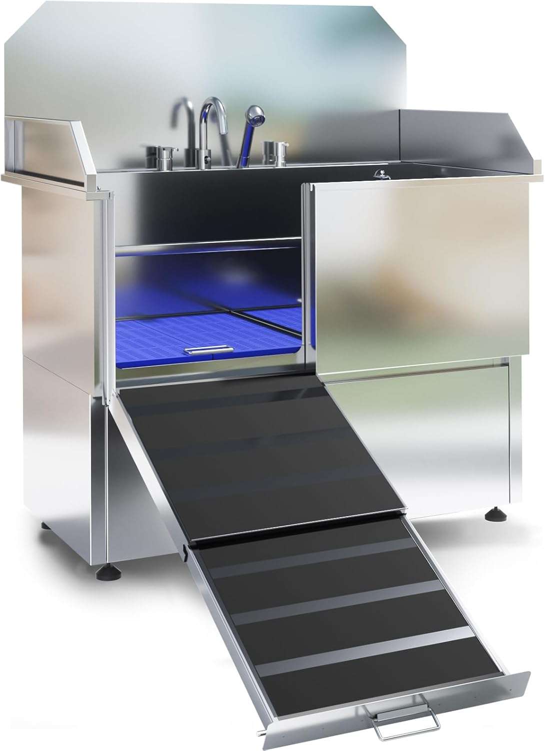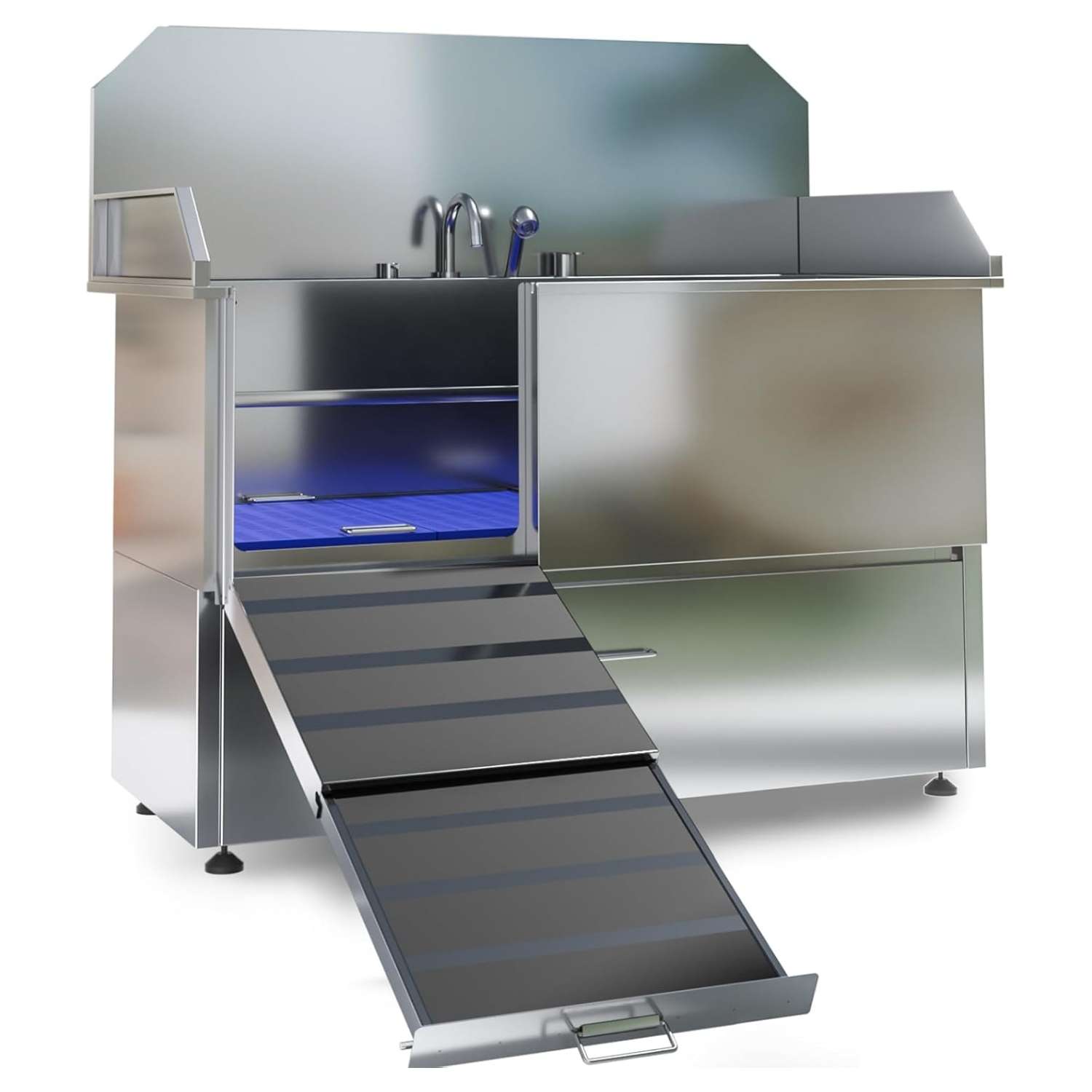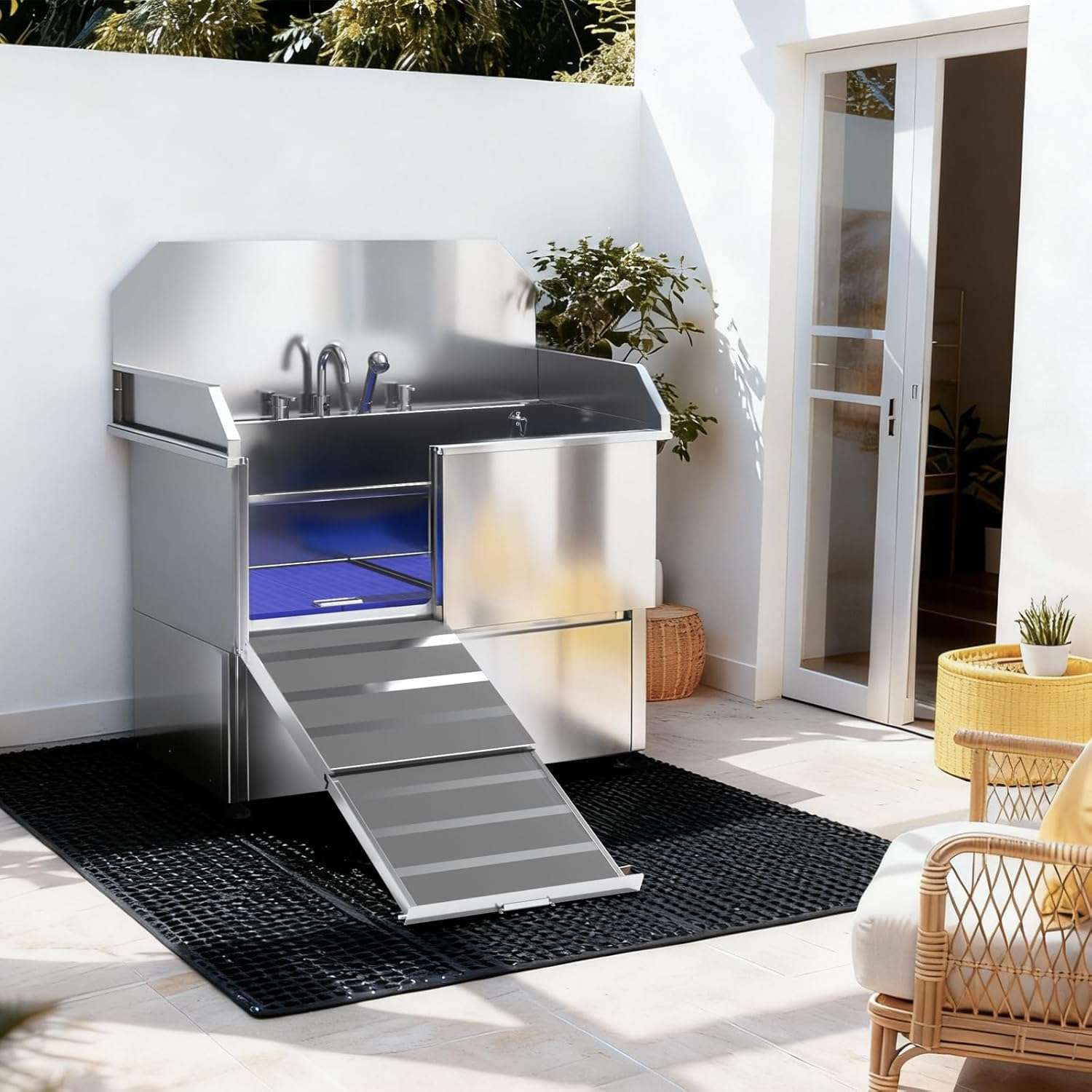 La estación de trabajo definitiva para peluquerías de alto tráfico y clínicas veterinarias. Esta bañera destaca por su construcción totalmente soldada en Acero Inoxidable 304, garantizando una estructura a prueba de fugas y óxido. Su diseño inteligente soluciona dos grandes problemas del peluquero: el desorden (con su cajonera inferior) y la fatiga física (con sus paneles de acceso bajo).