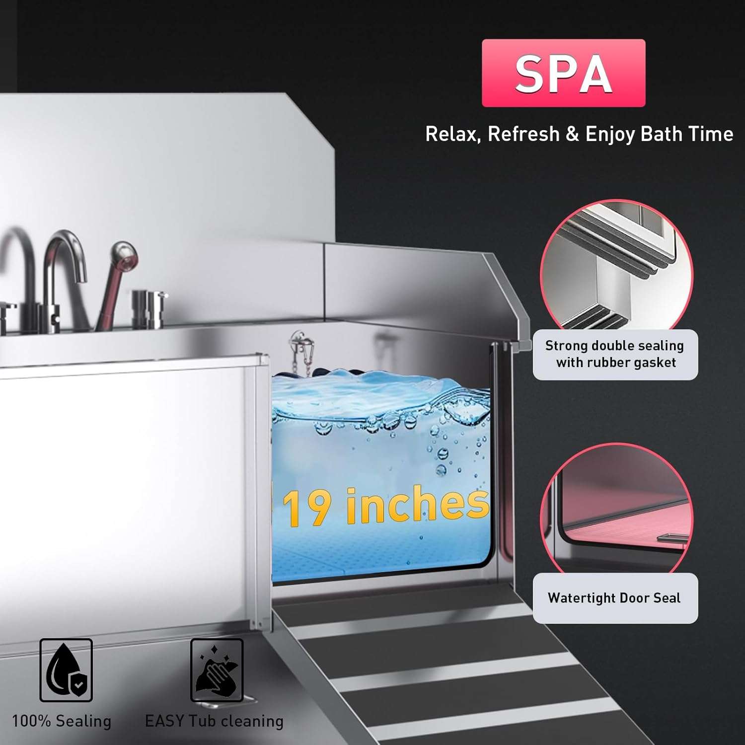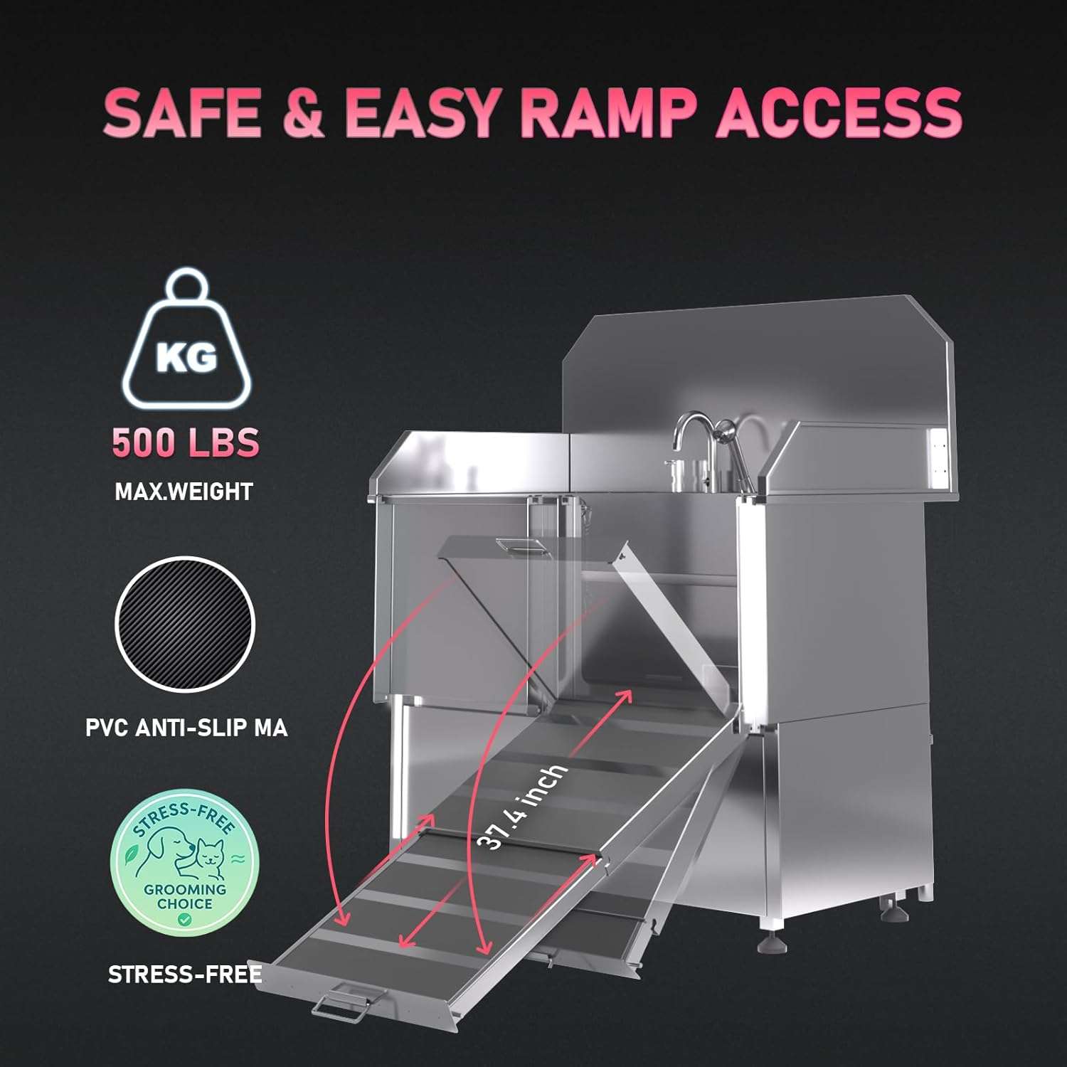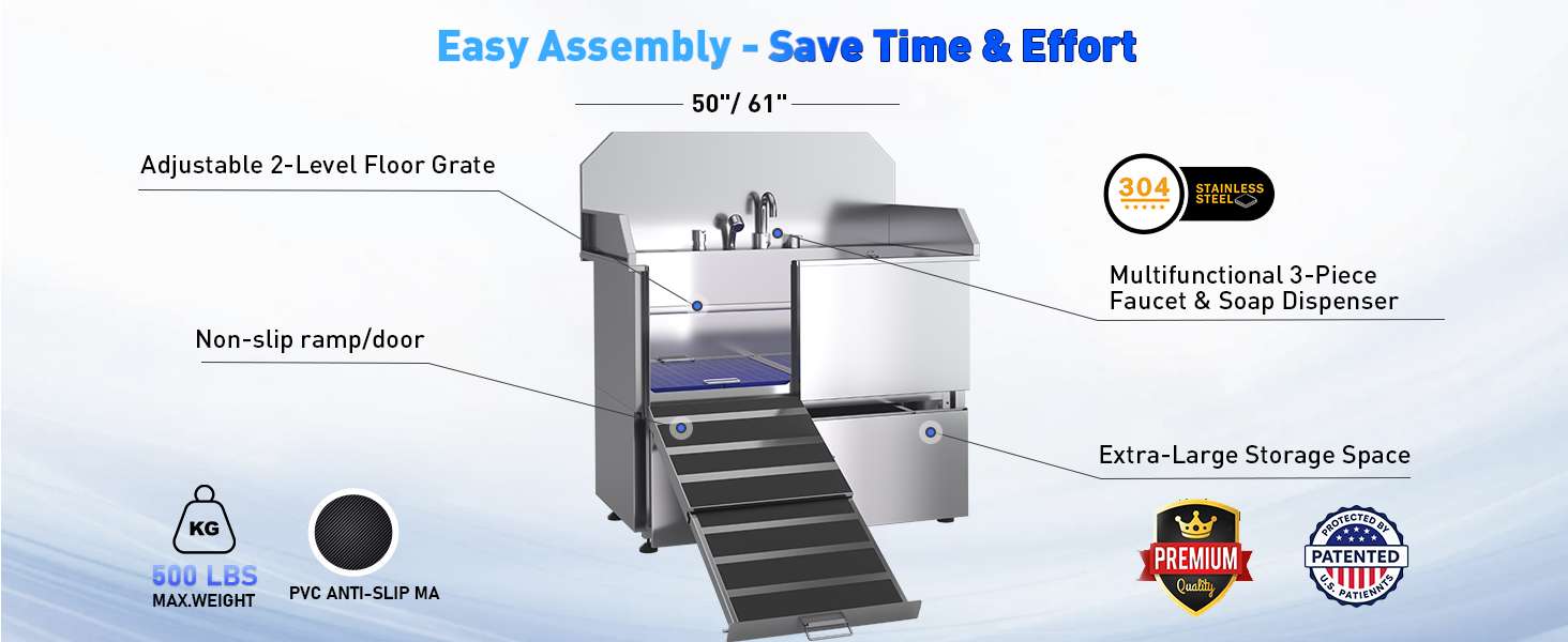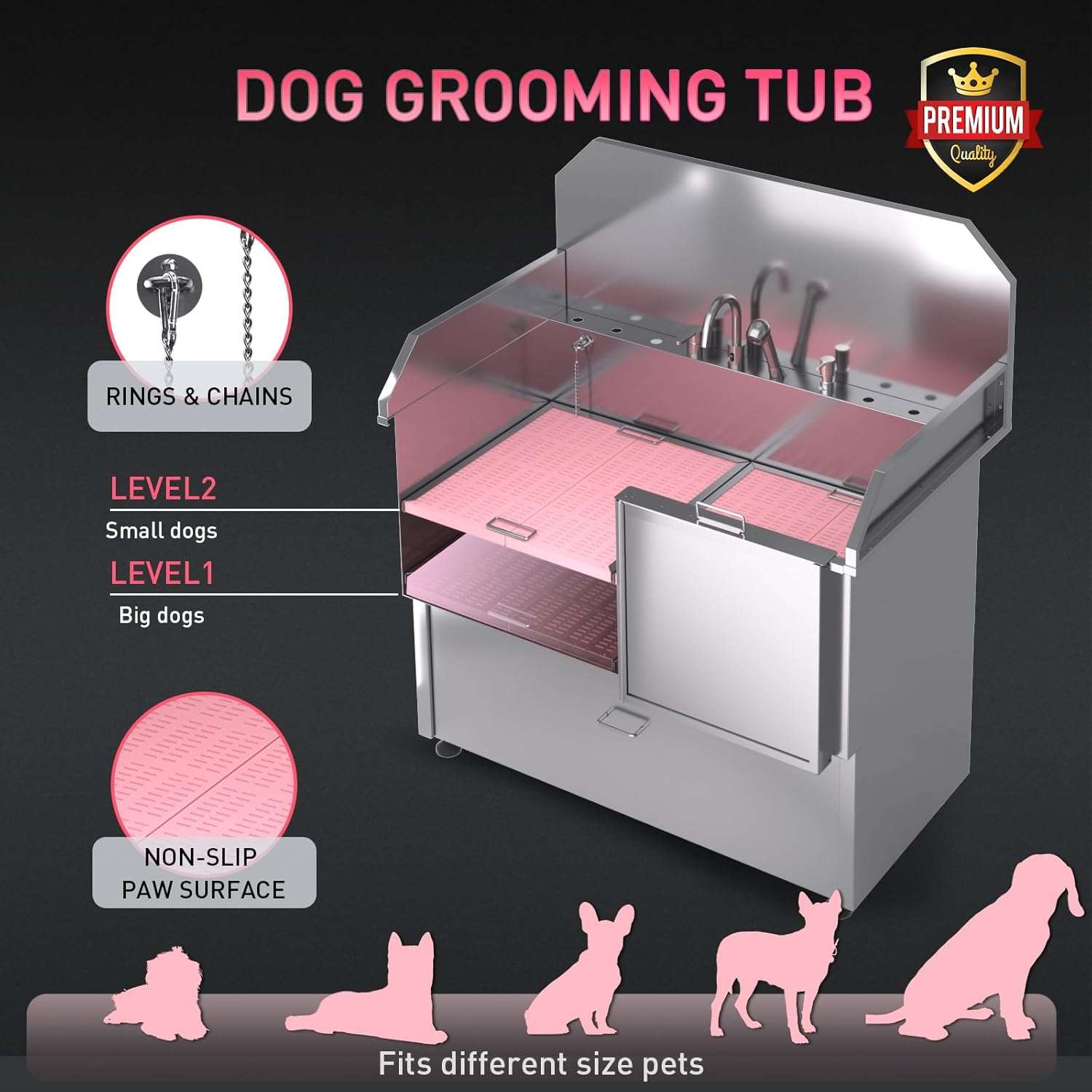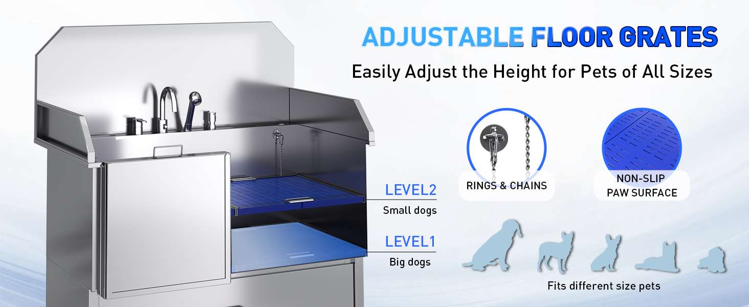 Piso Ajustable (2 Niveles): Cuenta con rejillas de suelo robustas que se pueden elevar. Sube a los perros más pequeños para lavarlos cómodamente y utiliza los bucles de seguridad integrados para mantenerlos quietos.