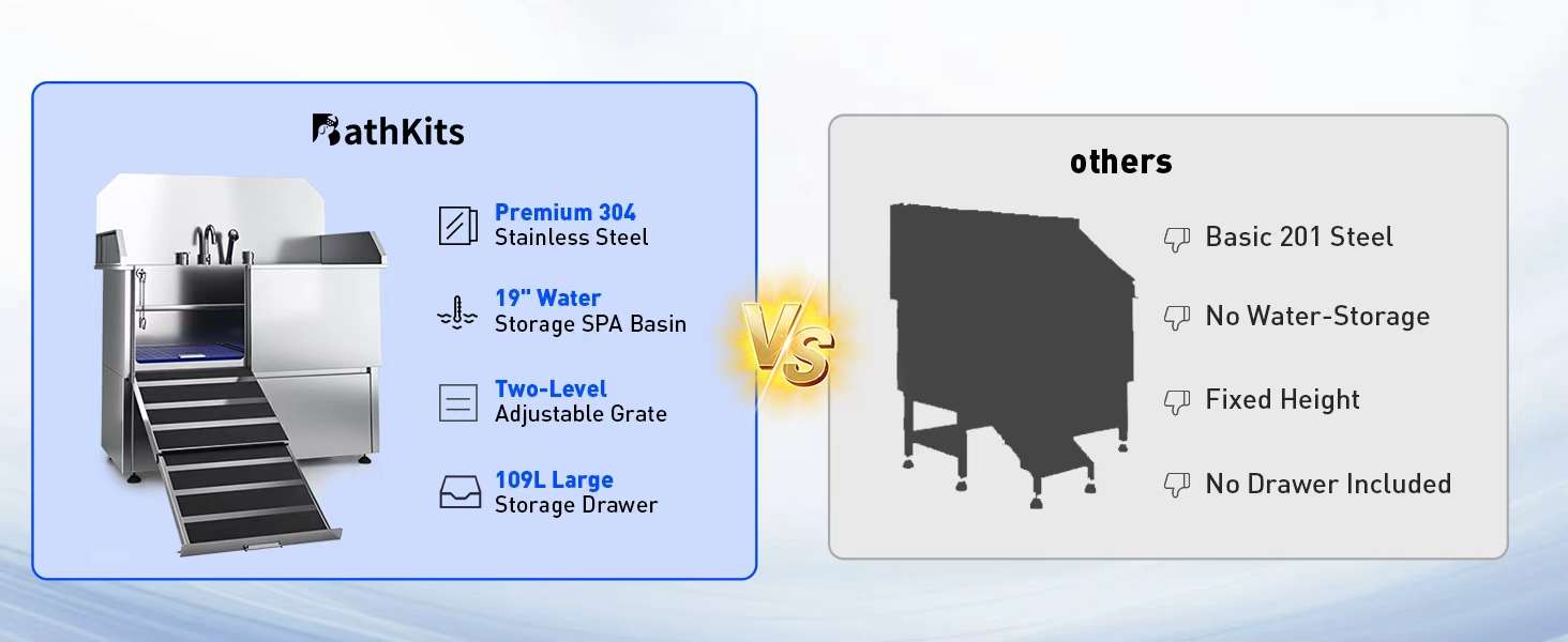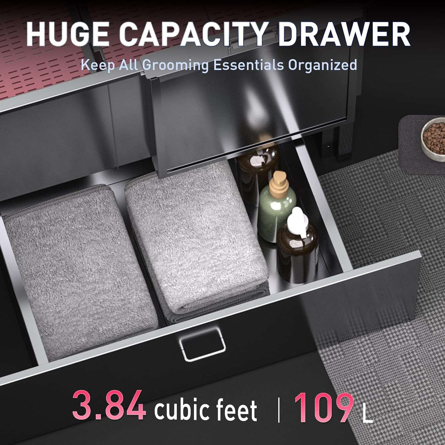 Cajón Deslizante de Gran Capacidad: A diferencia de las tinas básicas, este modelo incluye un cajón inferior de tamaño completo. Es perfecto para guardar galones de shampoo, toallas, herramientas y sopladores, protegiéndolos de la humedad y teniéndolos siempre a mano.