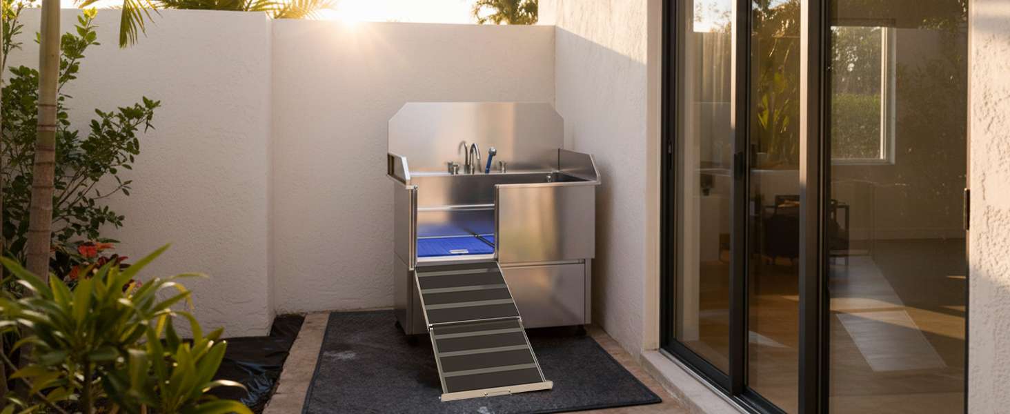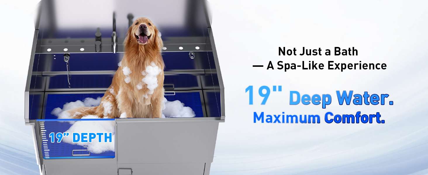 Paneles Laterales Bajos: Las paredes laterales tienen una altura reducida diseñada ergonómicamente. Esto permite al peluquero acceder y lavar al perro desde cualquier ángulo sin levantar los hombros ni forzar la espalda, reduciendo el cansancio diario.