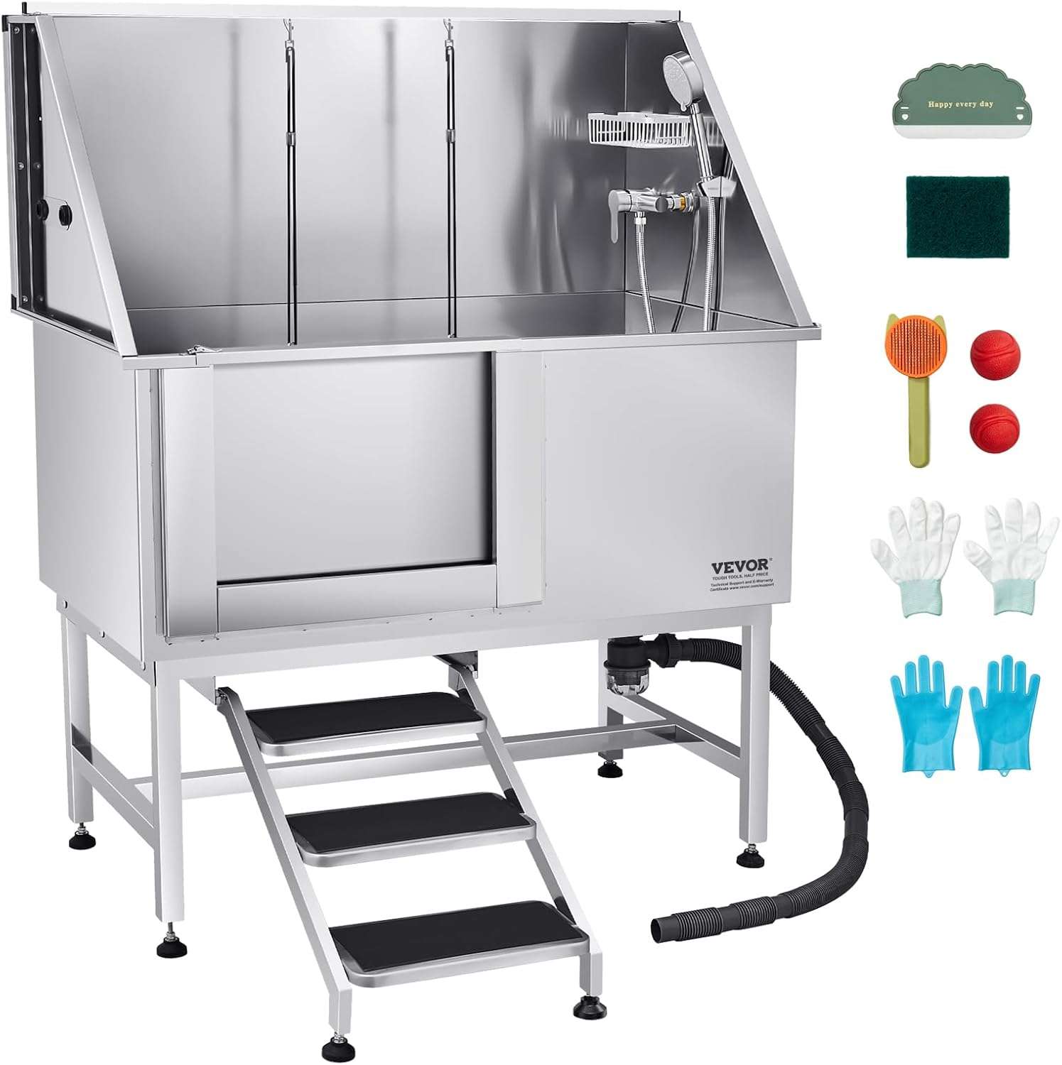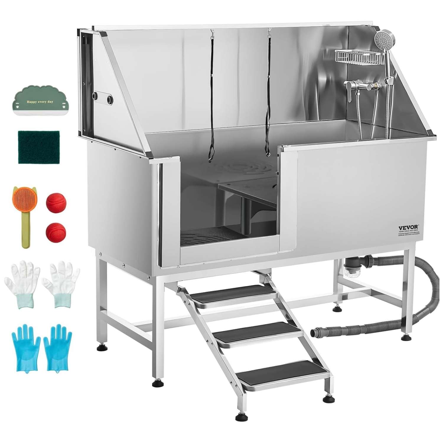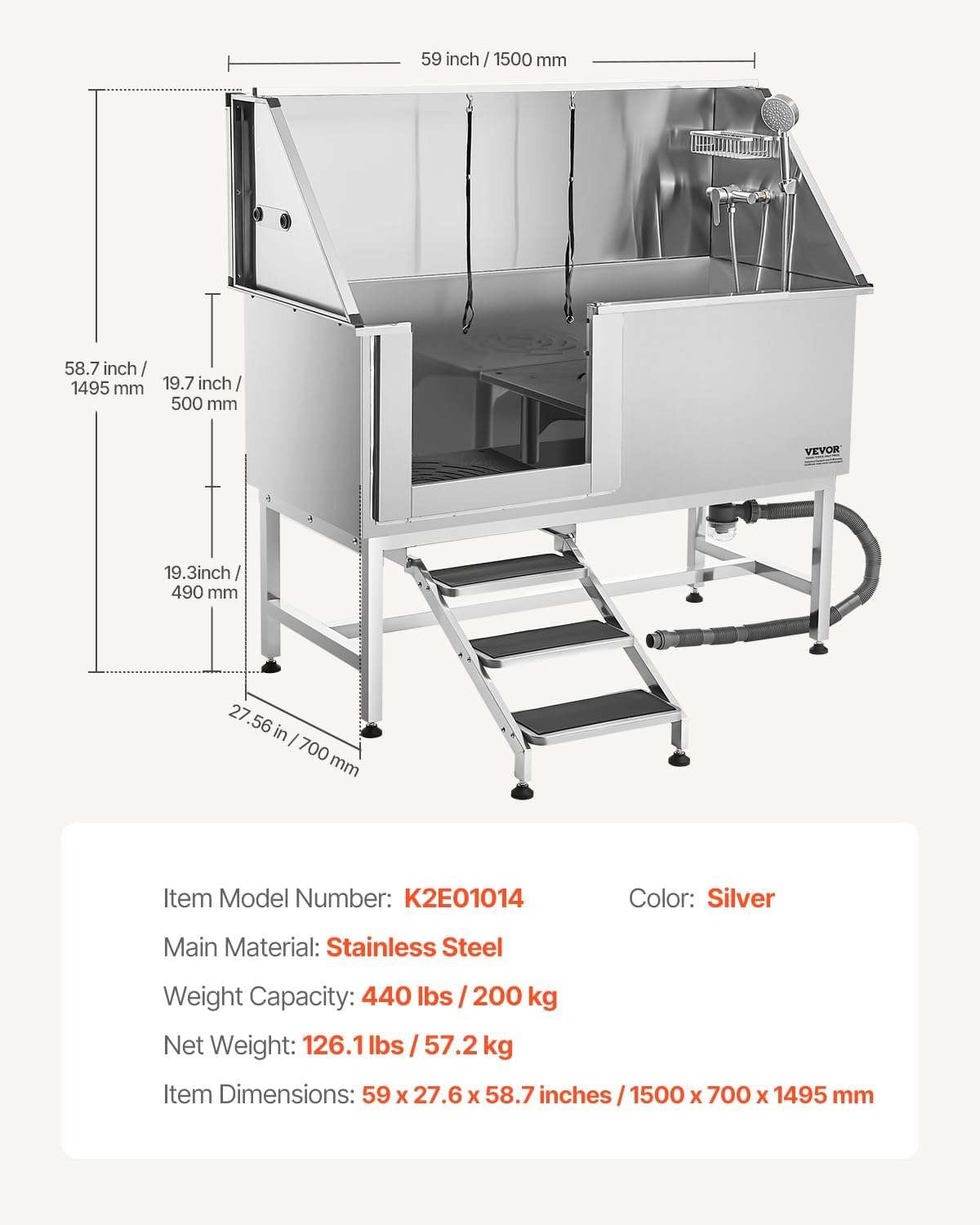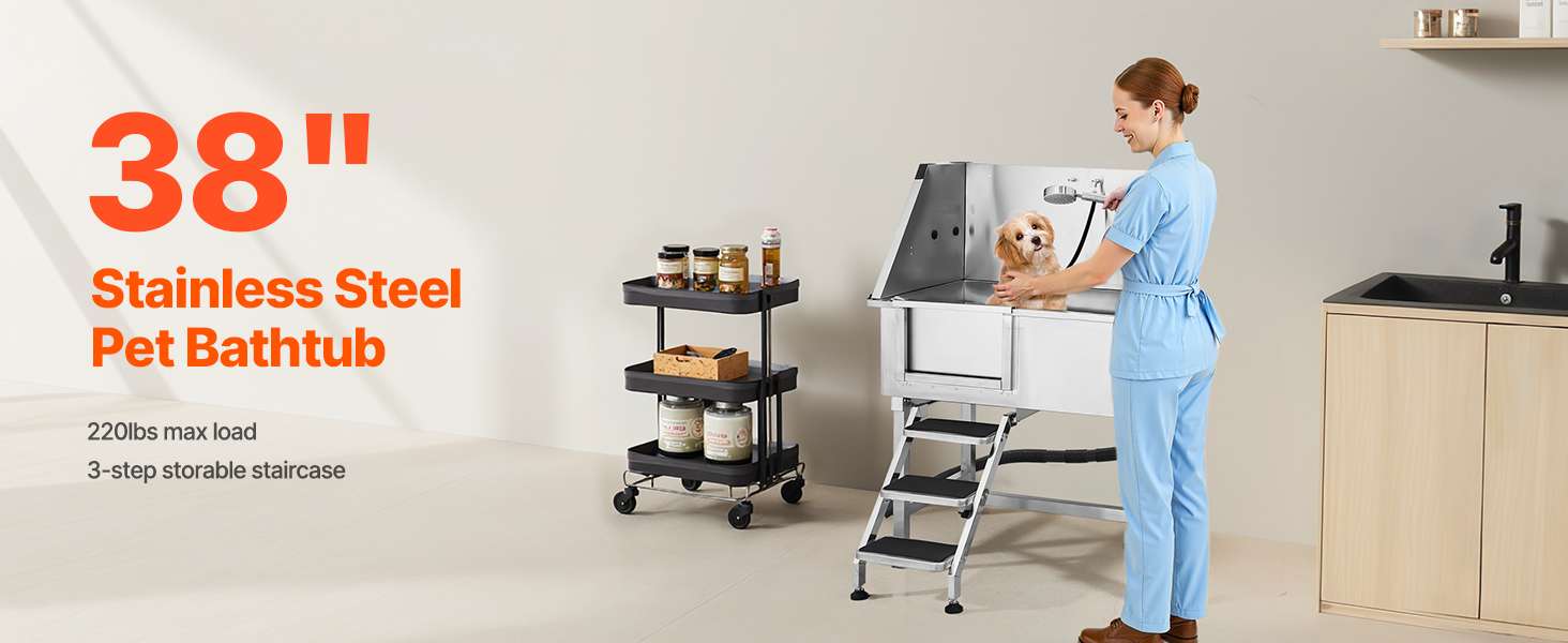 La estación de lavado definitiva para trabajar con seguridad y confianza. Diseñada para soportar el uso intenso, esta bañera destaca por su increíble capacidad de carga de 200 kg (440 lbs) y su enfoque en la seguridad de la mascota, evitando resbalones y fugas gracias a su diseño integrado.