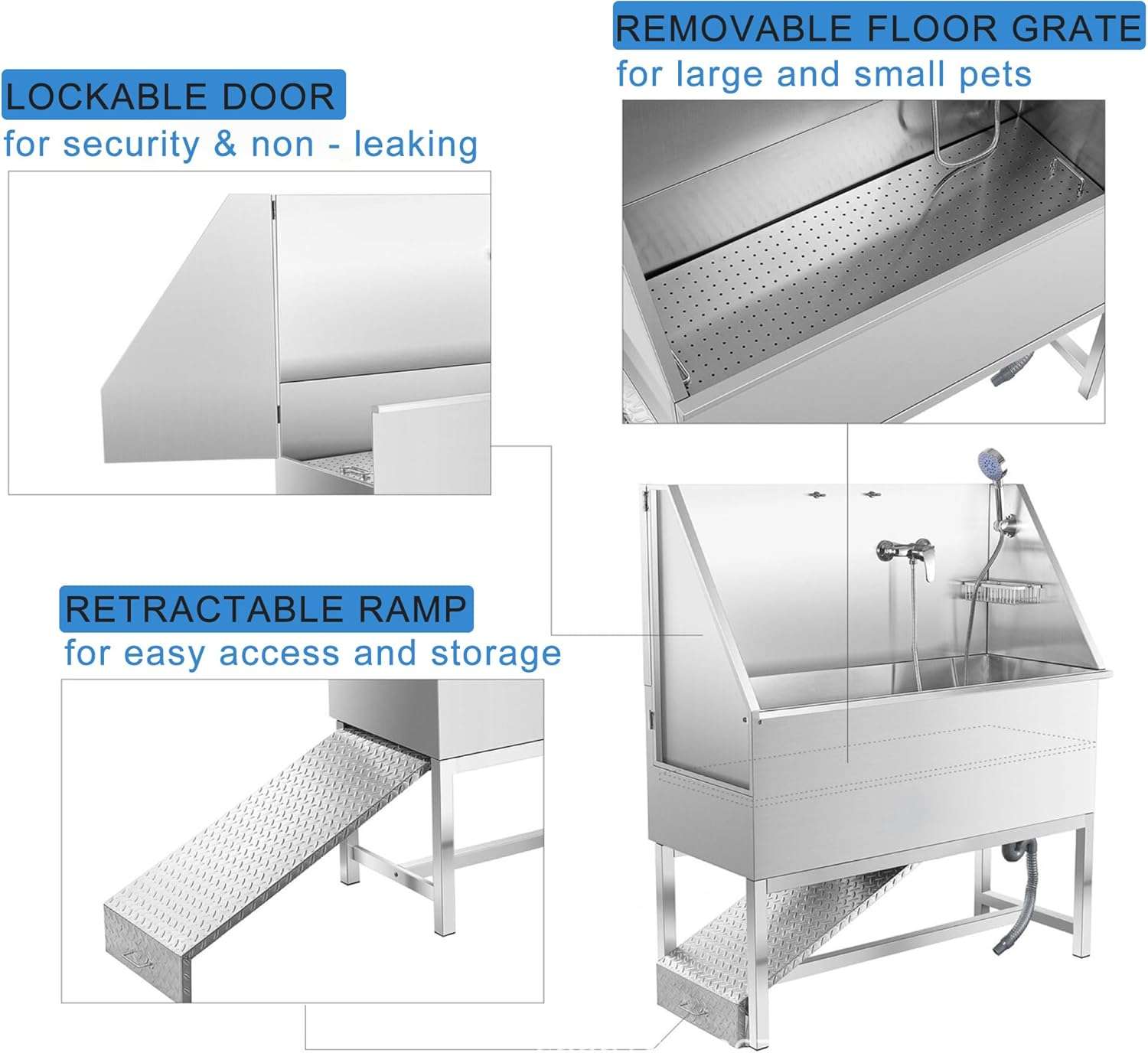 Puerta de Seguridad: Puerta lateral con cerradura firme que mantiene al perro y al agua dentro de la tina durante el baño.