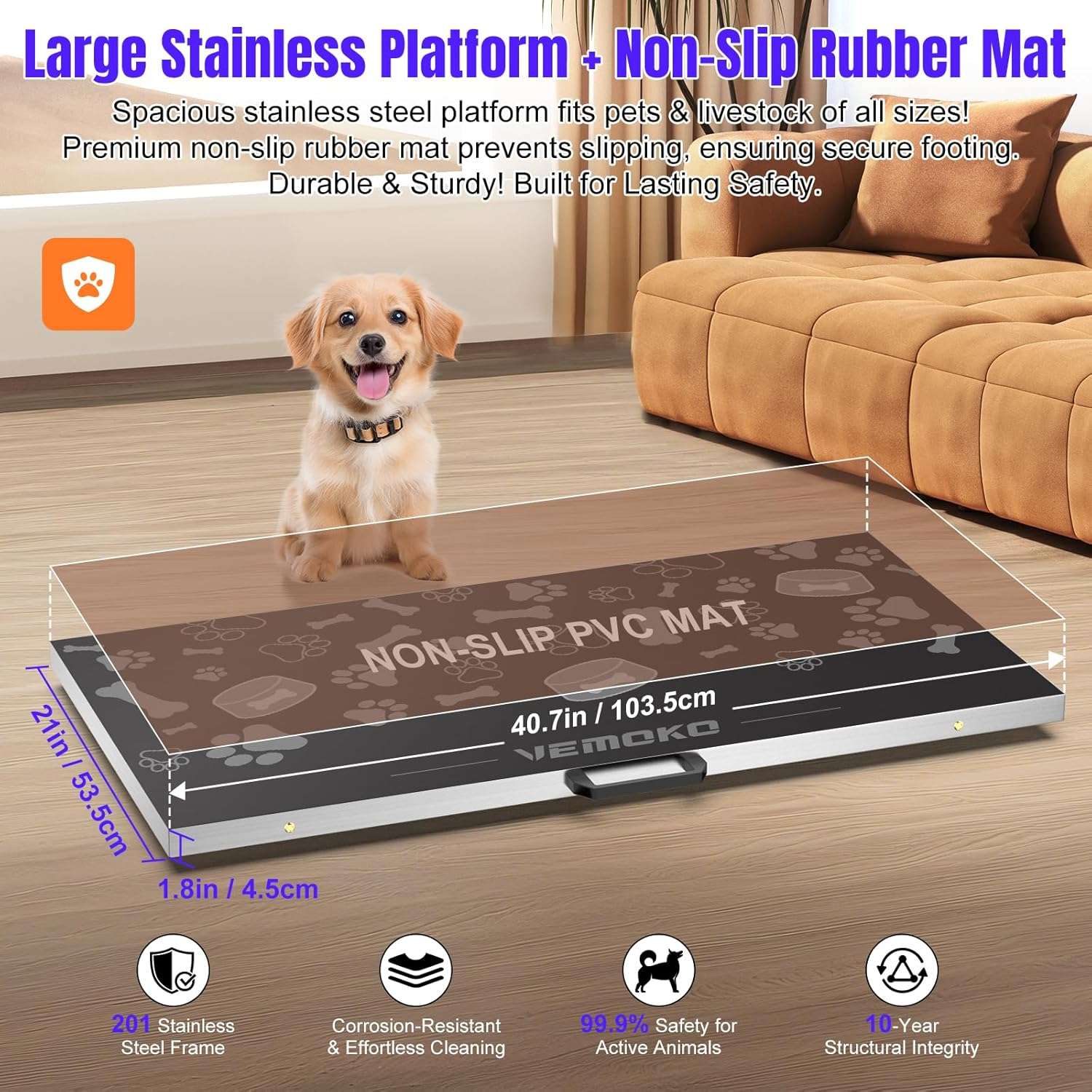 Seguridad Antideslizante y Acero Inoxidable: Incluye una alfombrilla de PVC antideslizante extraible que reduce en un 92 por ciento el riesgo de resbalones, asegurando patas y cascos. La construccion de acero inoxidable y sus 4 pies reforzados resisten la corrosion y son faciles de limpiar, ideal para entornos como graneros o clinicas.