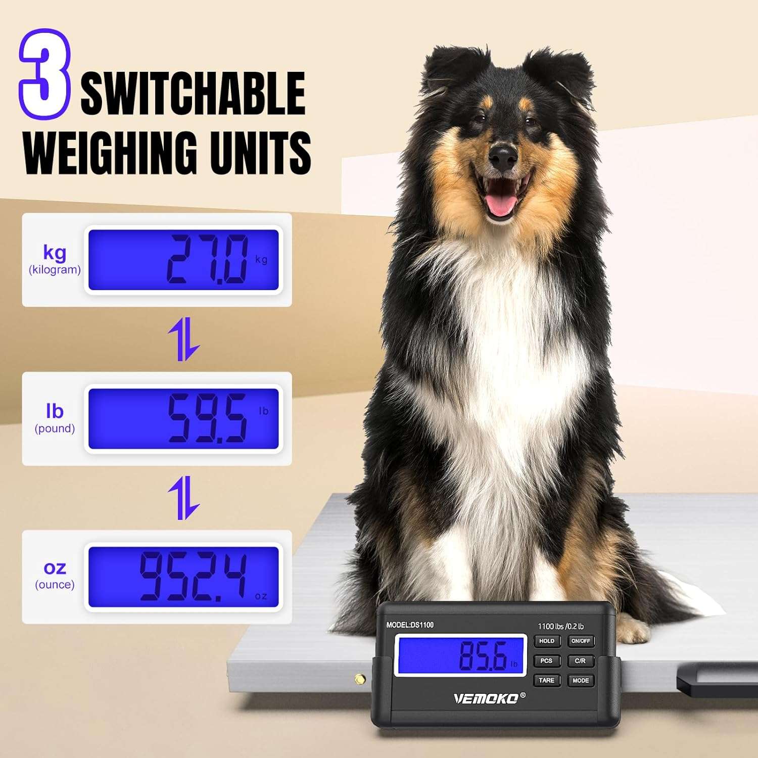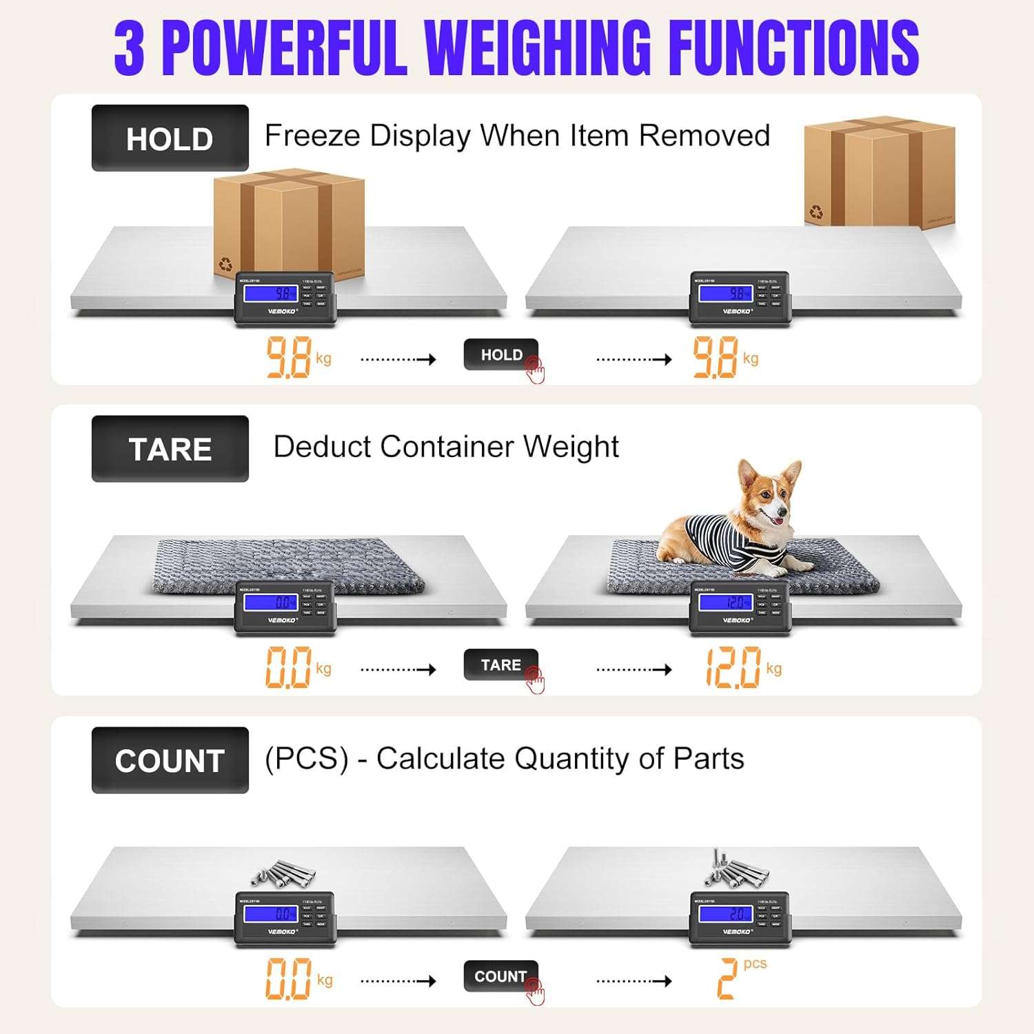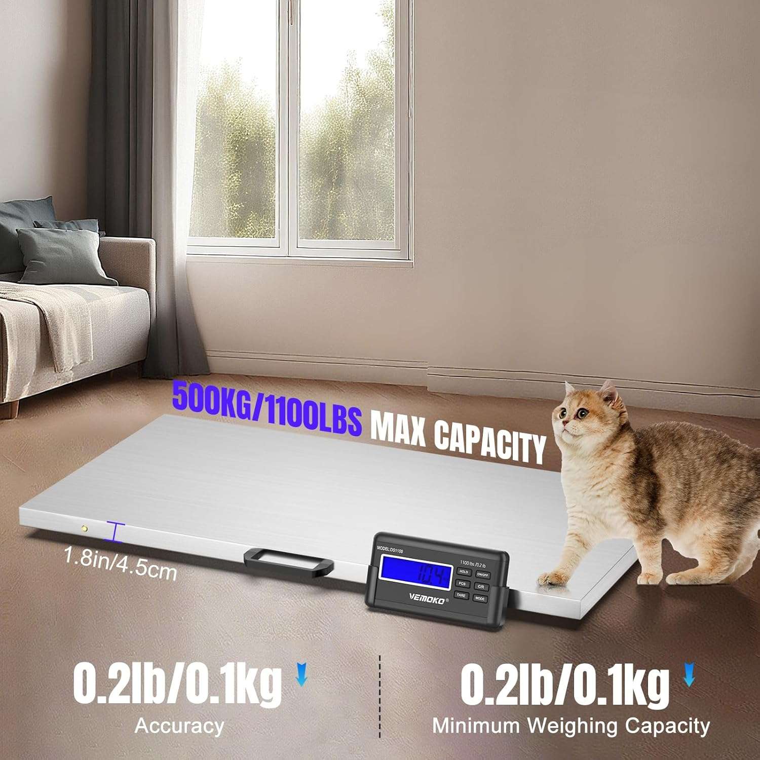 Modos Duales para Animales y Paqueteria: Versatilidad total. El Modo Animal estabiliza el peso de mascotas o ganado en movimiento (funcion Hold), mientras que el Modo Paquete ofrece precision para envios o carga estatica. Incluye funcion Tara para descontar el peso de cajas o jaulas y funcion de conteo para piezas a granel.