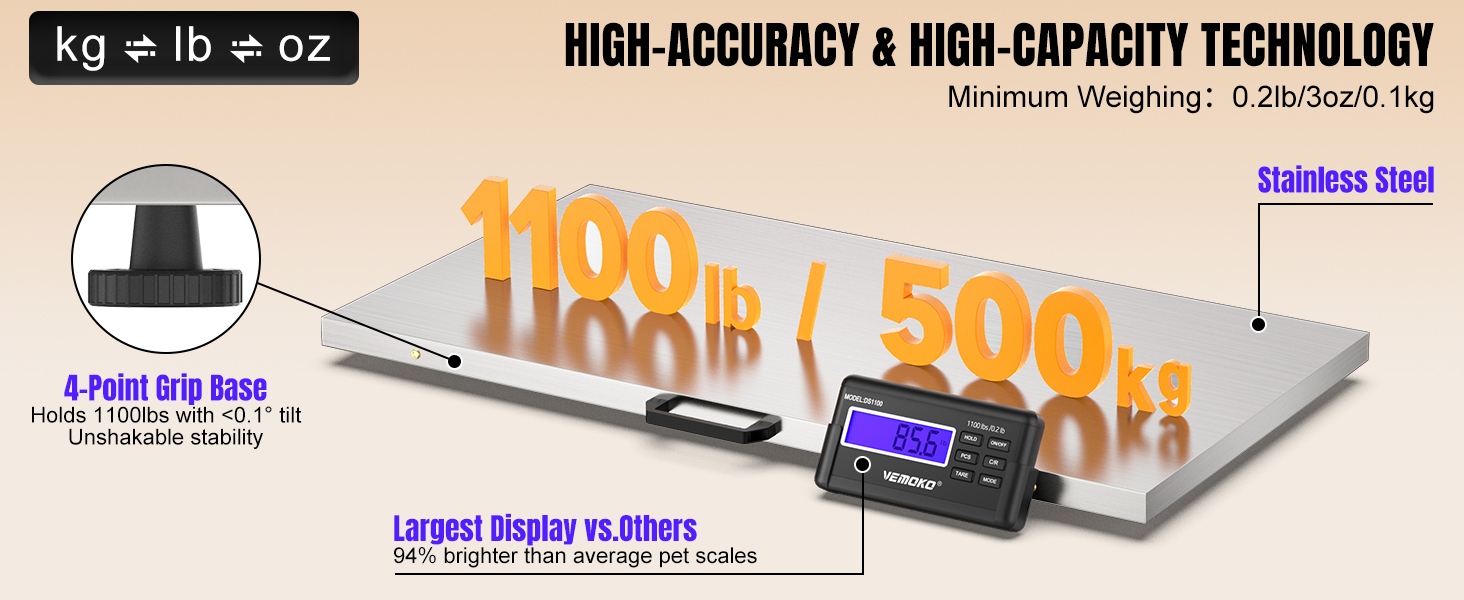 Capacidad Industrial de 500 Kilos y Alta Precision: Su plataforma de acero inoxidable grado 201 mide 103 por 53 centimetros. Soporta hasta 500 kilos (1100 libras) con una precision de 100 gramos. Es lo suficientemente amplia para pesar 3 perros grandes o 2 cerdos a la vez, cumpliendo con estandares agricolas.
