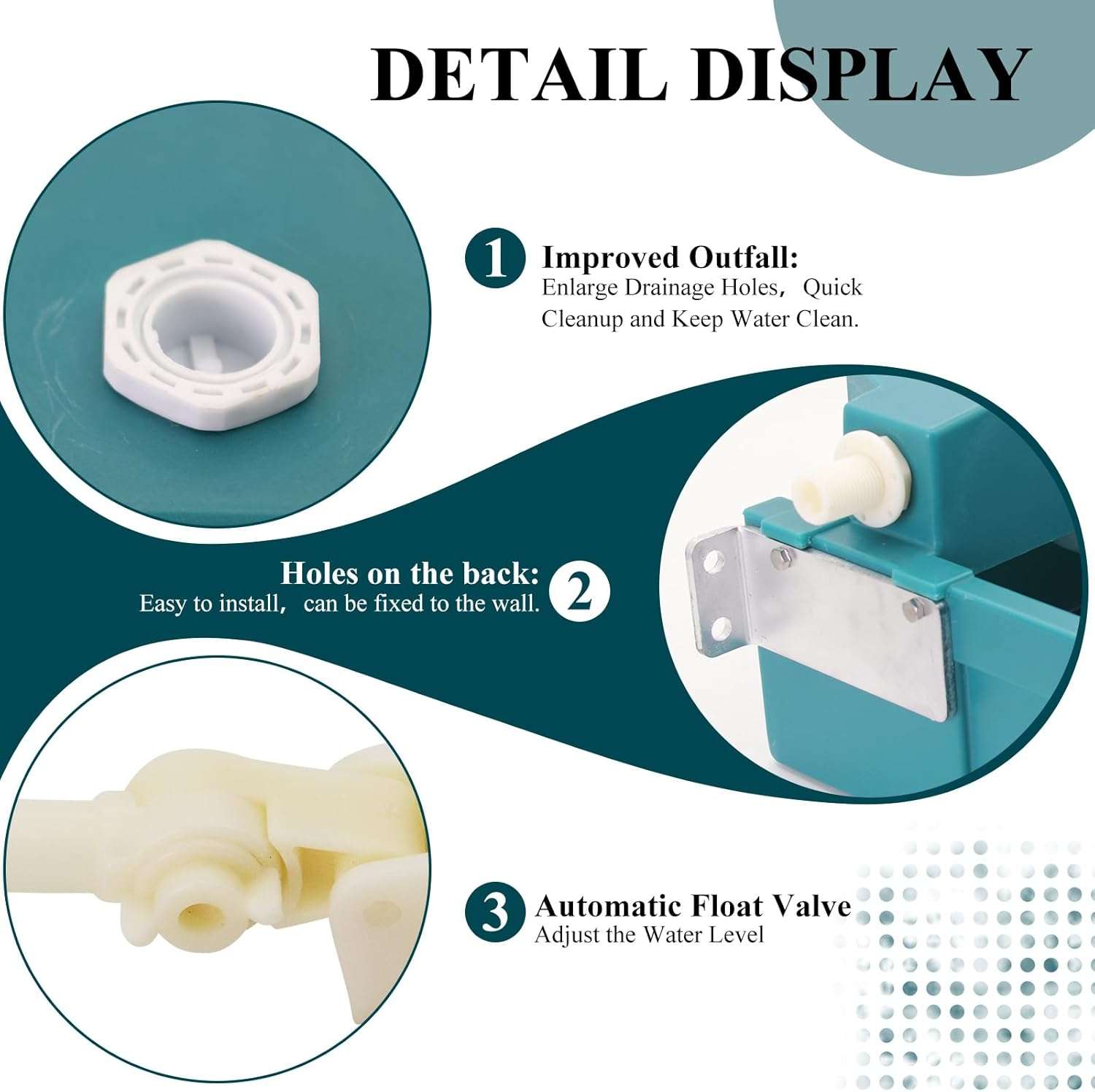 Este bebedero funciona con un sistema de bola flotante totalmente efectivo. Cuando el nivel baja el flotador desciende abriendo la valvula para dejar entrar agua limpia. Al llenarse la varilla sube y el piston de goma corta el paso de inmediato ahorrando mas de un 30 por ciento de agua y reduciendo los derrames en tu terreno.