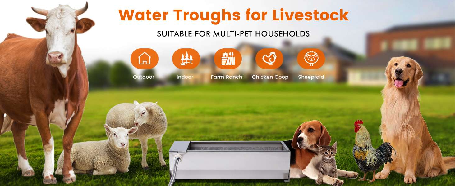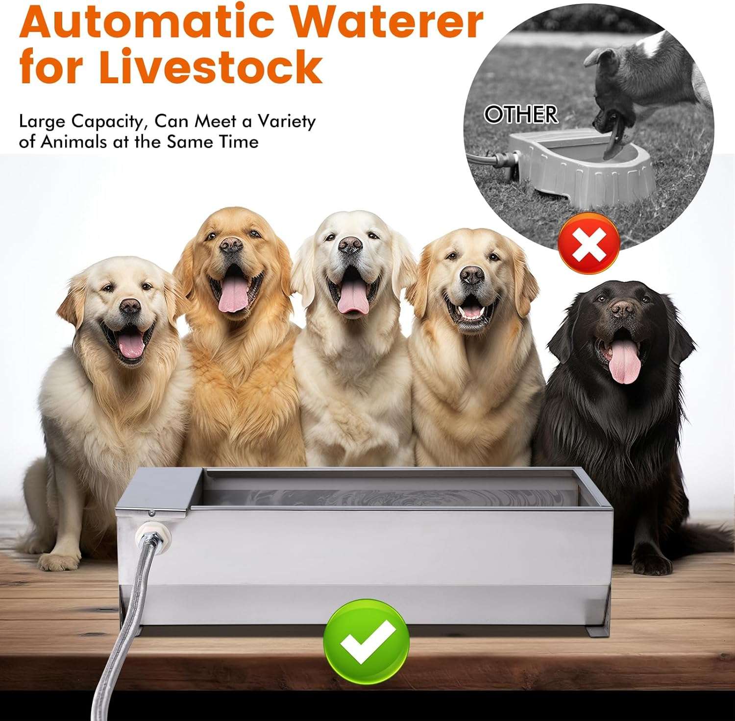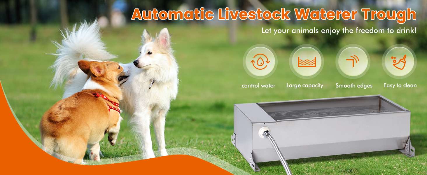 El sistema funciona con una válvula de flotador controlada que mantiene el nivel de agua constante sin necesidad de electricidad. A medida que el animal bebe, el agua se repone suavemente y se corta al llenarse. Además, el borde del acero ha sido pulido para ser liso, evitando arañazos o cortes en el hocico de tu mascota, garantizando un ambiente de bebida seguro e higiénico en patios, jardines o granjas.