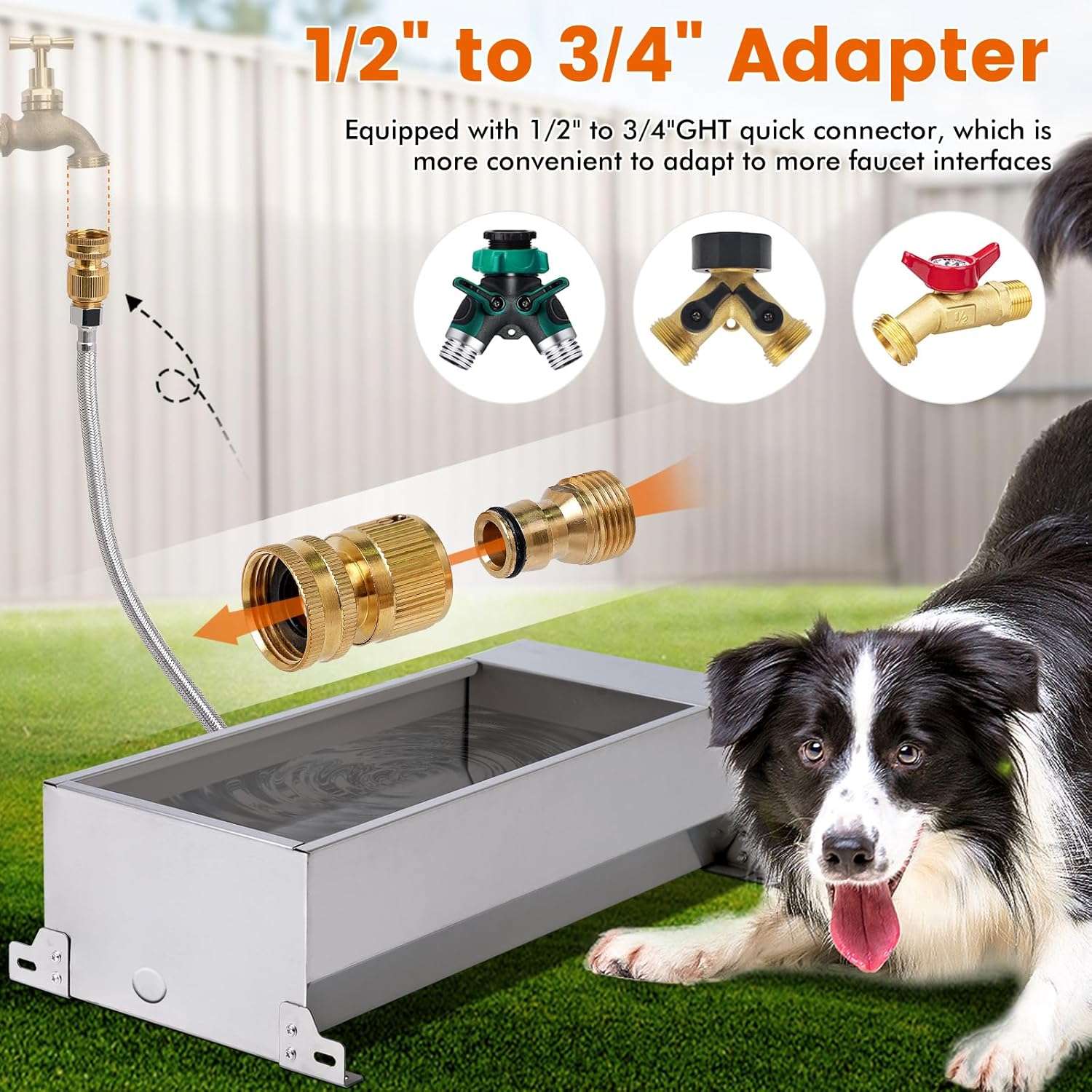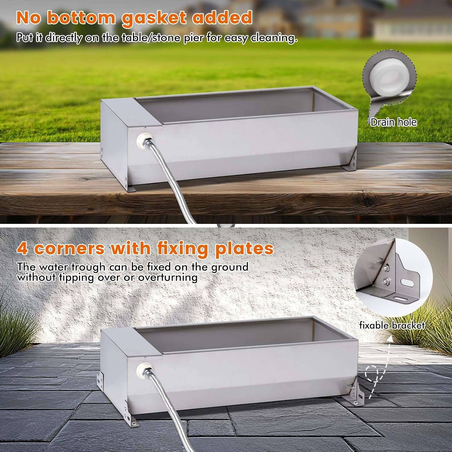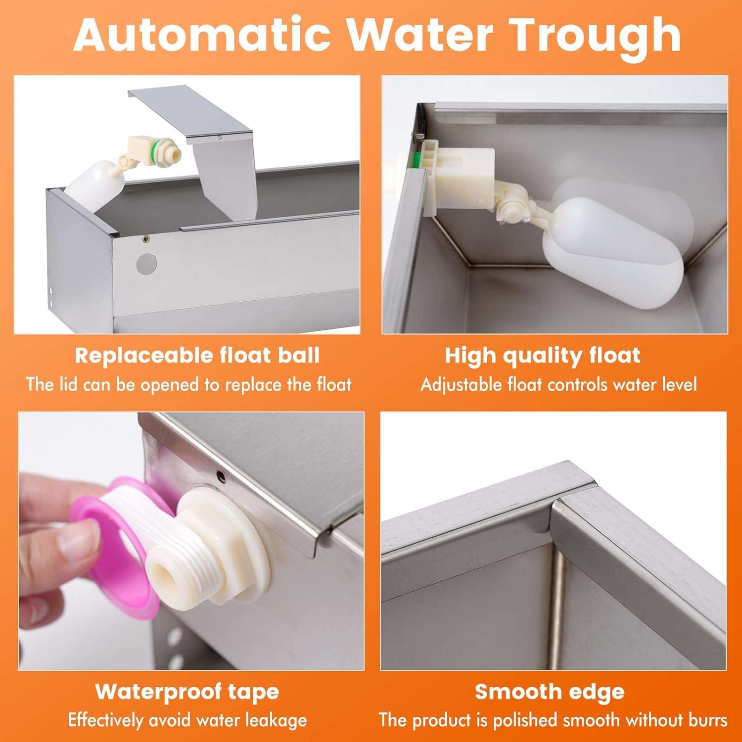 El sistema funciona con una válvula de flotador controlada que mantiene el nivel de agua constante sin necesidad de electricidad. A medida que el animal bebe, el agua se repone suavemente y se corta al llenarse. Además, el borde del acero ha sido pulido para ser liso, evitando arañazos o cortes en el hocico de tu mascota, garantizando un ambiente de bebida seguro e higiénico en patios, jardines o granjas.