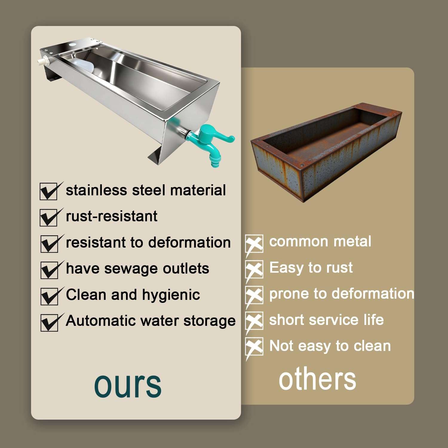 Acero Inoxidable Especial para Exterior Construido para soportar los climas mas extremos del pais. A diferencia de los materiales galvanizados este bebedero esta fabricado en acero inoxidable de alta calidad. Resiste la luz solar directa y la humedad extrema funcionando a la perfeccion en pastos embarrados o corrales ruidosos sin oxidarse jamas.