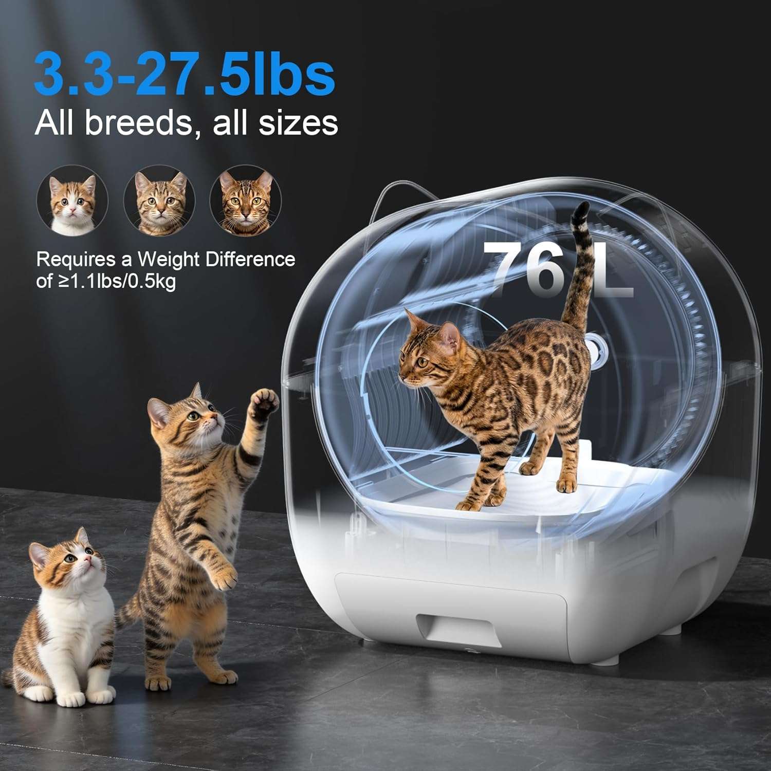 Esta caja de arena automática y autolimpiante es la opción mas profesional y buscada en Chile para hogares con multiples gatos Su estructura cuenta con dimensiones exactas de 66 centimetros de largo 50 centimetros de ancho y 55 centimetros de alto ofreciendo un tambor extra grande de 76 litros y un basurero de 13 litros Este equipo soporta felinos desde un kilo y medio hasta doce kilos y medio manejando hasta 15 dias de uso continuo sin complicaciones siendo la solucion ideal para dueños ocupados