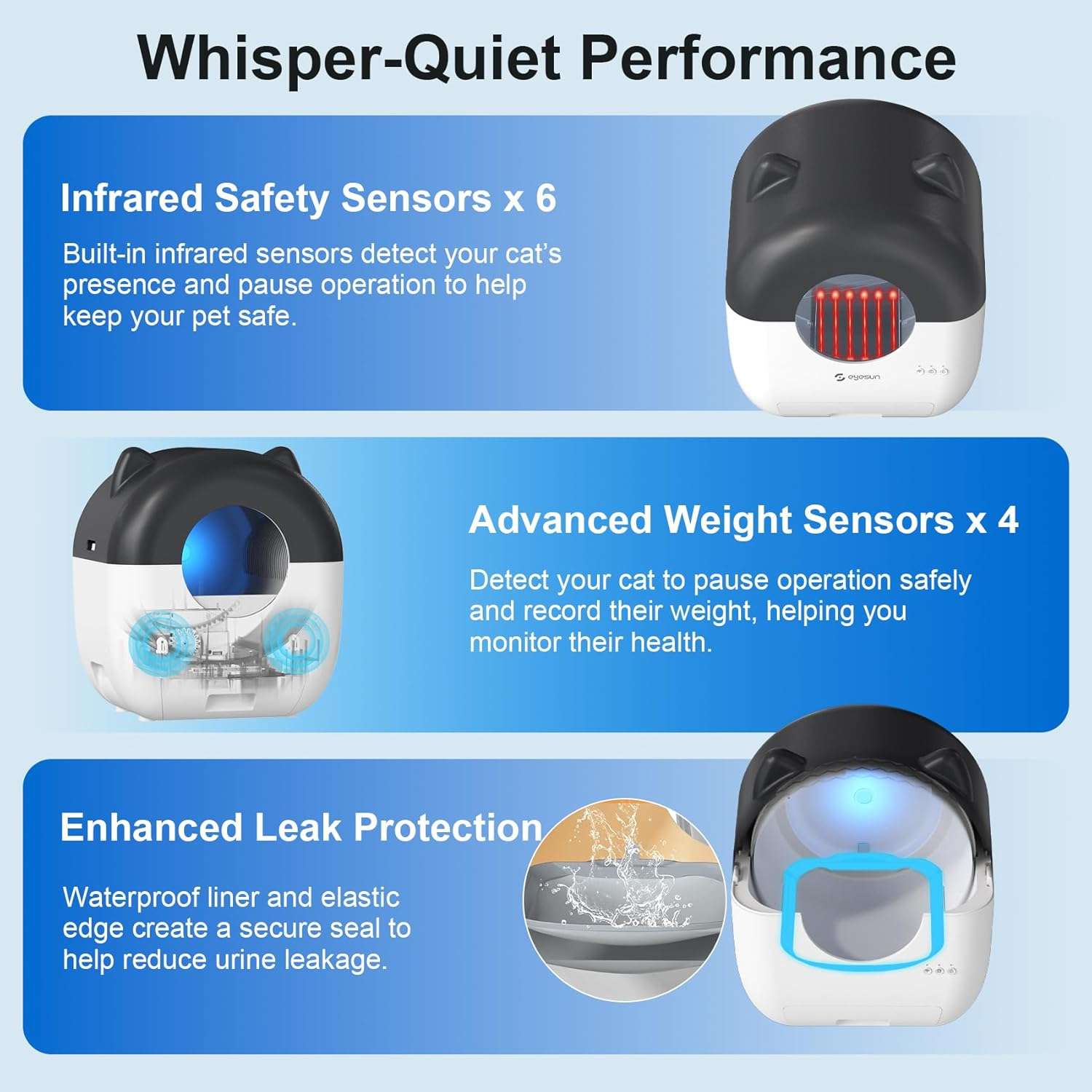 Para mantener a su amigo felino totalmente seguro este arenero inteligente esta construido con dos pares de sensores infrarrojos y dos sensores de peso que detectan con precision la presencia de su mascota ya sea dentro de la estructura o pisando la base Si su gato interactua con la unidad durante el funcionamiento el sistema se detendra inmediatamente para garantizar su seguridad poniendo la salud de su animal en primer lugar en todo momento