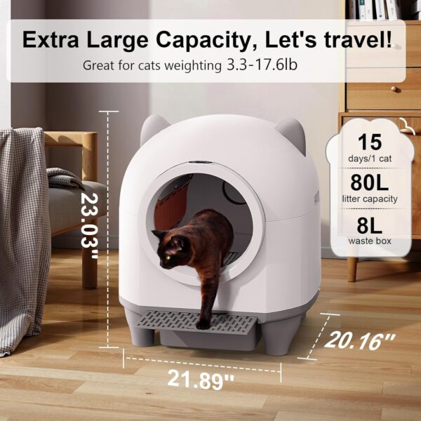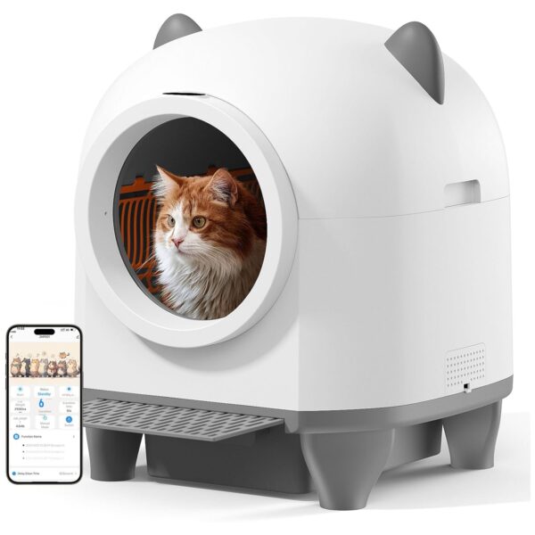 Con una capacidad extra grande de 80 litros de arena y 8 litros de residuos, es ideal para familias con gatos de entre 3.3 y 17.6 libras, ofreciendo hasta 15 días de uso sin preocupaciones, perfecto para quienes tienen un estilo de vida ocupado o planean viajes cortos.Su sistema de autolimpieza utiliza sensores y un mecanismo giratorio que separa la arena limpia de la sucia, almacenando esta última en un contenedor sellado, lo que elimina la necesidad de recoger la arena diariamente y reduce los olores.