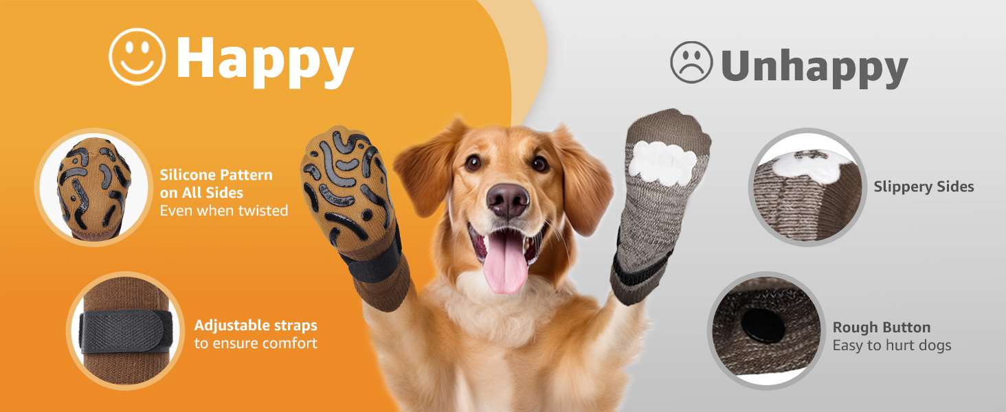 Fijación Segura: Cada calcetín incluye una correa de velcro ajustable que asegura la prenda al tobillo. Tu perro podrá caminar y jugar sin que los calcetines queden tirados por la casa.