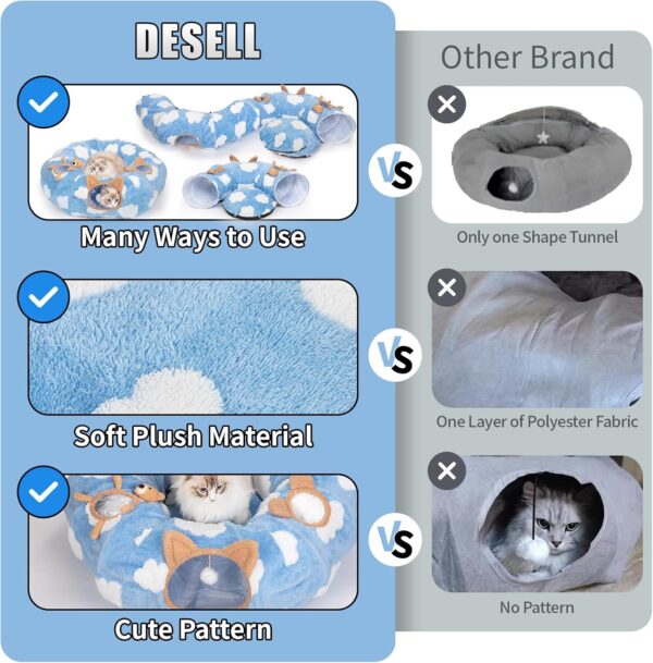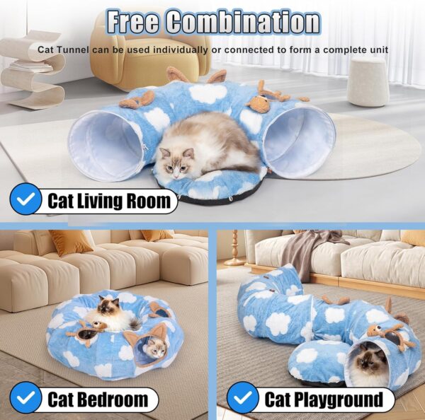 2 TÚNELES CON CAMA: Este túnel consta de dos túneles semicirculares y un cojín redondo, que se puede moldear en un diseño circular o en forma de S para satisfacer las necesidades de juego de los gatitos. El cojín medio mejorado está relleno de algodón grueso, proporcionando un lugar de descanso más cómodo, extraíble y lavable a máquina