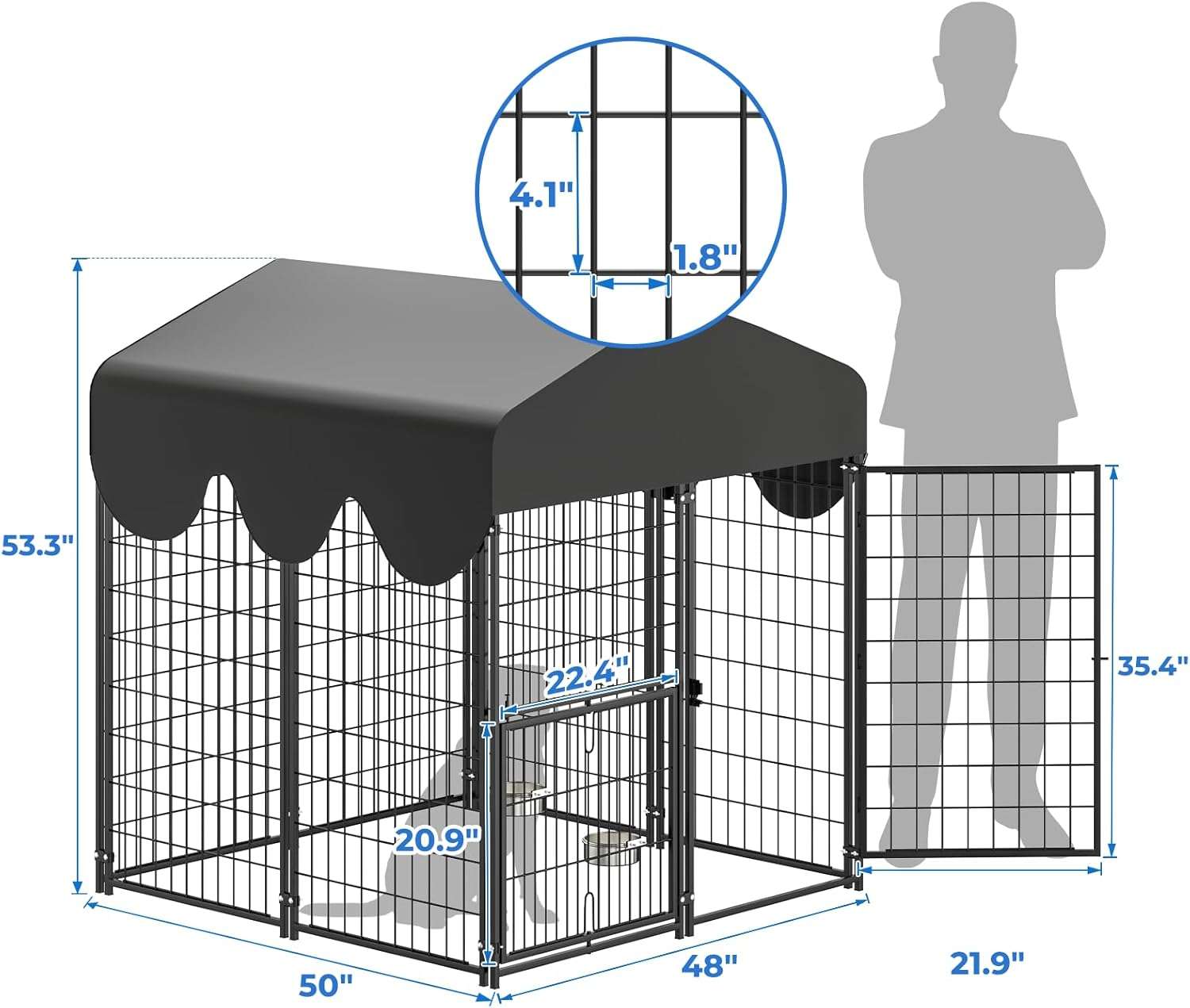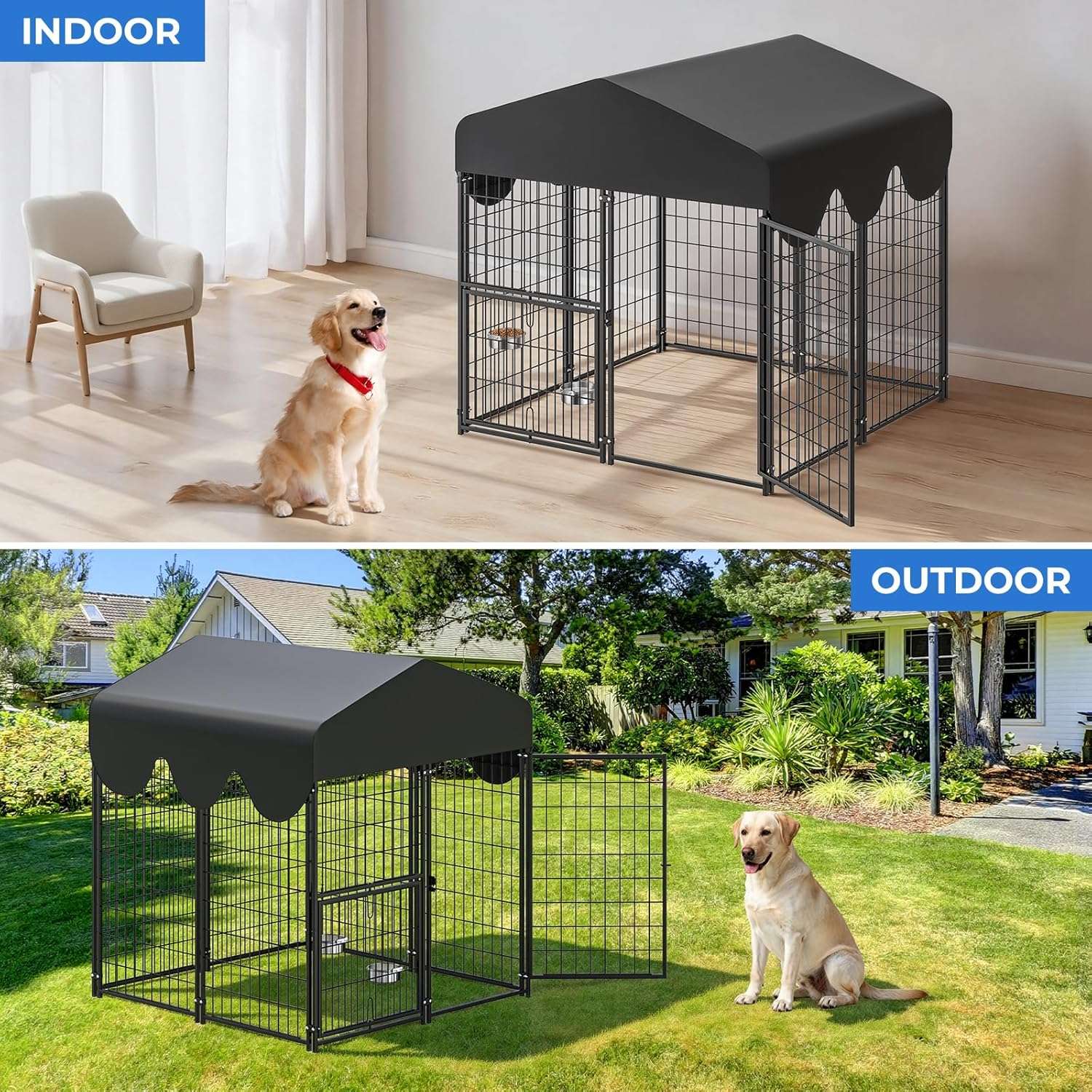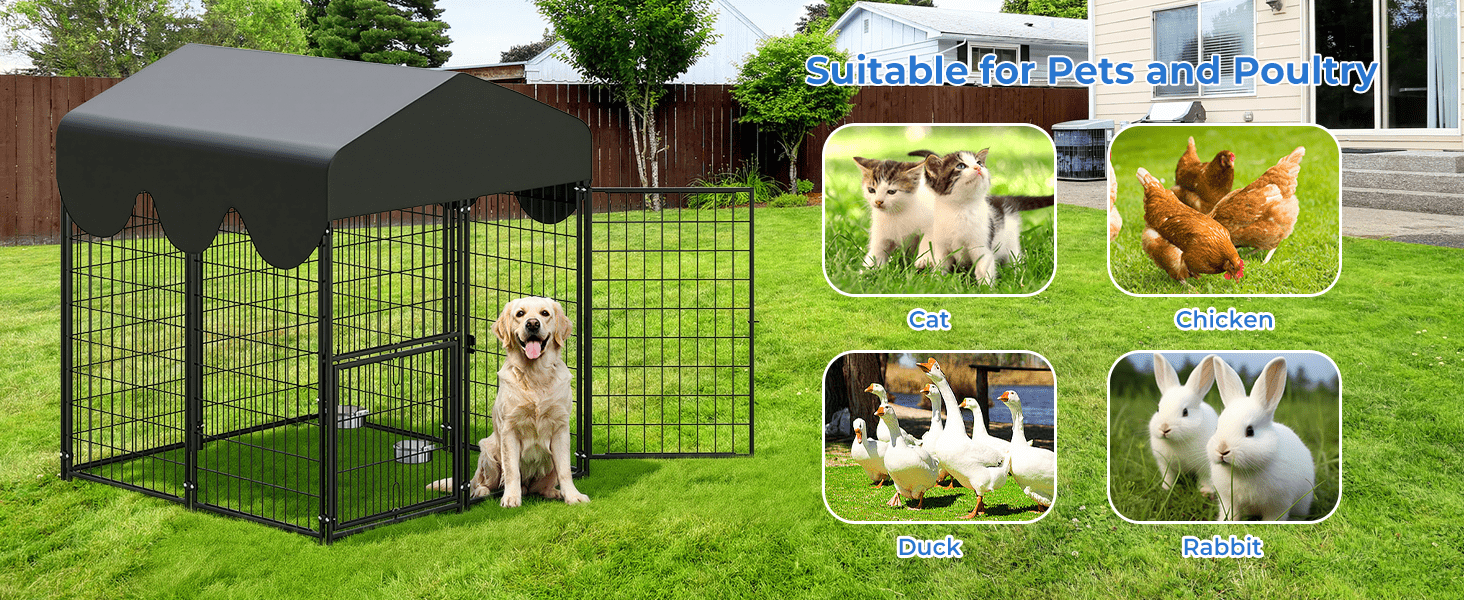 Bríndale a tu mascota un espacio propio, súper seguro y fabricado para durar toda la vida. Este robusto canil de acero es la solución definitiva para mantener a tu perro protegido en el patio. Su diseño innovador con techo protector y sistema de alimentación integrado lo convierte en el recinto exterior más completo y práctico del mercado.