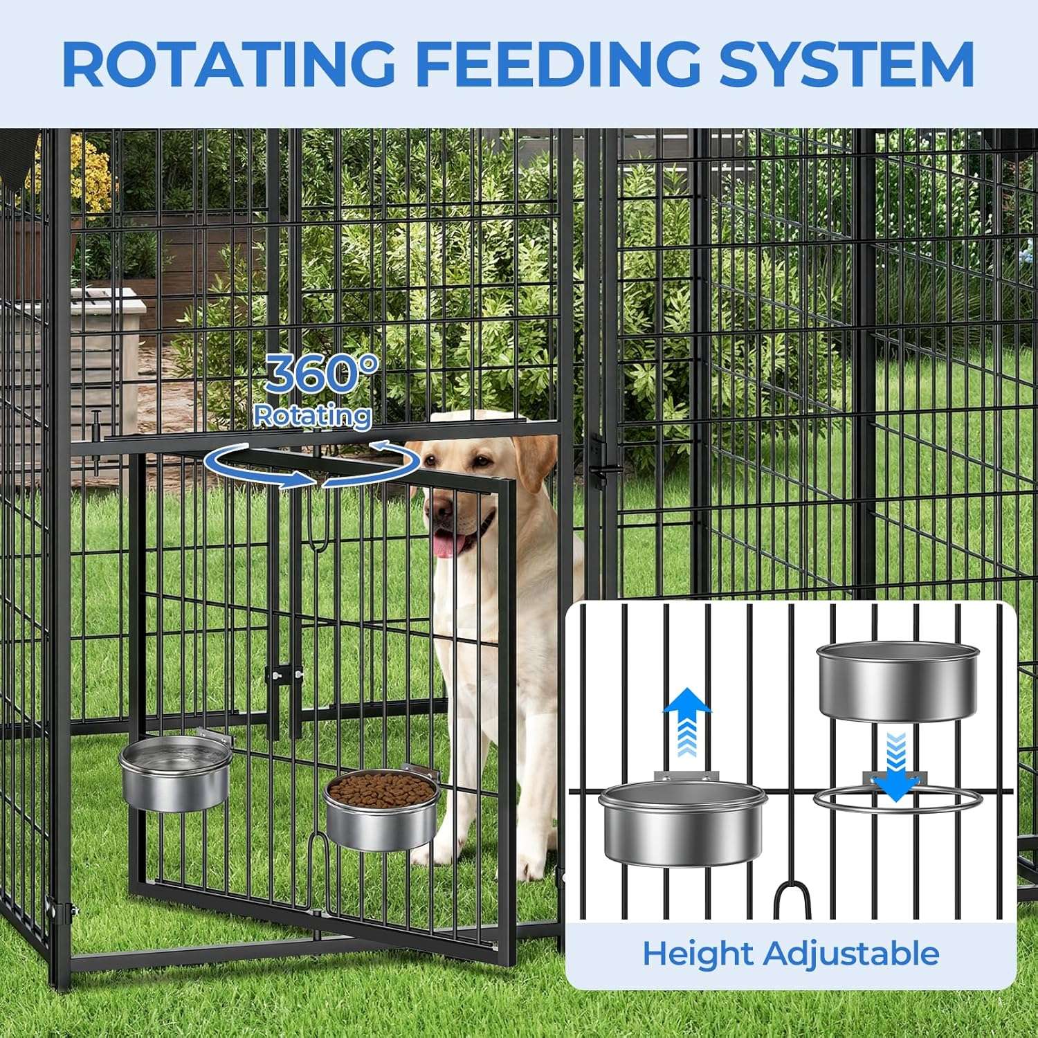 Puerta Giratoria en 360 Grados y Doble Comedero: Alimentar a tu mascota nunca fue tan fácil. Incluye un sistema de puerta giratoria con dos platos de acero inoxidable. Esto te permite servir la comida y el agua desde el exterior simplemente girando la estructura, sin necesidad de abrir la puerta principal. Además, cuenta con un mecanismo de bloqueo por gravedad para máxima seguridad.