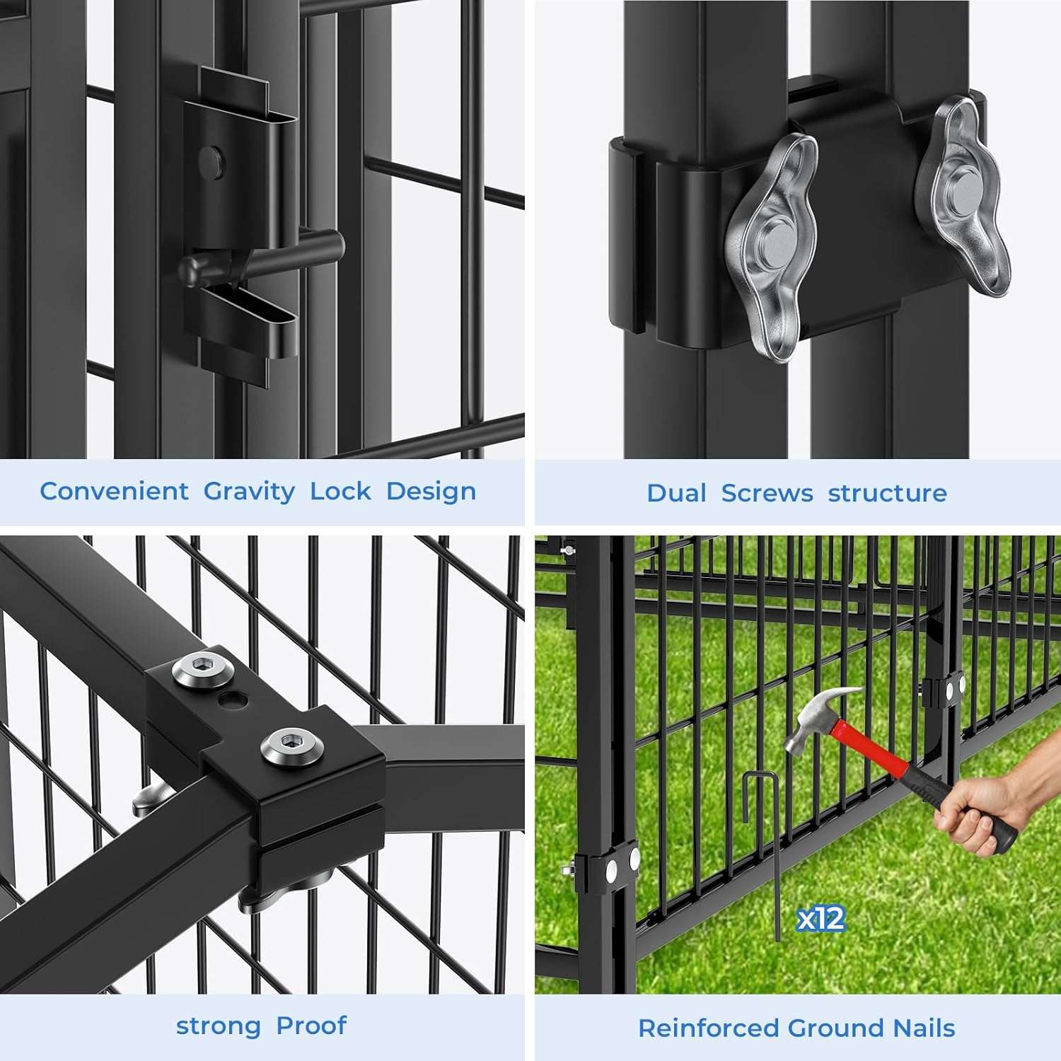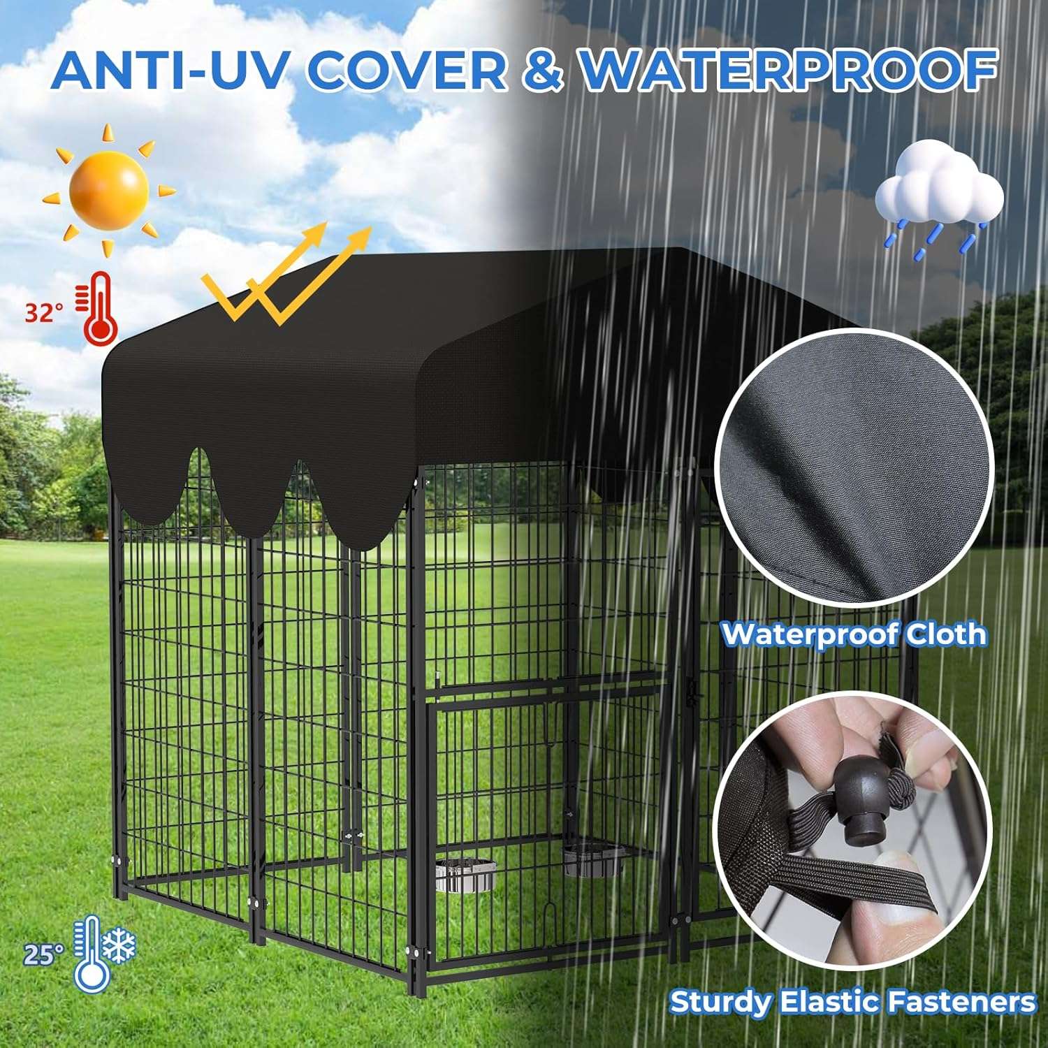 Estructura de Acero Súper Resistente: Olvídate de los daños por mordeduras. Está construido con tubos cuadrados de acero de 15 milímetros de grosor, soldaduras reforzadas y revestimiento antioxidante. Su acabado especial resiste arañazos y cuenta con 12 estacas de fijación para anclarlo firmemente al suelo de tu patio.