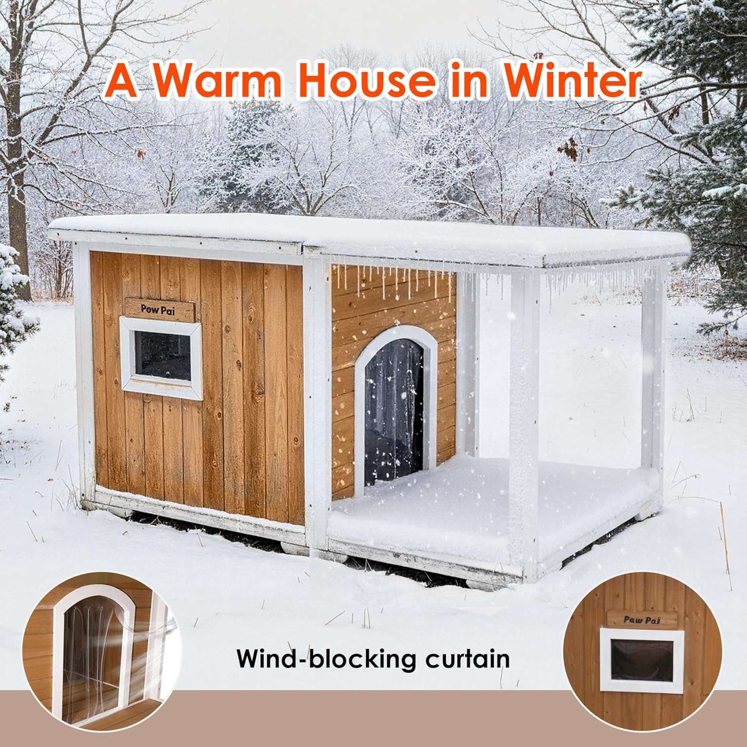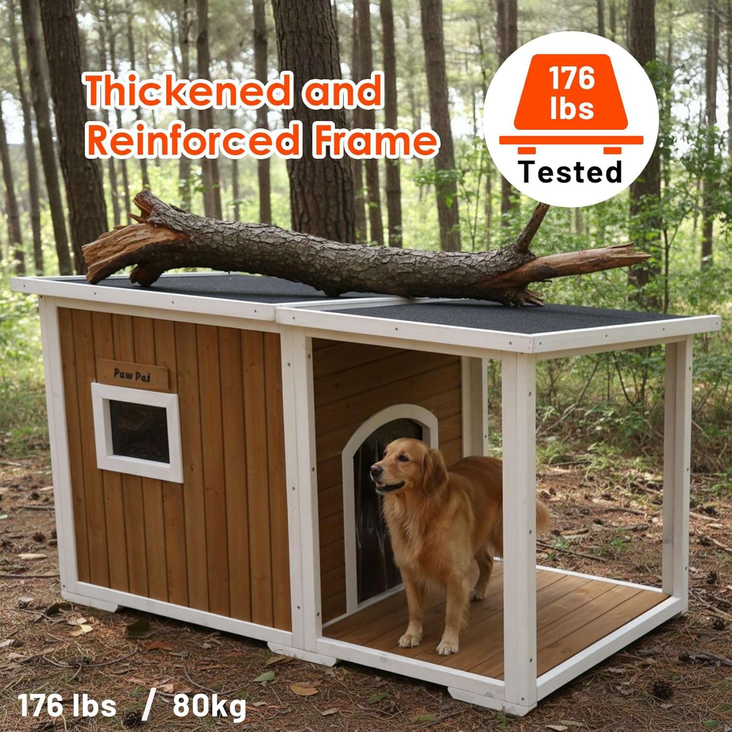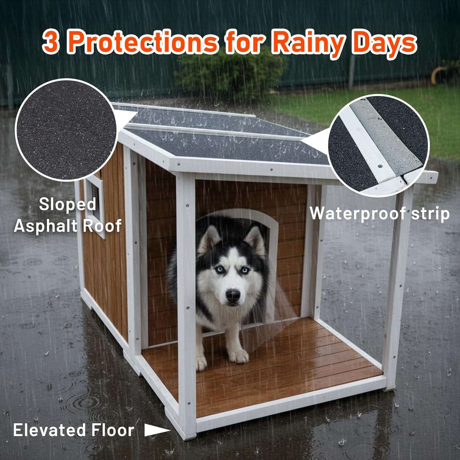 Fabricada con madera solida de primera calidad esta perrera esta diseñada para soportar hasta sesenta y ocho kilos de peso sin deformarse ni agrietarse resistiendo años de sol fuerte lluvia y nieve Para ofrecer la mejor proteccion contra el clima cuenta con un techo de asfalto inclinado una tira de bloqueo de lluvia y una gruesa cortina protectora en la puerta que bloquea las corrientes de aire manteniendo el interior seco y calido sin importar la temporada del año
