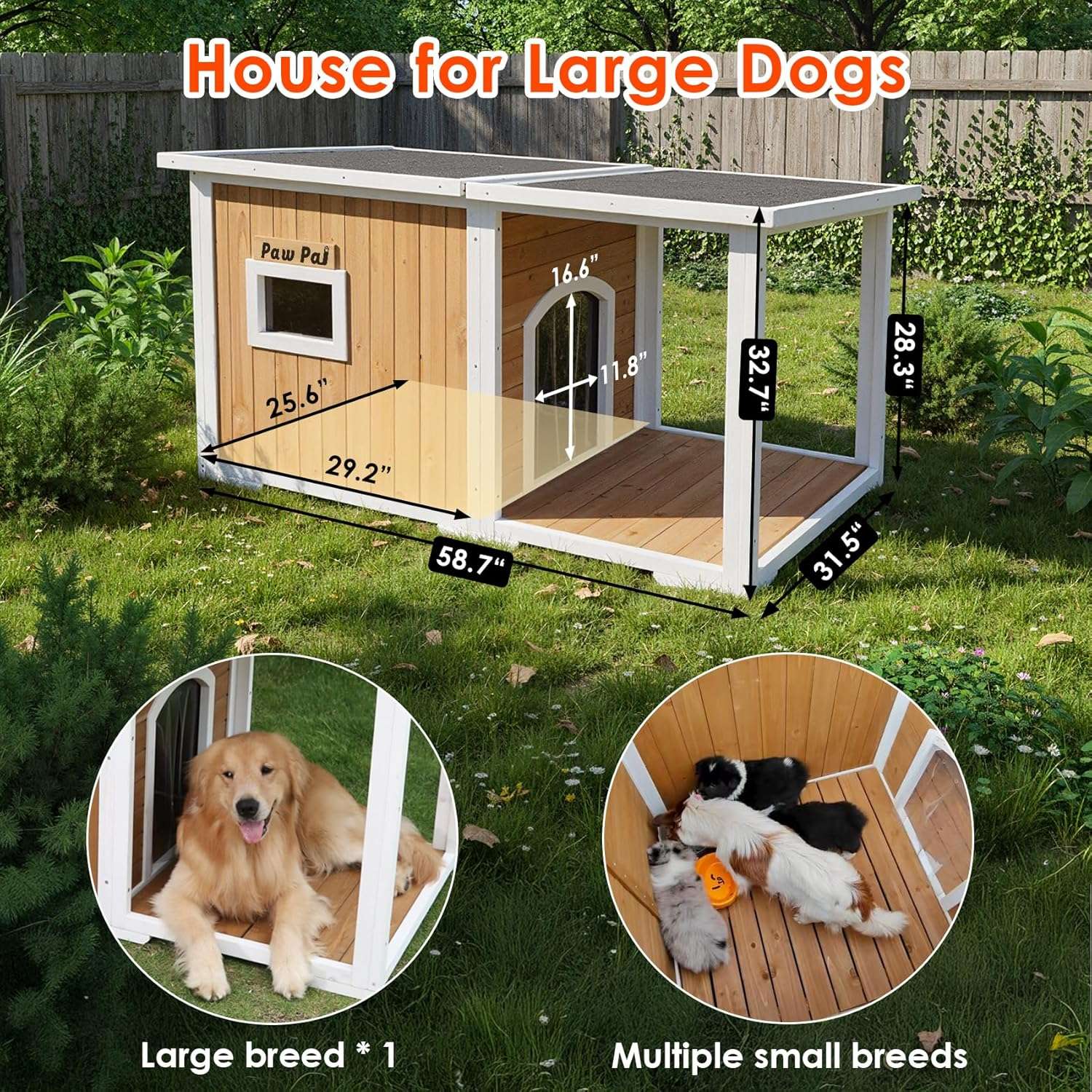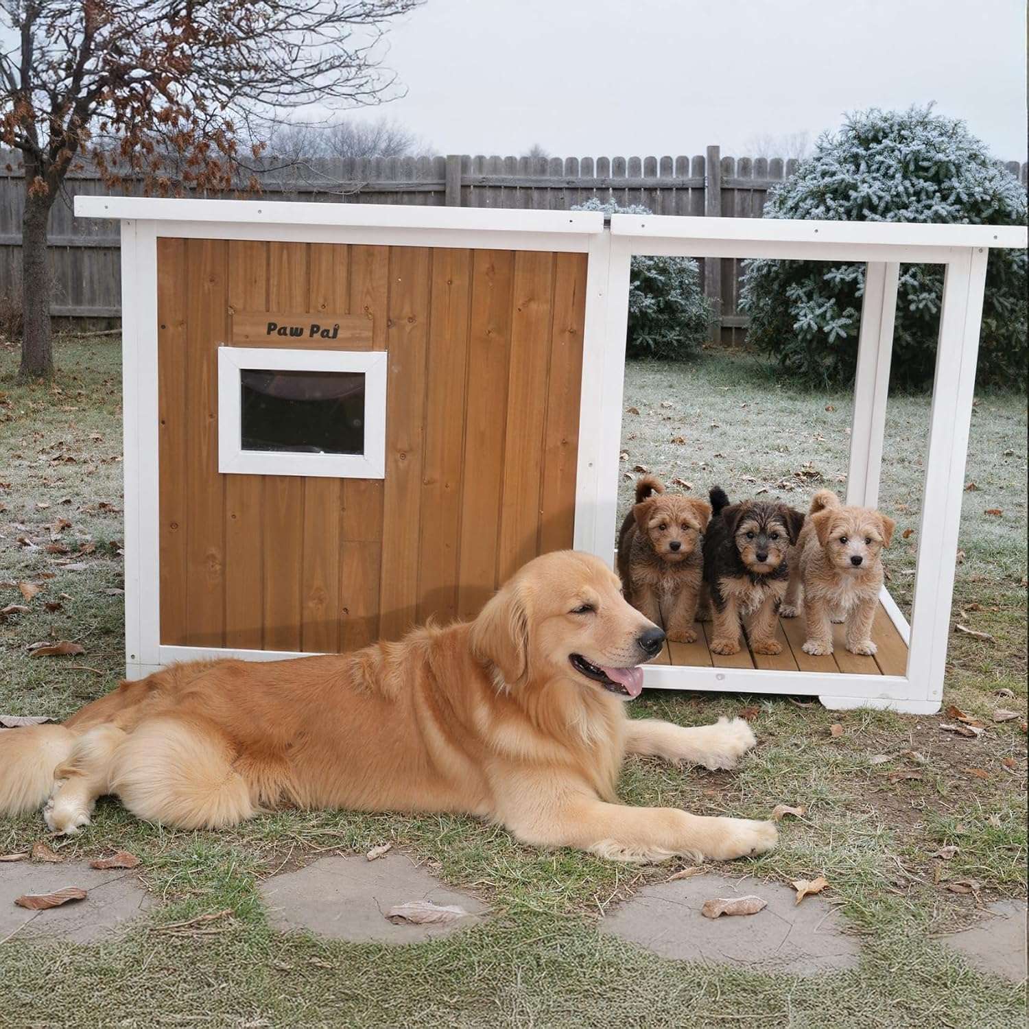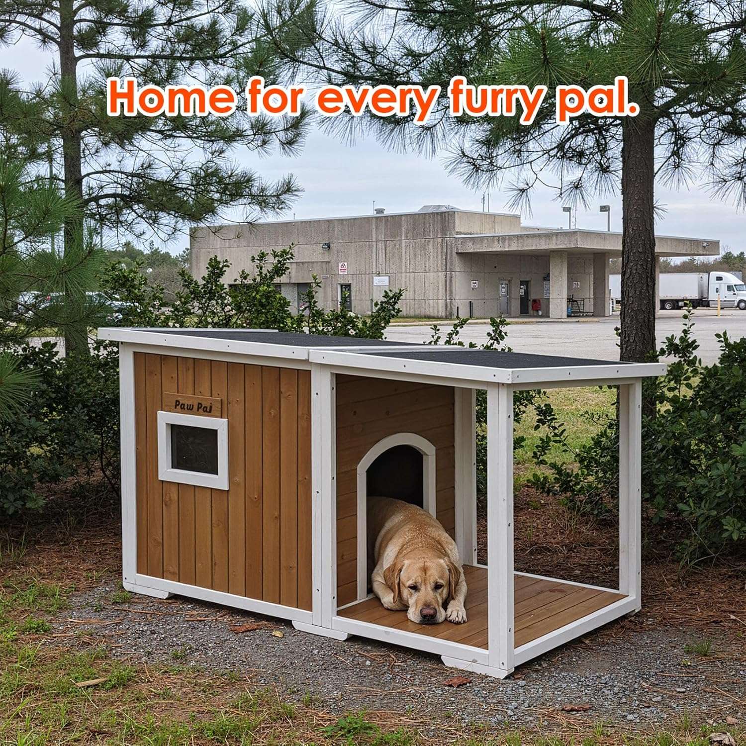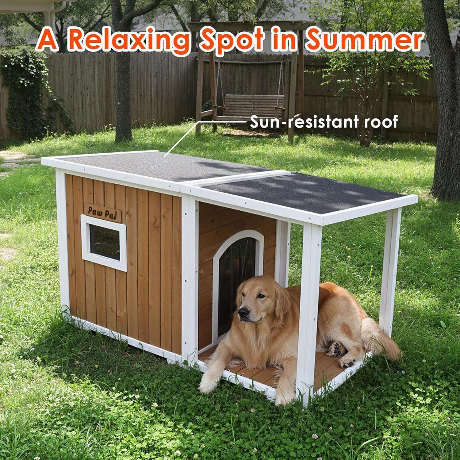 Fabricada con madera solida de primera calidad esta perrera esta diseñada para soportar hasta sesenta y ocho kilos de peso sin deformarse ni agrietarse resistiendo años de sol fuerte lluvia y nieve Para ofrecer la mejor proteccion contra el clima cuenta con un techo de asfalto inclinado una tira de bloqueo de lluvia y una gruesa cortina protectora en la puerta que bloquea las corrientes de aire manteniendo el interior seco y calido sin importar la temporada del año