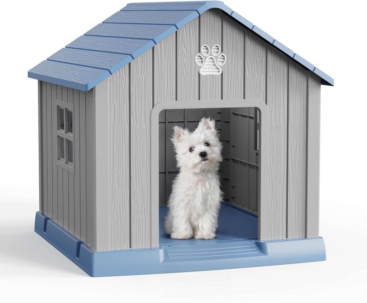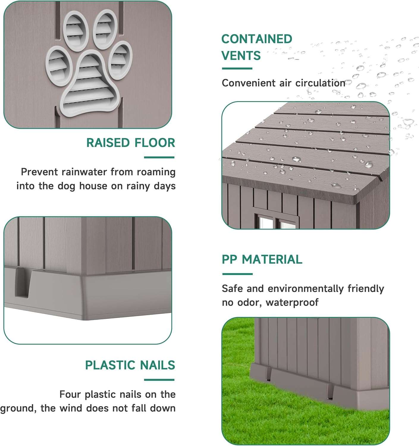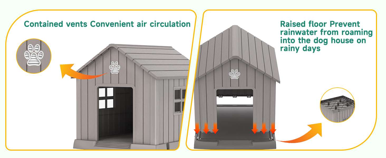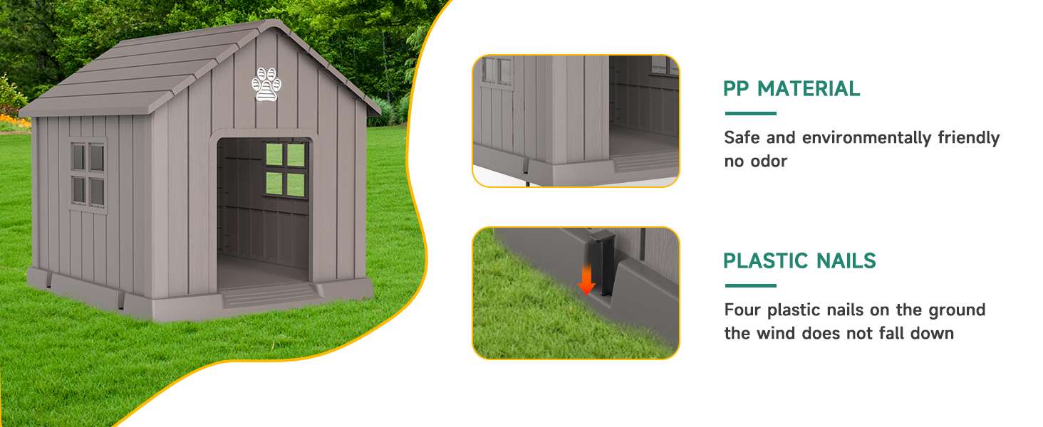 Piso Elevado y Estructura Firme: La base incluye cinco pilares reforzados que elevan el suelo, aislando a tu mascota del frío y la humedad del pasto o la tierra. Además, el kit incluye cuatro estacas de plástico duro para asegurar la casa firmemente al césped, dándole gran estabilidad frente a perros enérgicos.