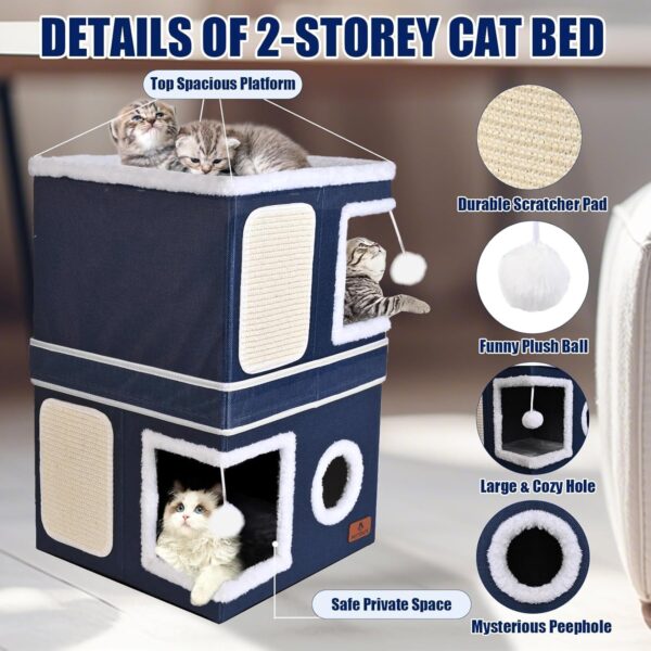 Casa para gatos de 2 pisos para varios gatos: la cama para gatos de interior de 2 pisos ofrece un refugio acogedor para que los gatitos y gatos adultos se escondan, jueguen y descansen. Puede acomodar de 3 a 4 gatos acostados o descansando al mismo tiempo, por lo que es perfecto para hogares con varios gatos.