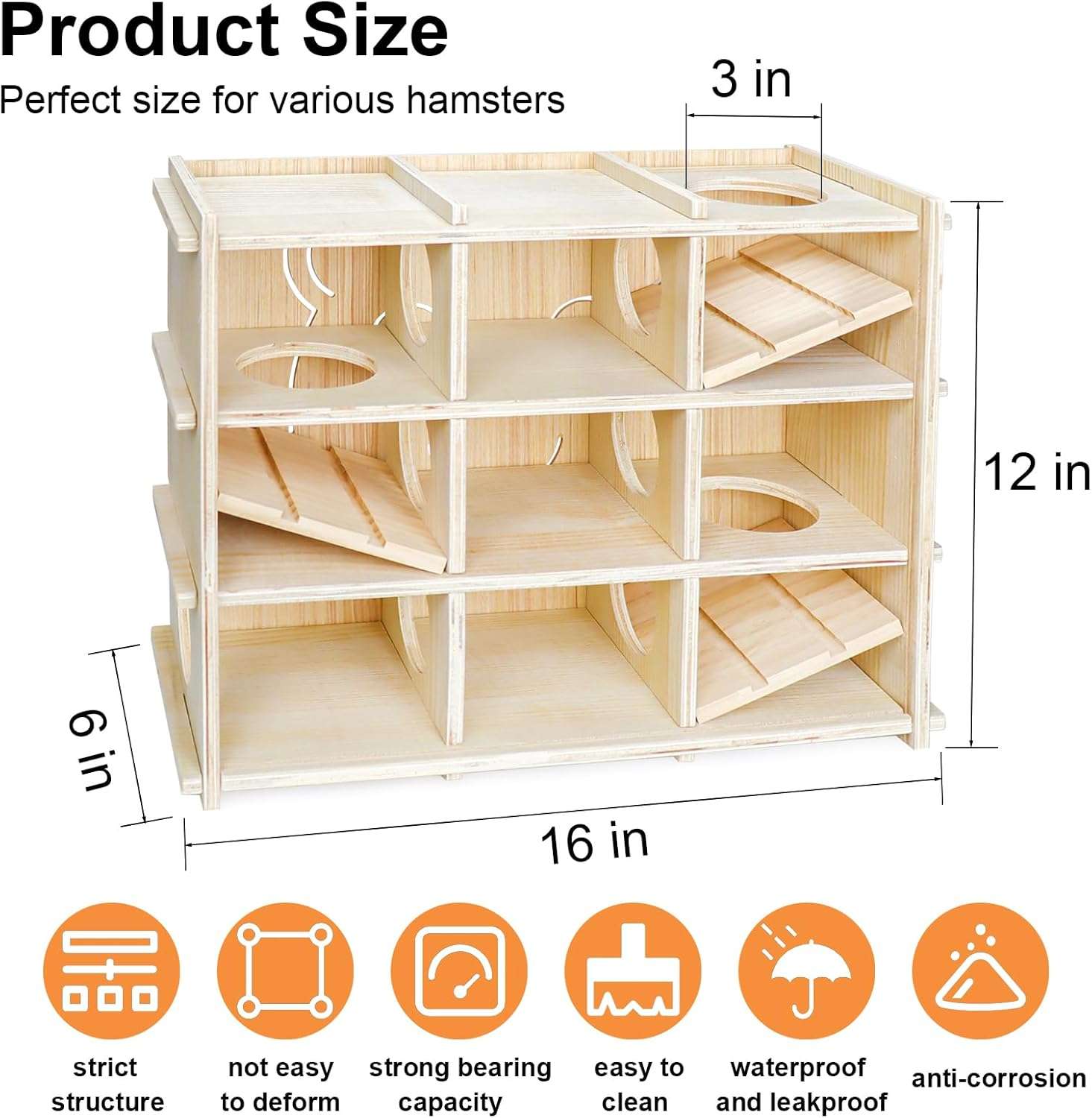 Materiales y fabricación de alta calidad: el juguete de exploración de hámster está hecho de madera de alta calidad resistente al desgaste. El proceso de montaje es simple y rápido. Después del montaje, la estructura es compacta, no se deforma fácilmente, impermeable y a prueba de fugas, y tiene una fuerte capacidad de carga.