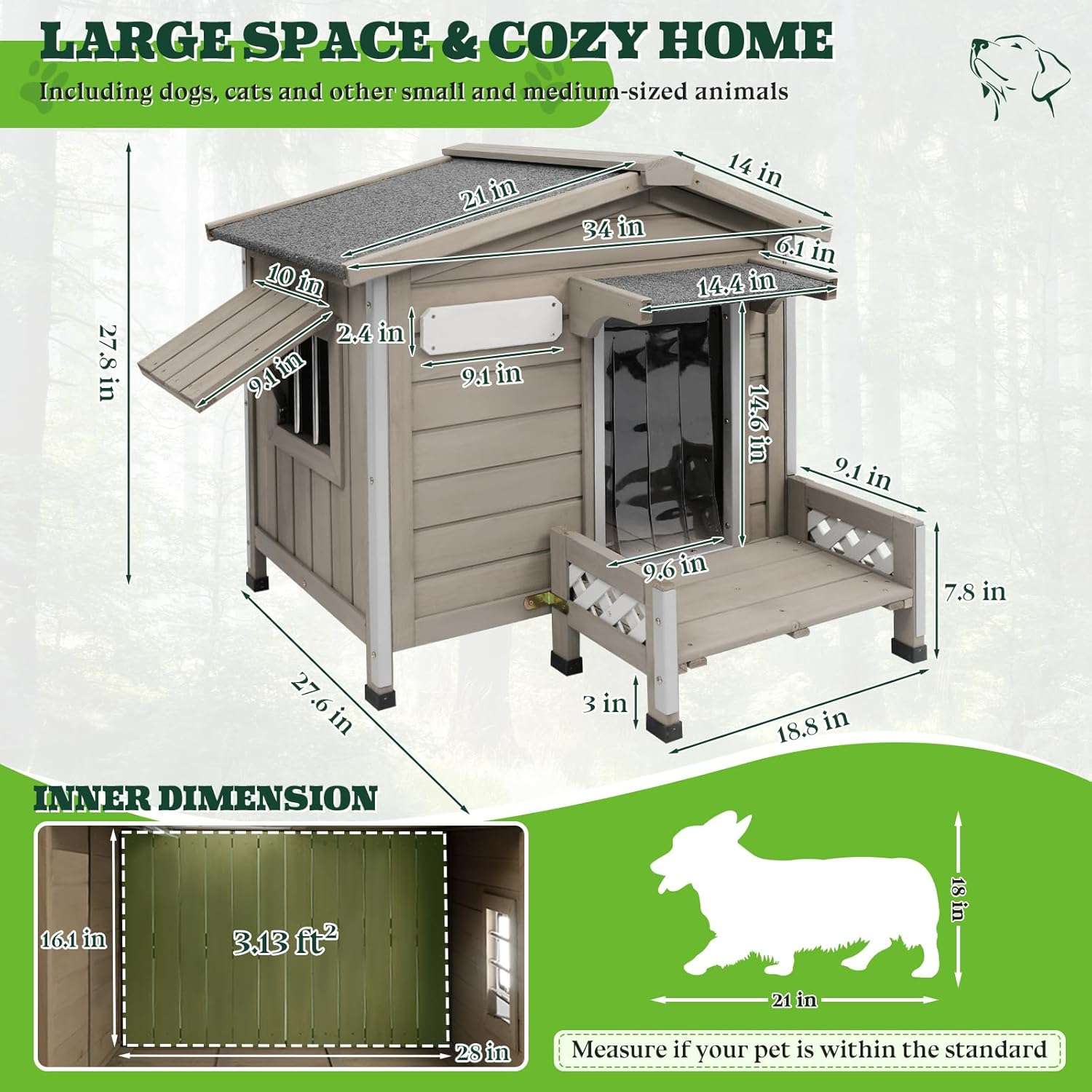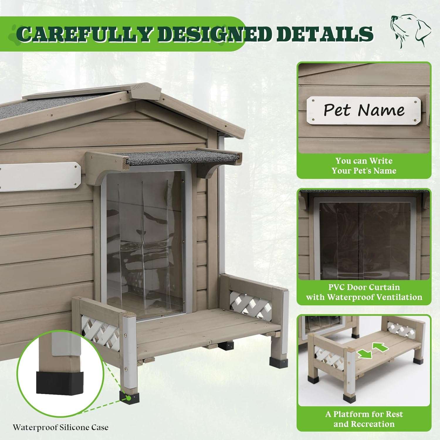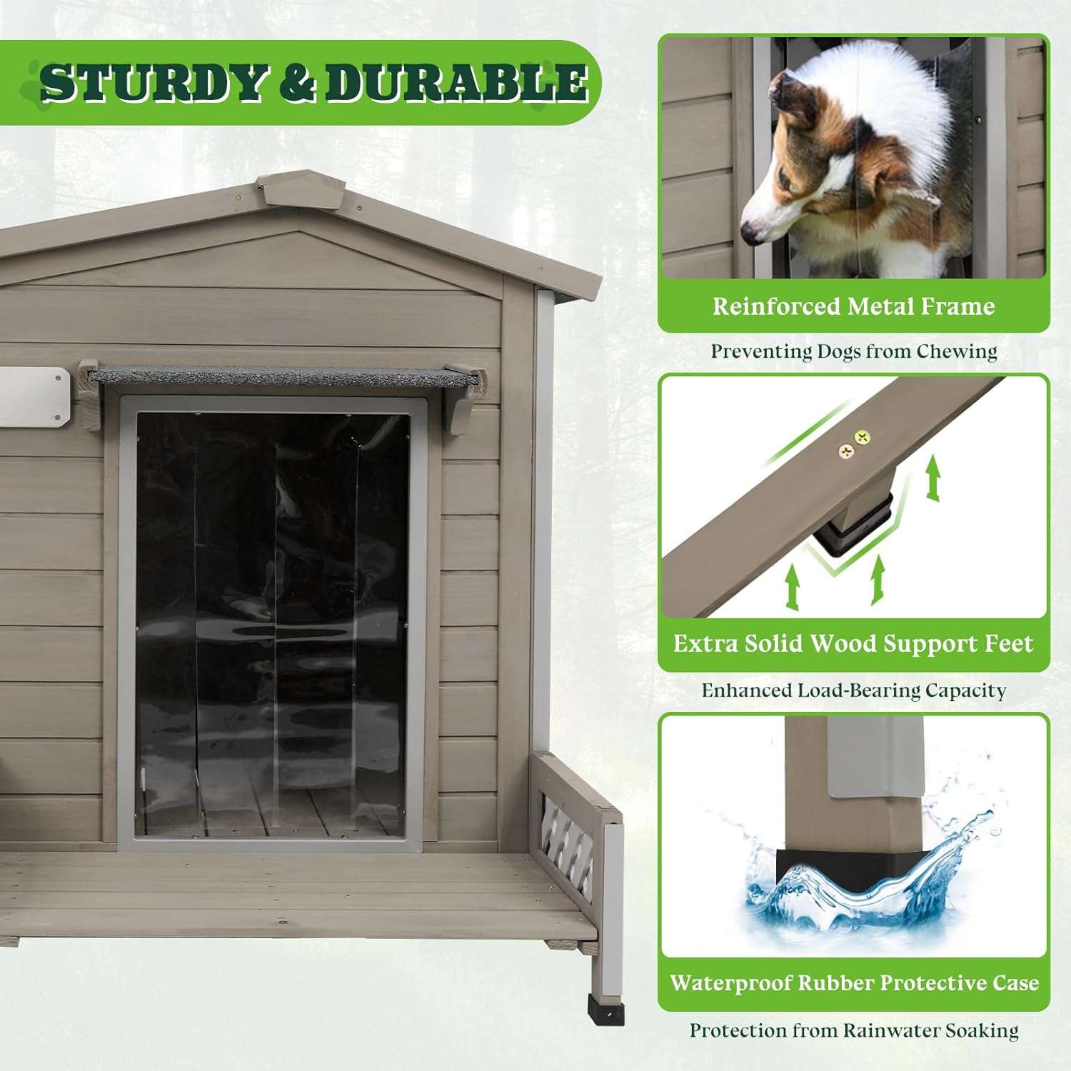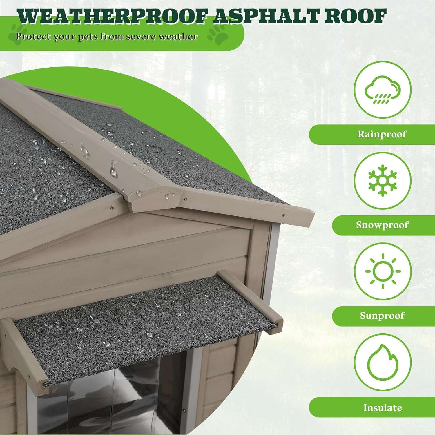 No teme a las inclemencias del mal tiempo ya que esta diseñada especificamente para el exterior Incluye madera de abeto con pintura impermeable un techo de asfalto altamente duradero una puerta de plastico protectora y soportes aislantes que mantienen a su mascota siempre seca y comoda durante cualquier estacion del año