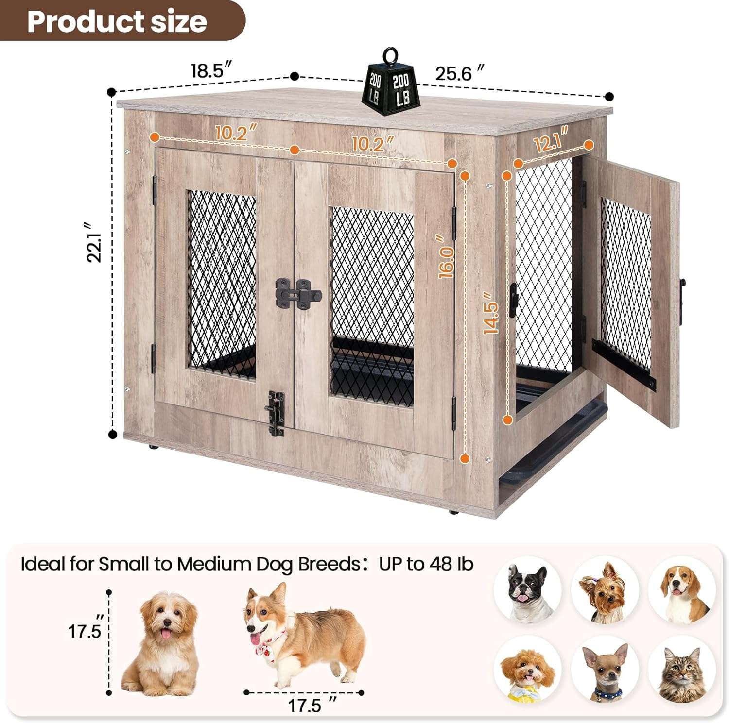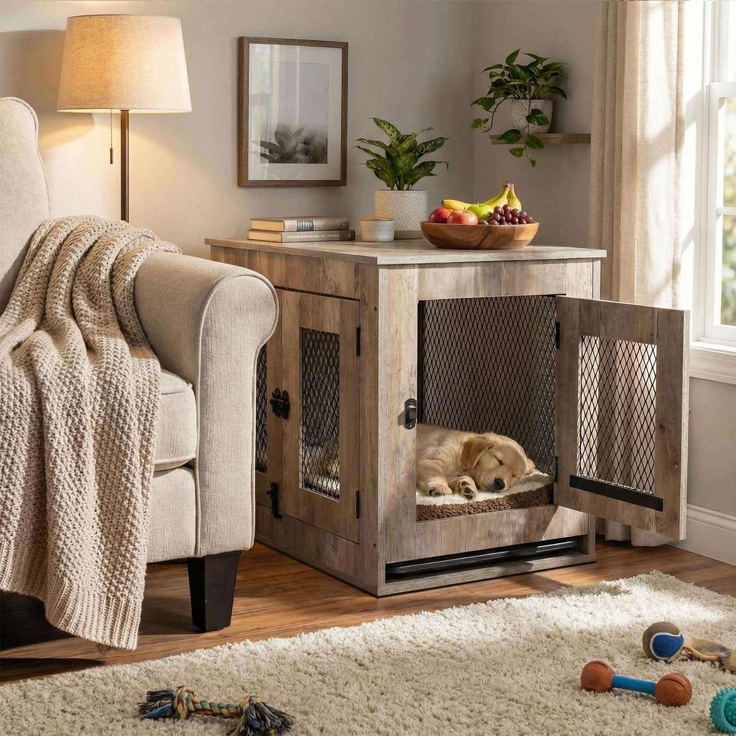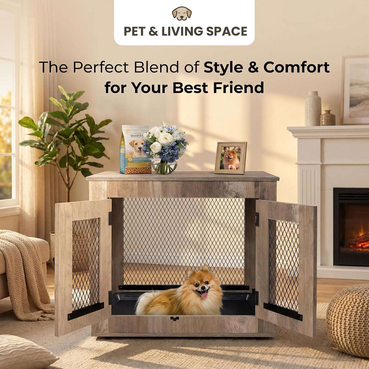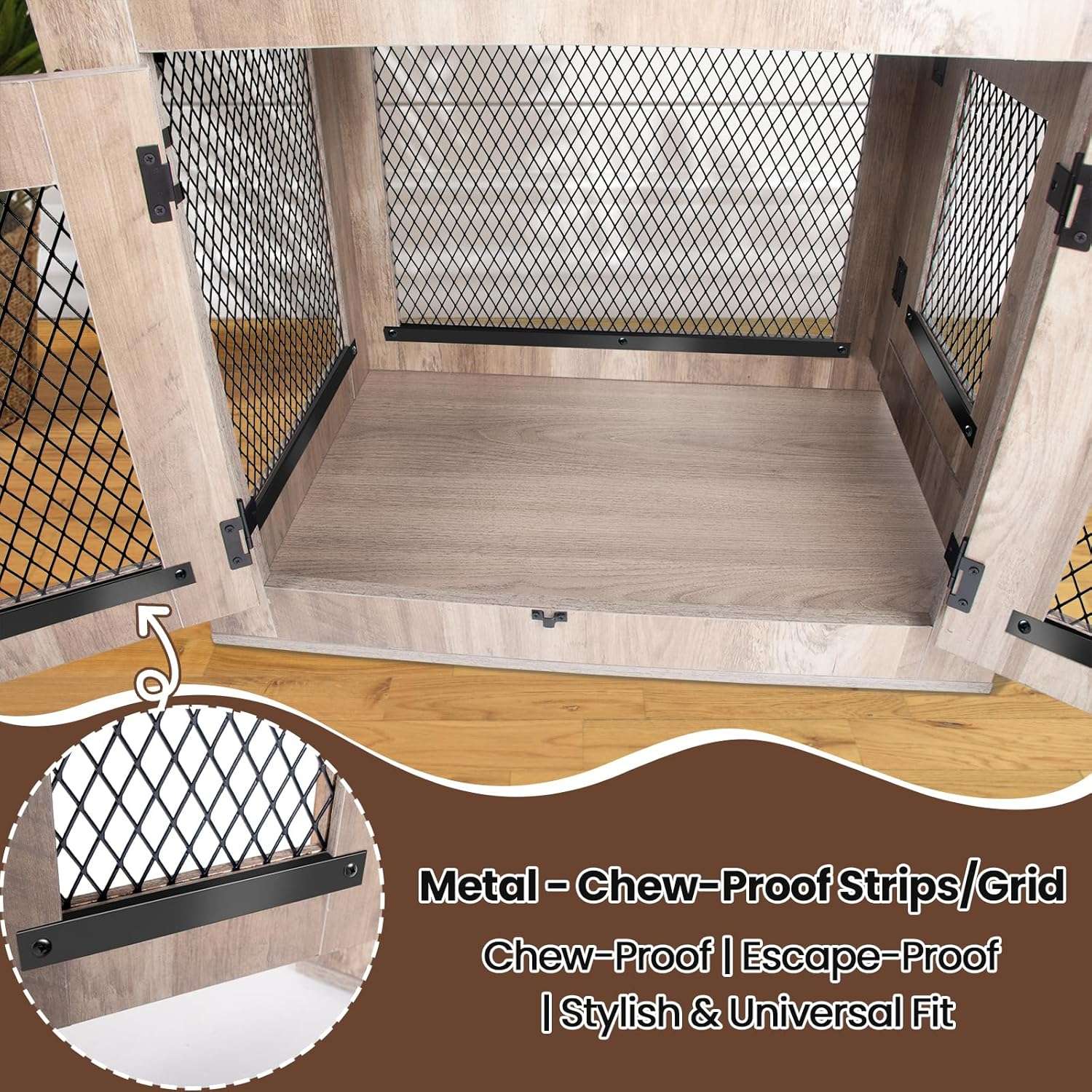 El avanzado diseño de ventilacion incluye paneles de malla metalica y puertas dobles con inserciones de rejilla decorativas que garantizan una excelente circulacion de aire y una visibilidad sin obstaculos protegiendo completamente la tranquilidad de su mascota en todo momento