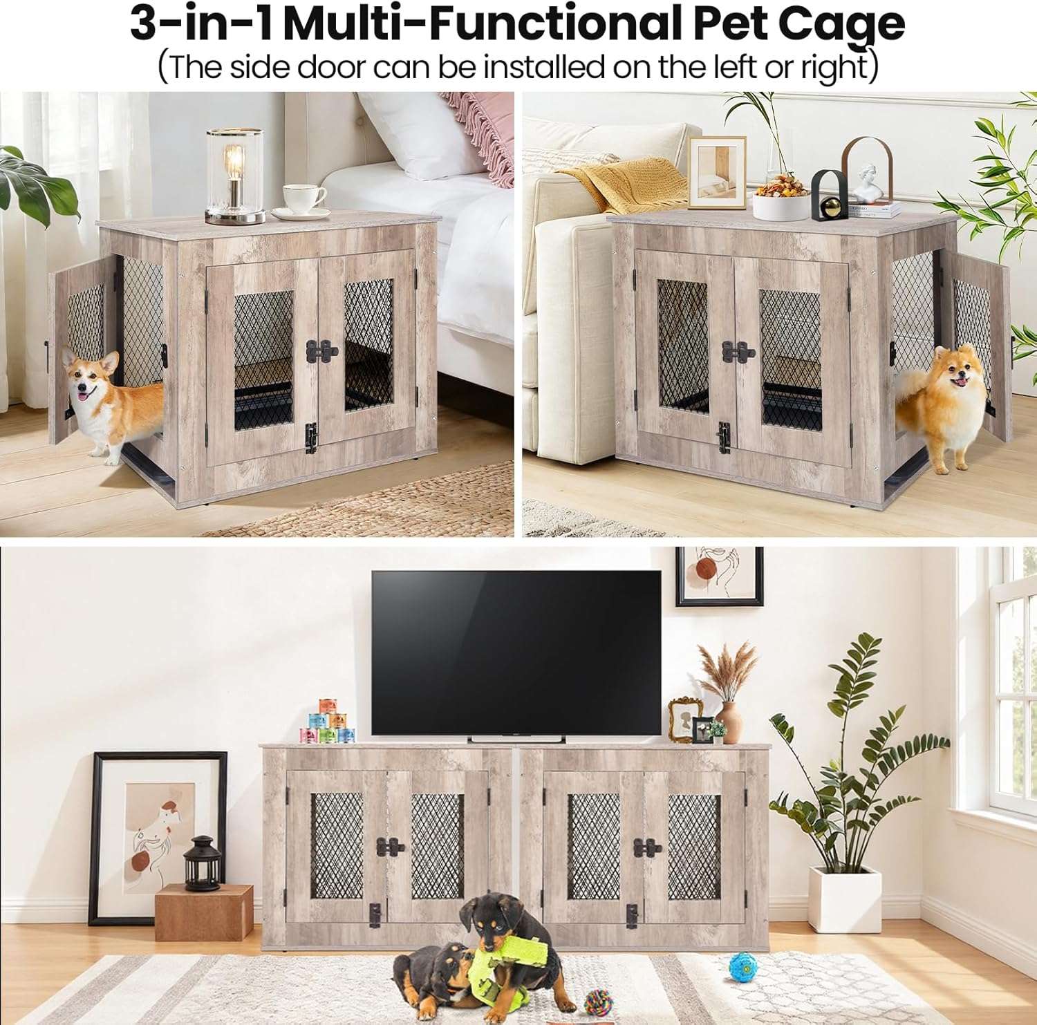 Fabricada con una construccion de madera resistente de color gris envejecido combinada con marcos de metal negro esta perrera ofrece una estructura segura y estable que asegura un uso duradero Su estilo rustico crea una estetica elegante que combina perfectamente con varios estilos de decoracion de interiores en salas de estar o dormitorios