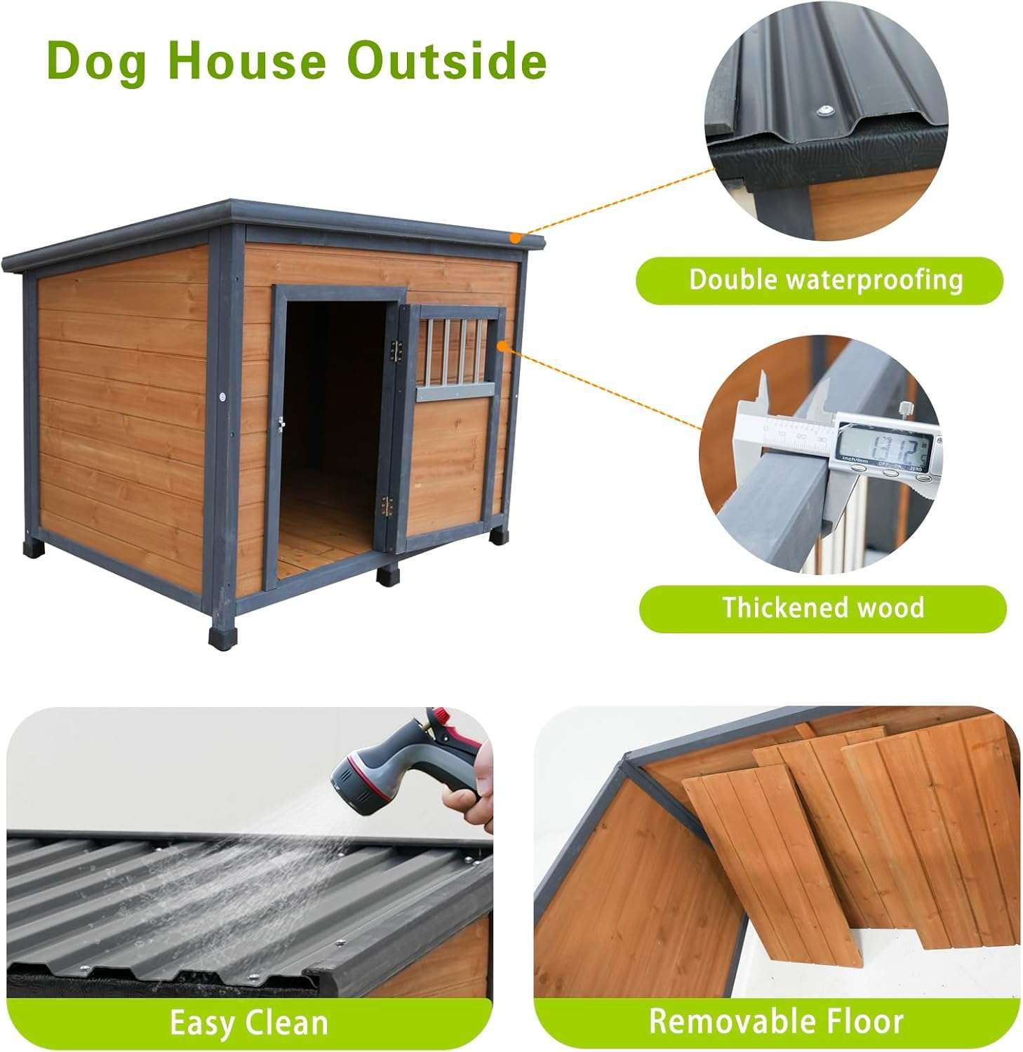 Pensando en su conveniencia esta estructura incluye un tablero inferior grueso que hace que la casa sea mucho mas resistente y duradera Este piso se puede quitar facilmente para lavarlo con agua asegurando una limpieza rapida y sin complicaciones siendo ideal para perros pequeños y medianos