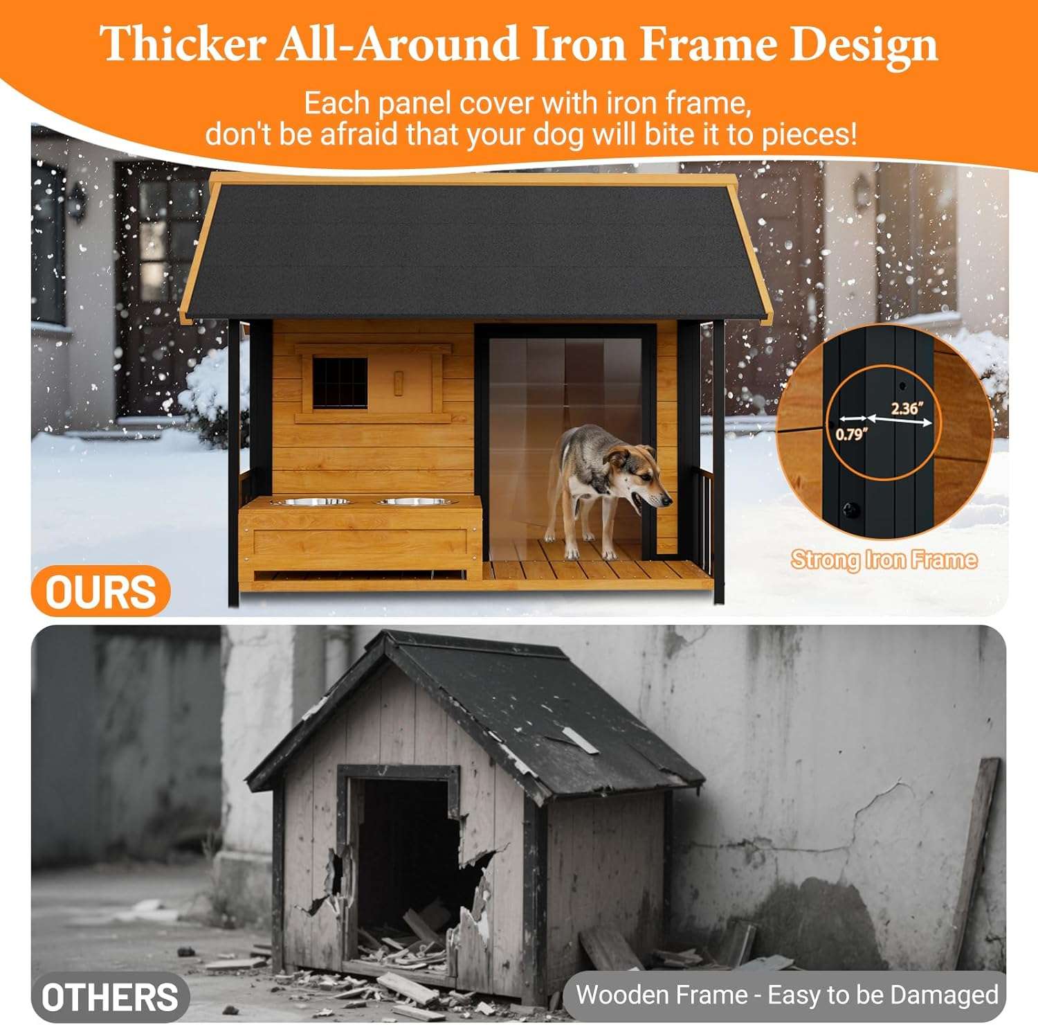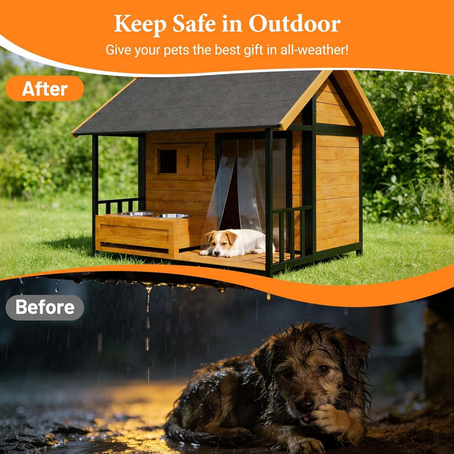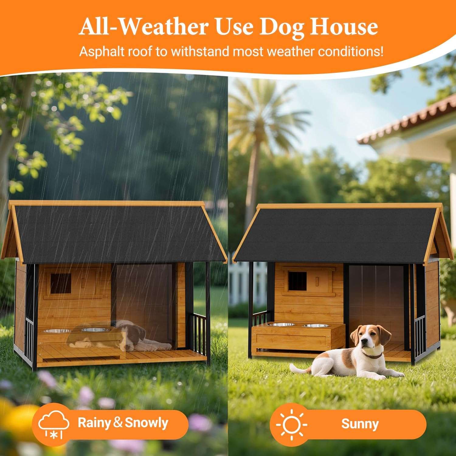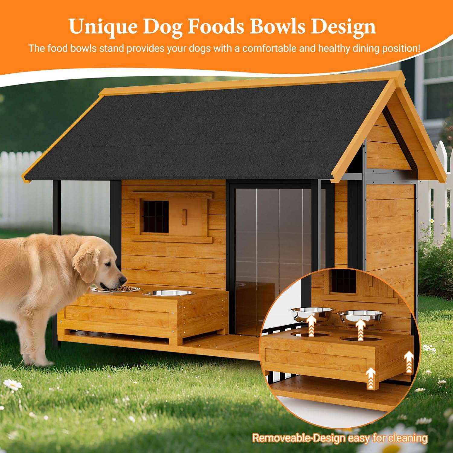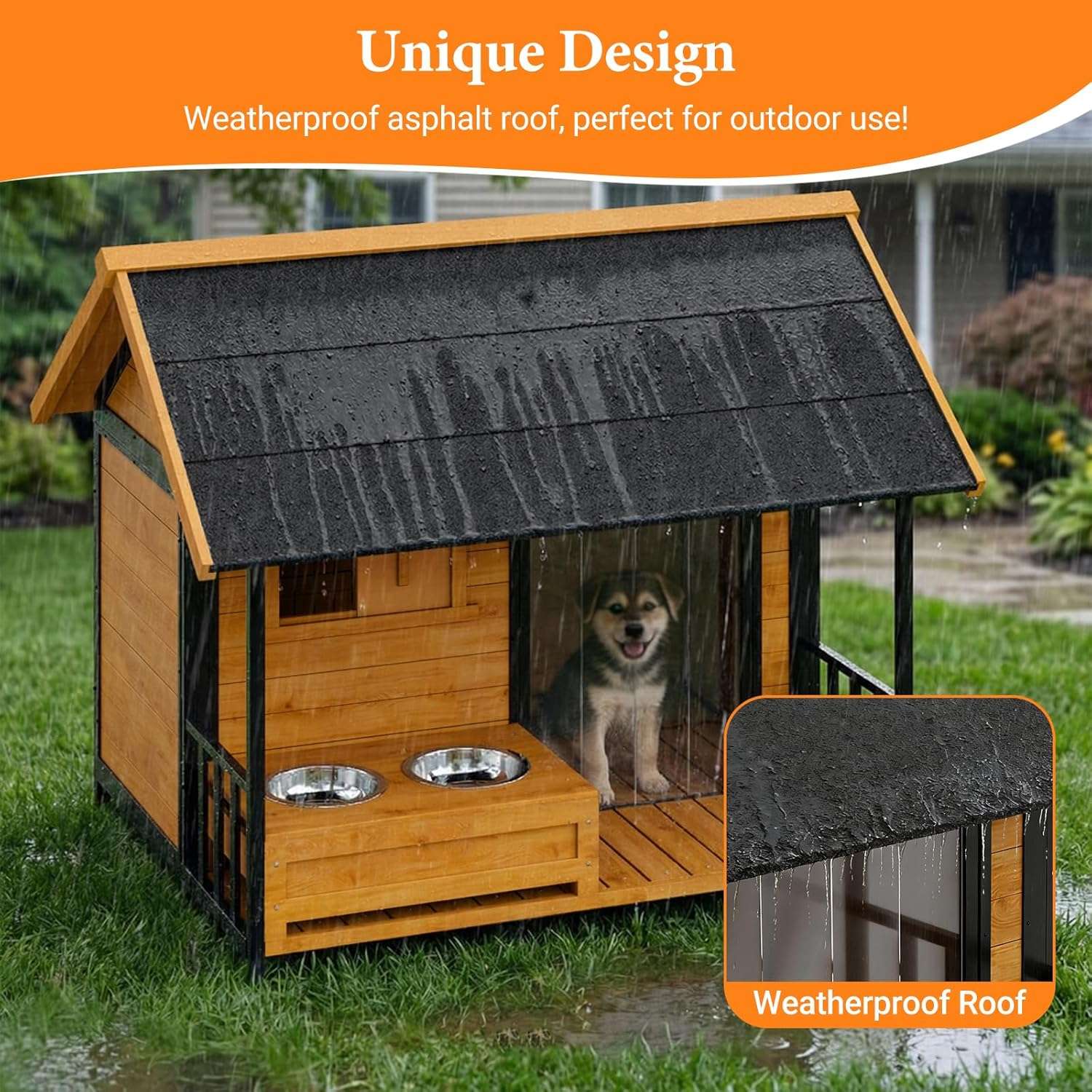 Este diseño exclusivo incorpora un practico soporte elevado con dos cuencos de acero inoxidable extraibles permitiendo una alimentacion conveniente y sin problemas directamente en la casa del perro Fabricada con madera natural y un techo de asfalto con barniz no toxico esta perrera es totalmente resistente a la intemperie protegiendo a su mascota del sol la lluvia y el viento en cualquier estacion del año