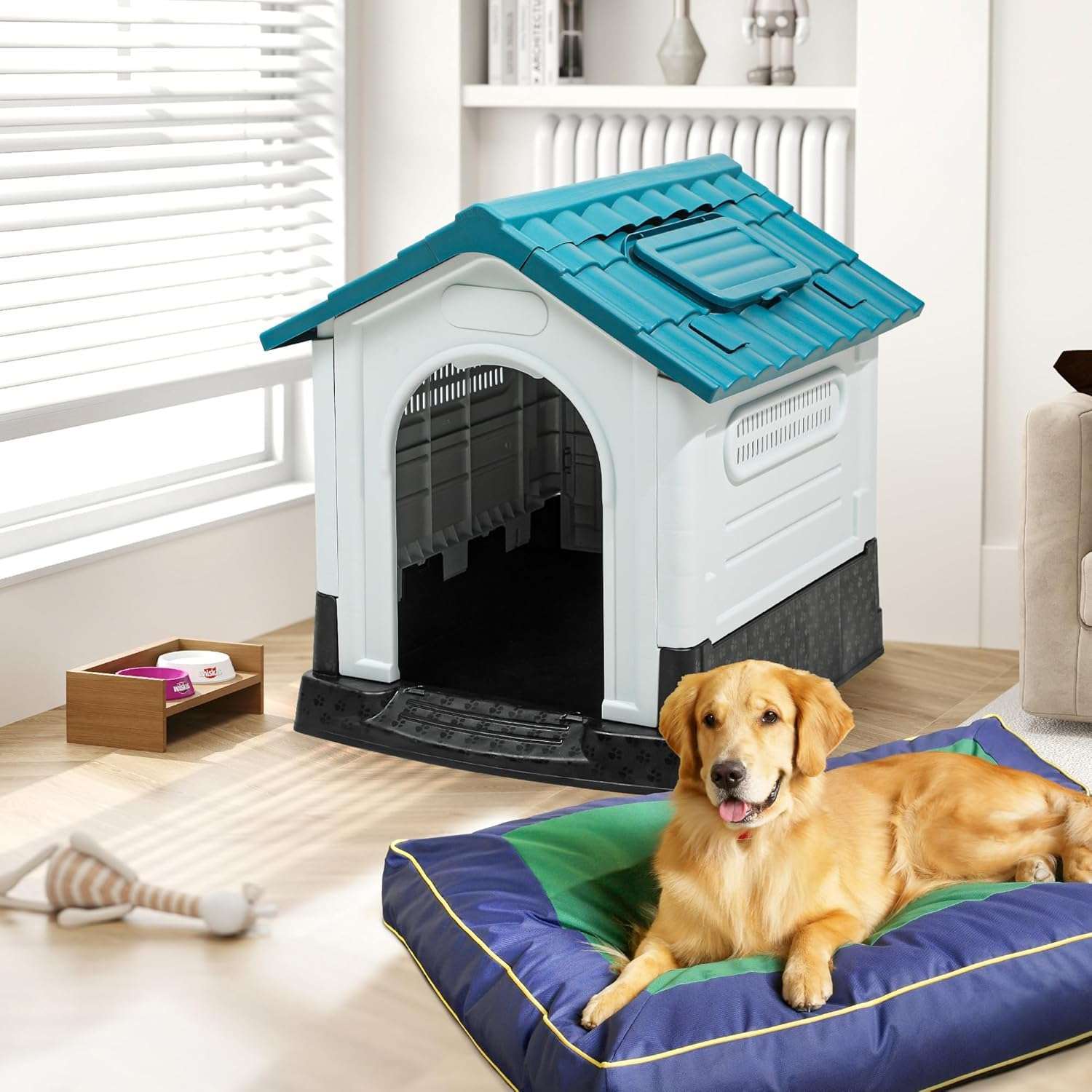Esta casa de plastico plegable para perros es la opcion mas versatil y buscada en Chile para quienes desean brindar un refugio sumamente comodo a sus mascotas Su estructura cuenta con dimensiones exactas de 105 centimetros de largo 88 centimetros de ancho y 99 centimetros de alto proporcionando un espacio amplio ideal para perros grandes como border collies o shiba inus Ademas cuenta con una gran puerta de 60 centimetros de ancho por 40 centimetros de alto garantizando un acceso facil y sin restricciones para su amigo peludo