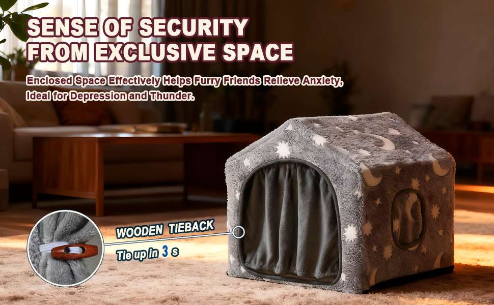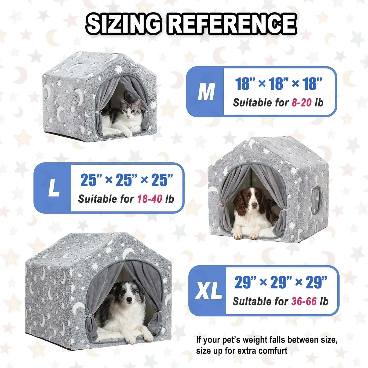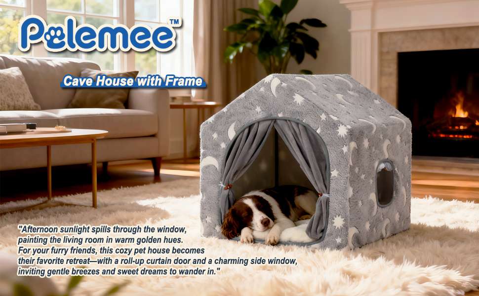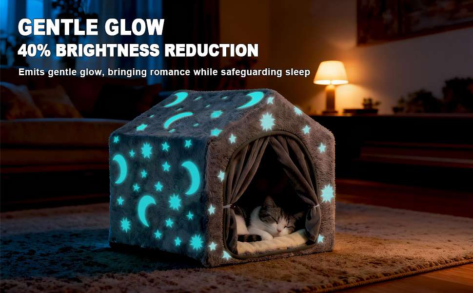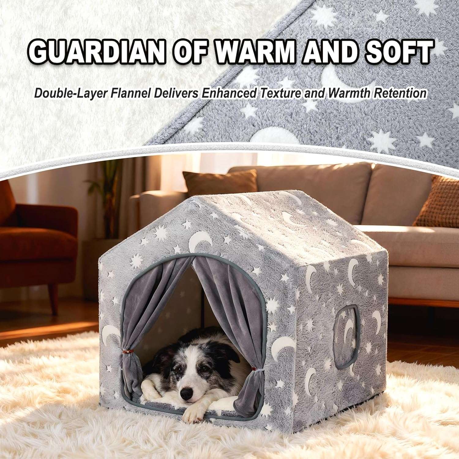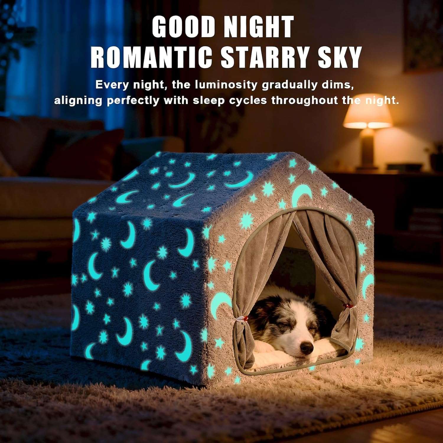Dale a tu mascota un espacio mágico, seguro y súper cómodo dentro de tu hogar. Esta innovadora casa tipo tienda de campaña está diseñada para entregar privacidad, comodidad térmica y un encanto único gracias a su tela que brilla en la oscuridad. Es el refugio perfecto para que tu mejor amigo descanse plácidamente en cualquier época del año.